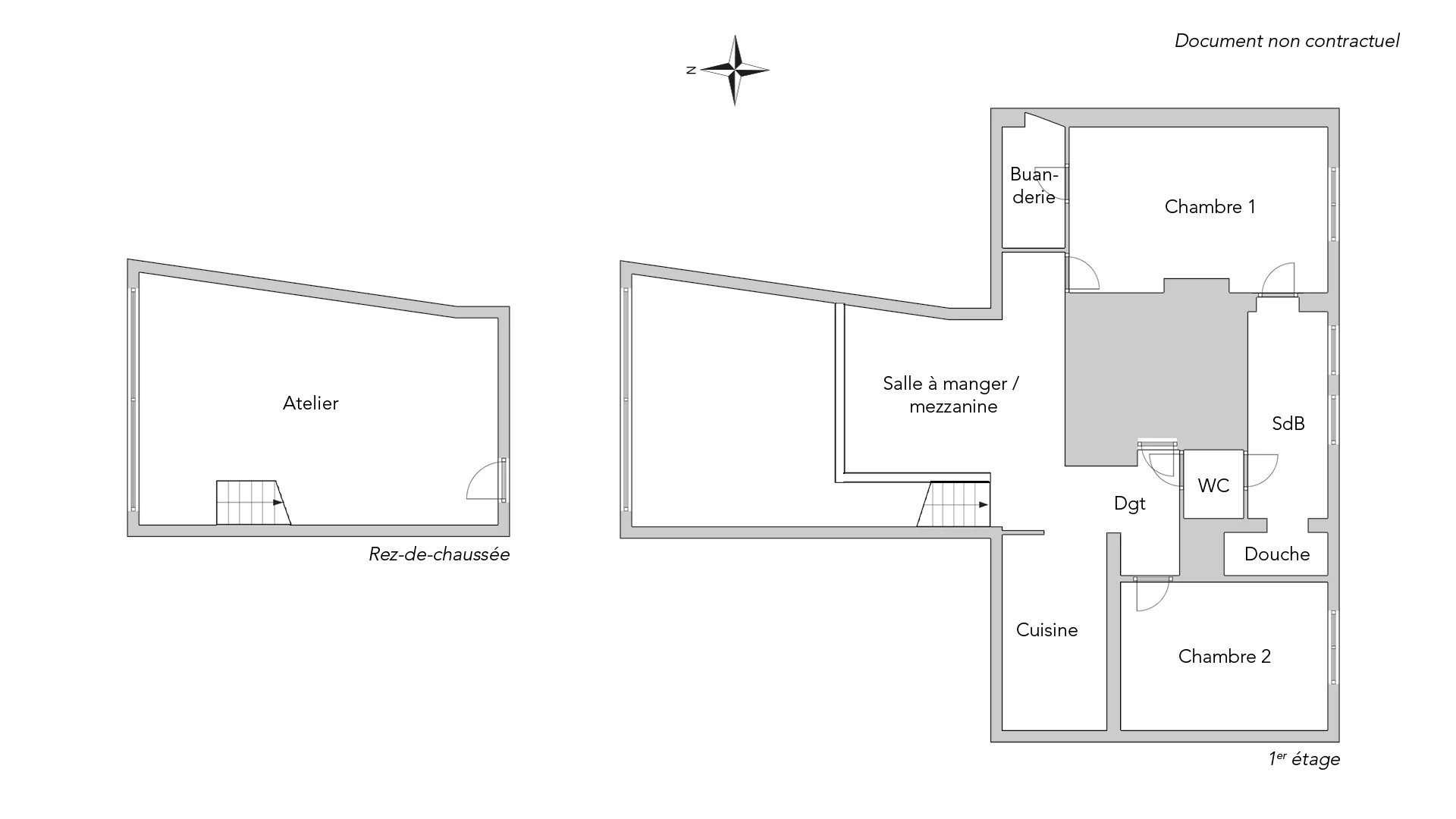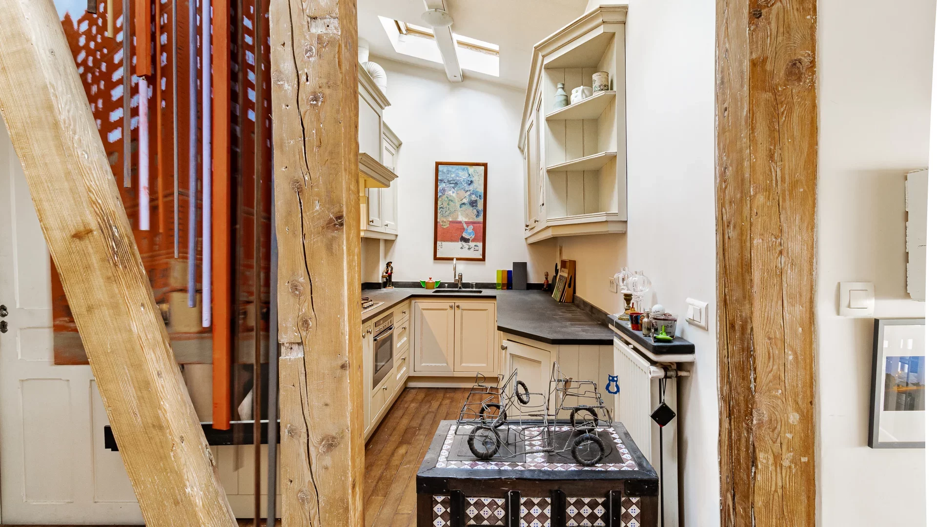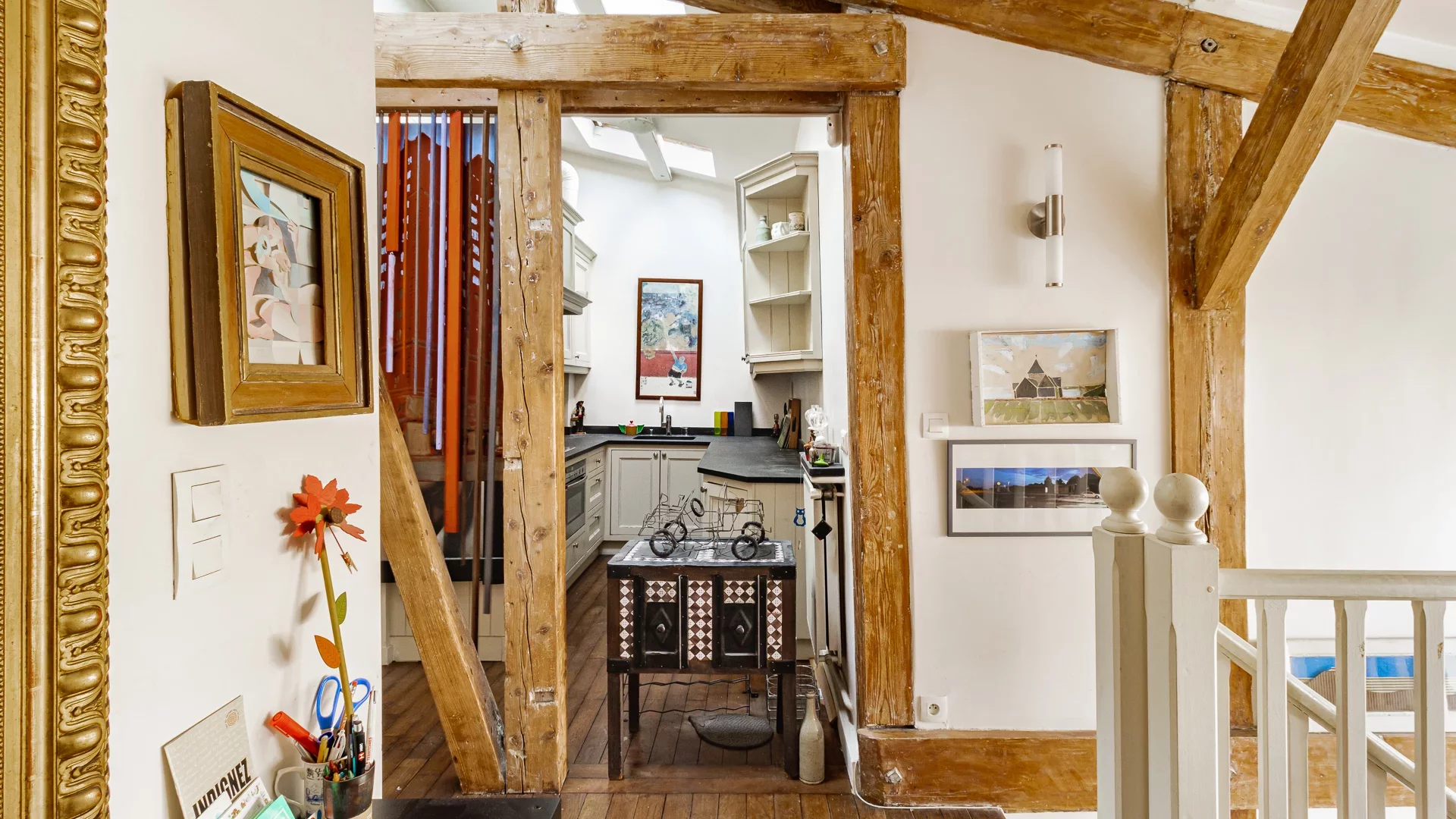 À l’étage, une cuisine semi-ouverte prolonge une salle à manger en mezzanine dominant le salon, créant un jeu de perspectives remarquable. Deux chambres au calme, une salle de bains avec baignoire et douche, ainsi que des toilettes indépendantes complètent ce niveau.