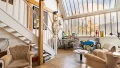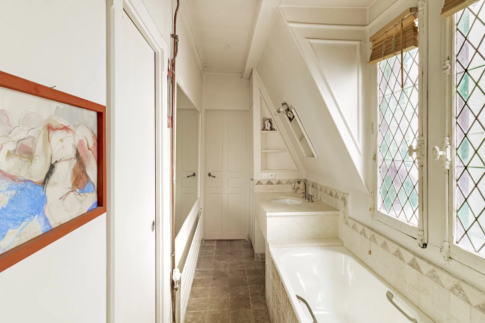 Au rez-de-cour, un vaste espace de réception s’ouvre sur une somptueuse verrière d’atelier, offrant un panorama verdoyant et une quiétude rare en plein cœur de la capitale.