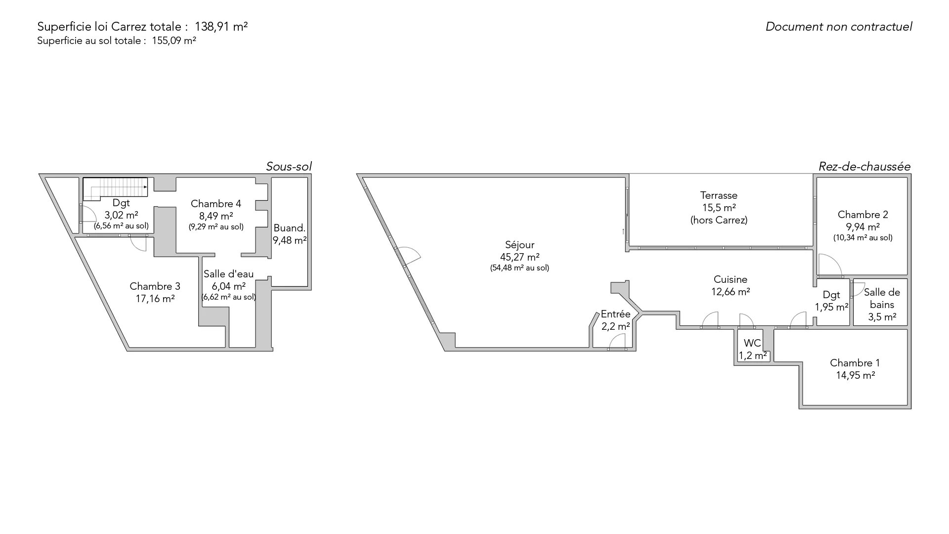 D'une surface totale de 155m² au sol et 138,91m² loi Carrez il comprend au rez-de-chaussée un très grande pièce de vie dotée de beaux volumes avec sa cuisine équipée et sa verrière le tout donnant sur une belle terrasse de 15,5m², deux chambres au calme sur cour, une salle de bains ainsi que des toilettes séparées.