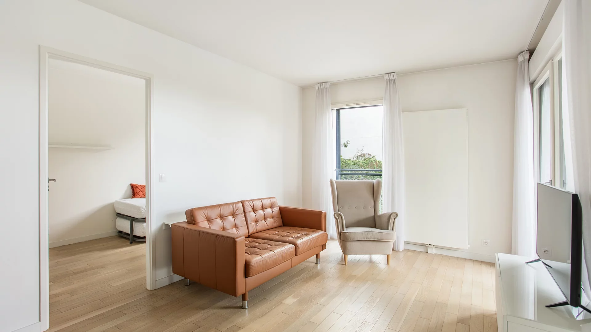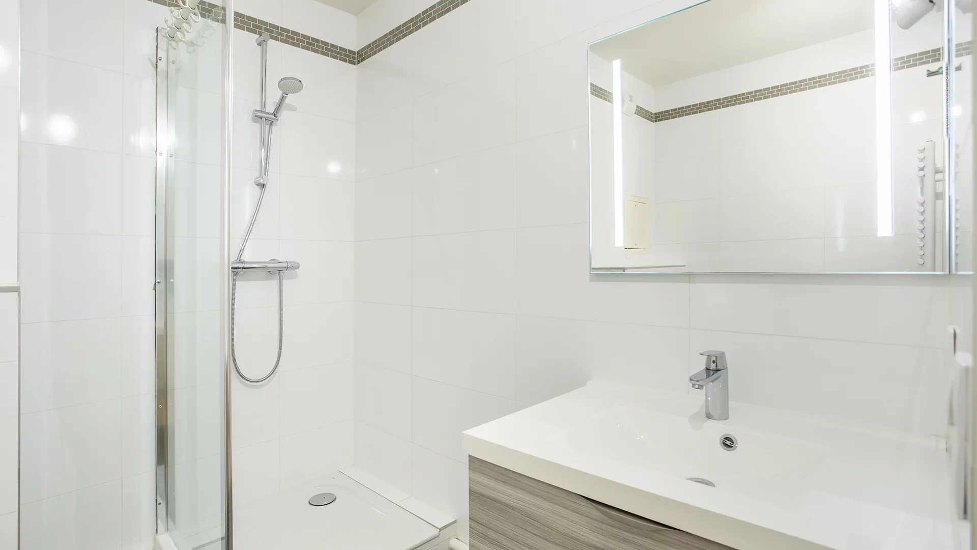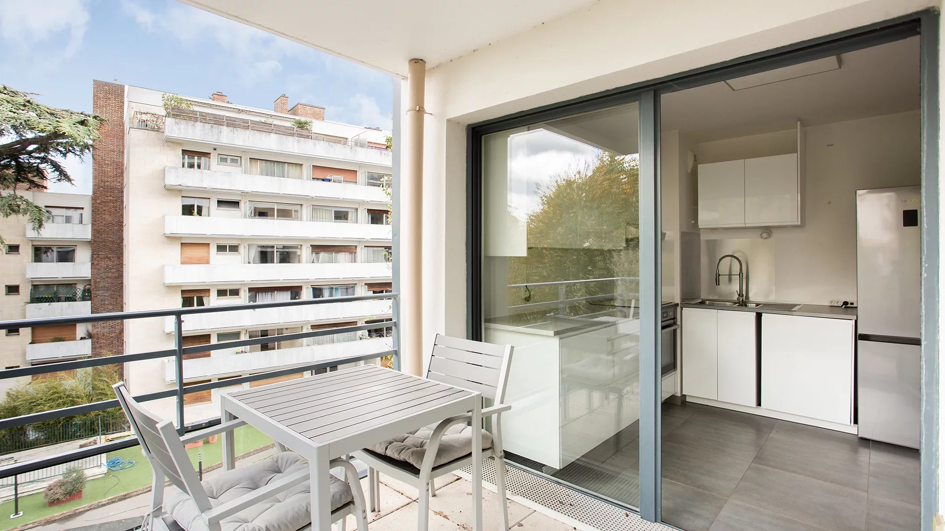 L’appartement se compose d’une vaste entrée avec rangements, d’un séjour baigné de lumière ouvrant sur une terrasse de 10m² avec vue dégagée sur le jardin, ainsi que d’une cuisine ouverte entièrement équipée.