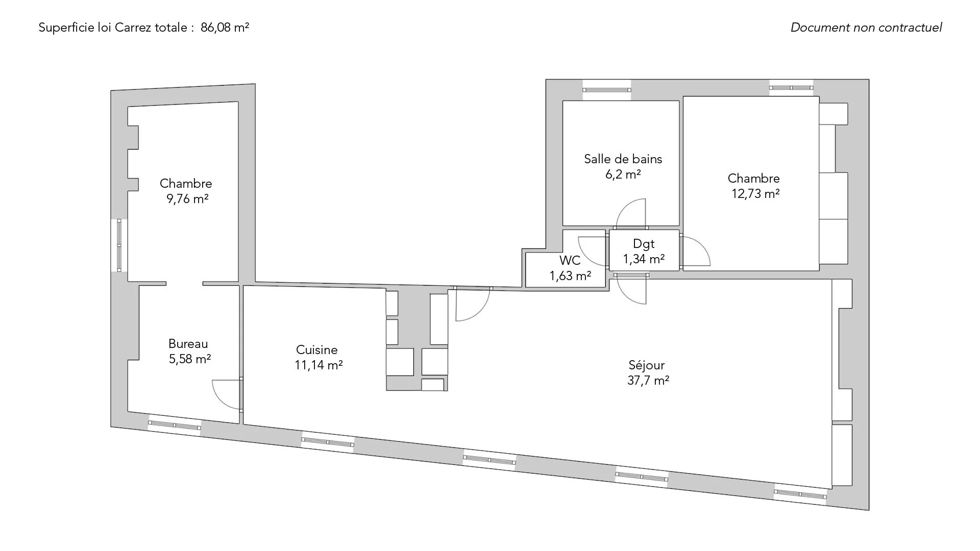 Idéalement situé à proximité des commerces, des transports et du canal Saint-Martin, cet appartement traversant de 86,08m² loi Carrez, situé au troisième étage d’un immeuble par escalier, offre un agencement optimal et une belle luminosité.