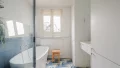 La salle de bains, spacieuse et fonctionnelle, dispose d’une baignoire, d’une douche et d’une fenêtre. Les toilettes sont séparées.