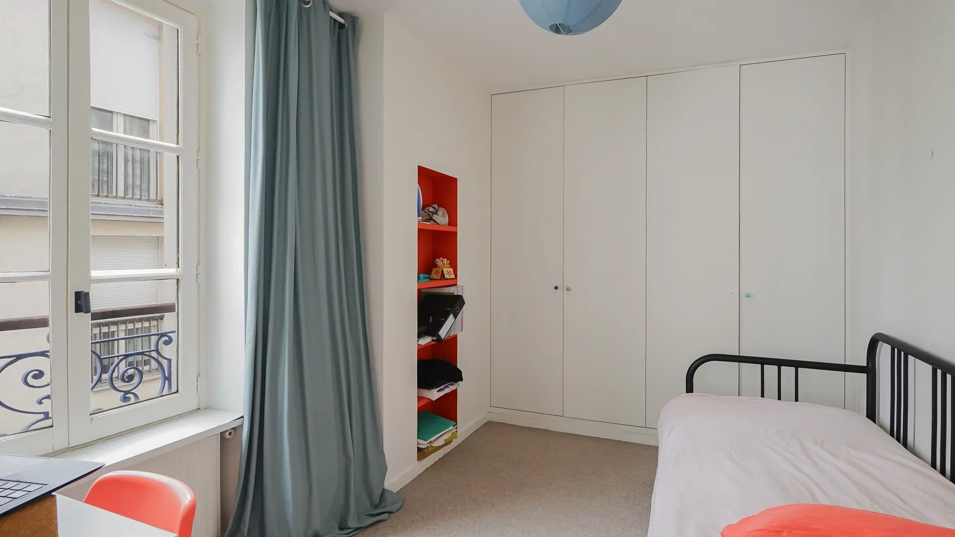 L’espace nuit comprend une grande chambre sur cour avec vue dégagée et des nombreux rangements, une deuxième chambre avec des placards intégrés, accessible depuis un bureau lumineux.