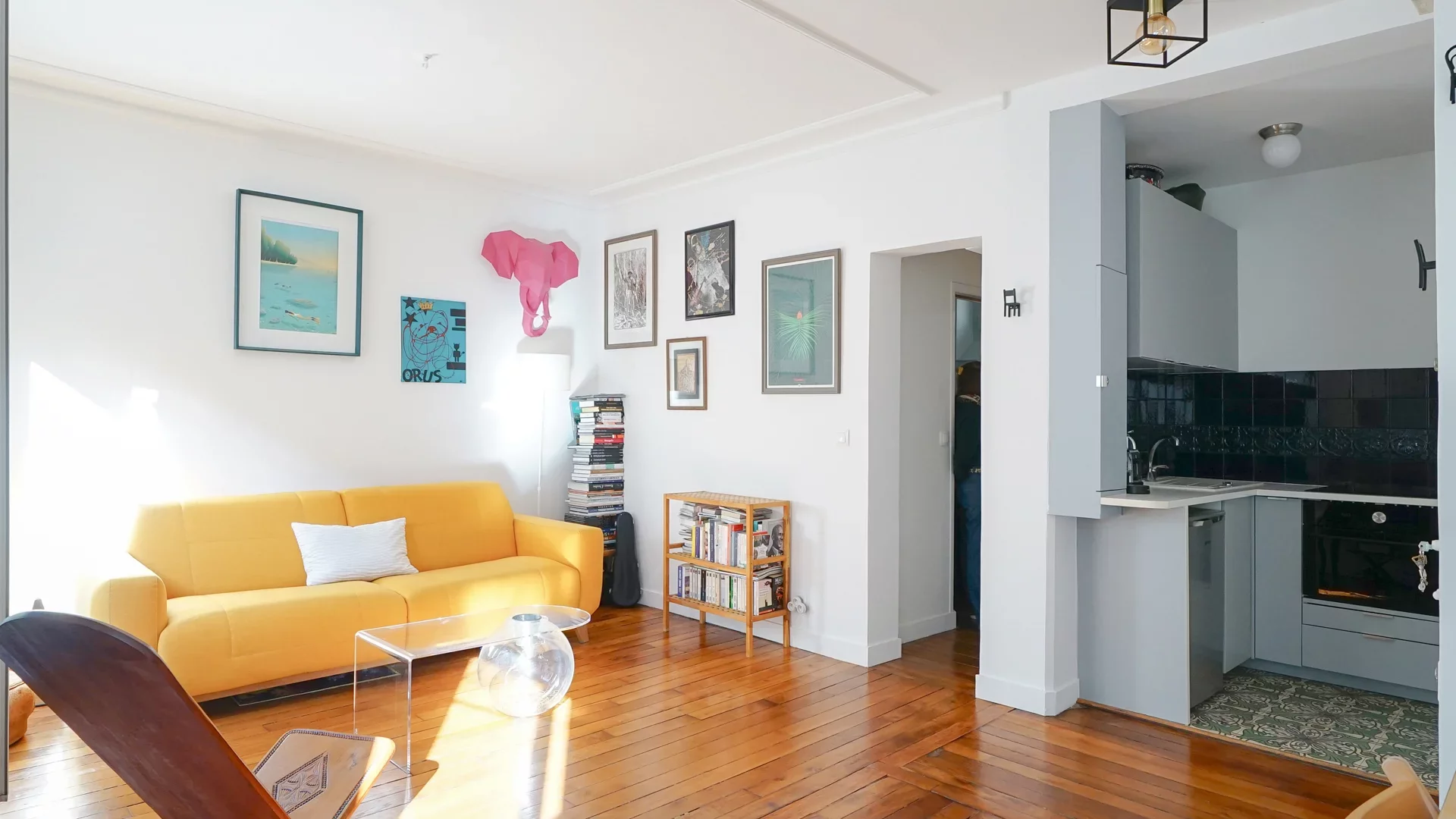 Situé au cinquième étage par escalier d'un immeuble très bien tenu avec gardien. Charme parisien : parquet d'origine, grandes fenêtres, hauteur sous plafond. Ce bien se compose d'une entrée, un double séjour, une cuisine ouverte équipée, une chambre avec rangement et une salle de douche avec toilettes.