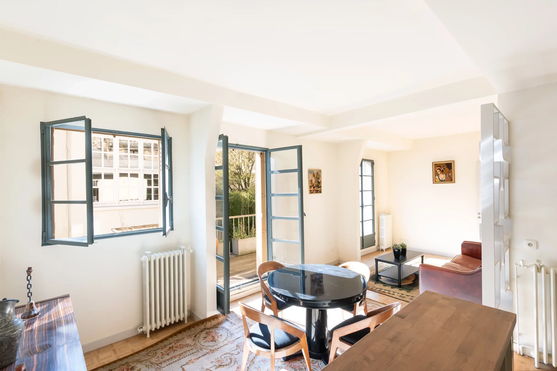 Au premier étage, un séjour aux volumes remarquables, sublimé par une hauteur sous plafond exceptionnelle de 3,80m, avec cuisine ouverte et vue dégagée sur l’avenue Junot et ses arbres. Côté cour, une chambre avec sa salle de bains attenante, rangements et toilettes.