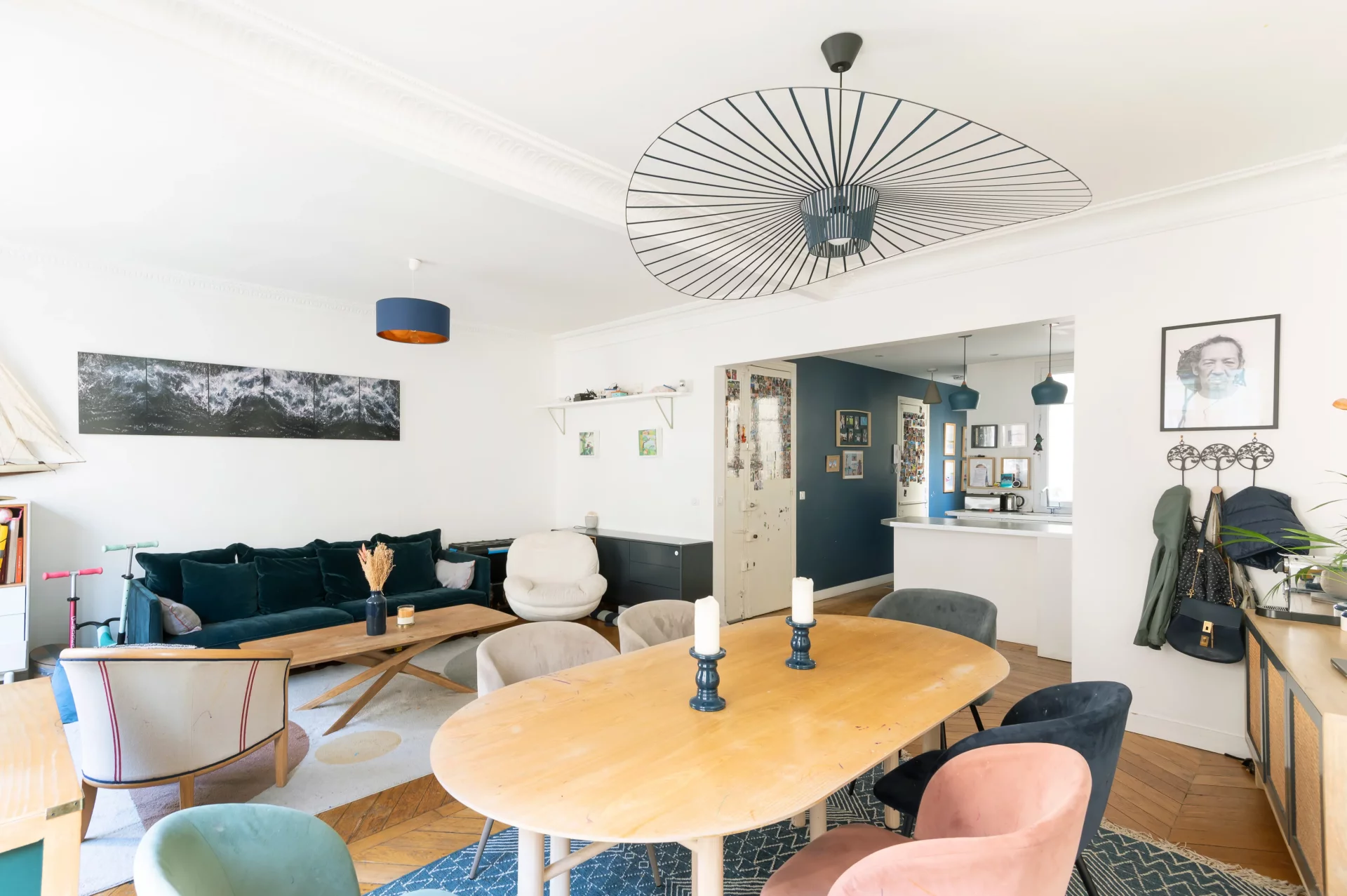 Cet appartement traversant, très lumineux, possède : une entrée, un vaste double séjour avec cuisine ouverte, deux chambres au calme sur cour, et des toilettes séparées.