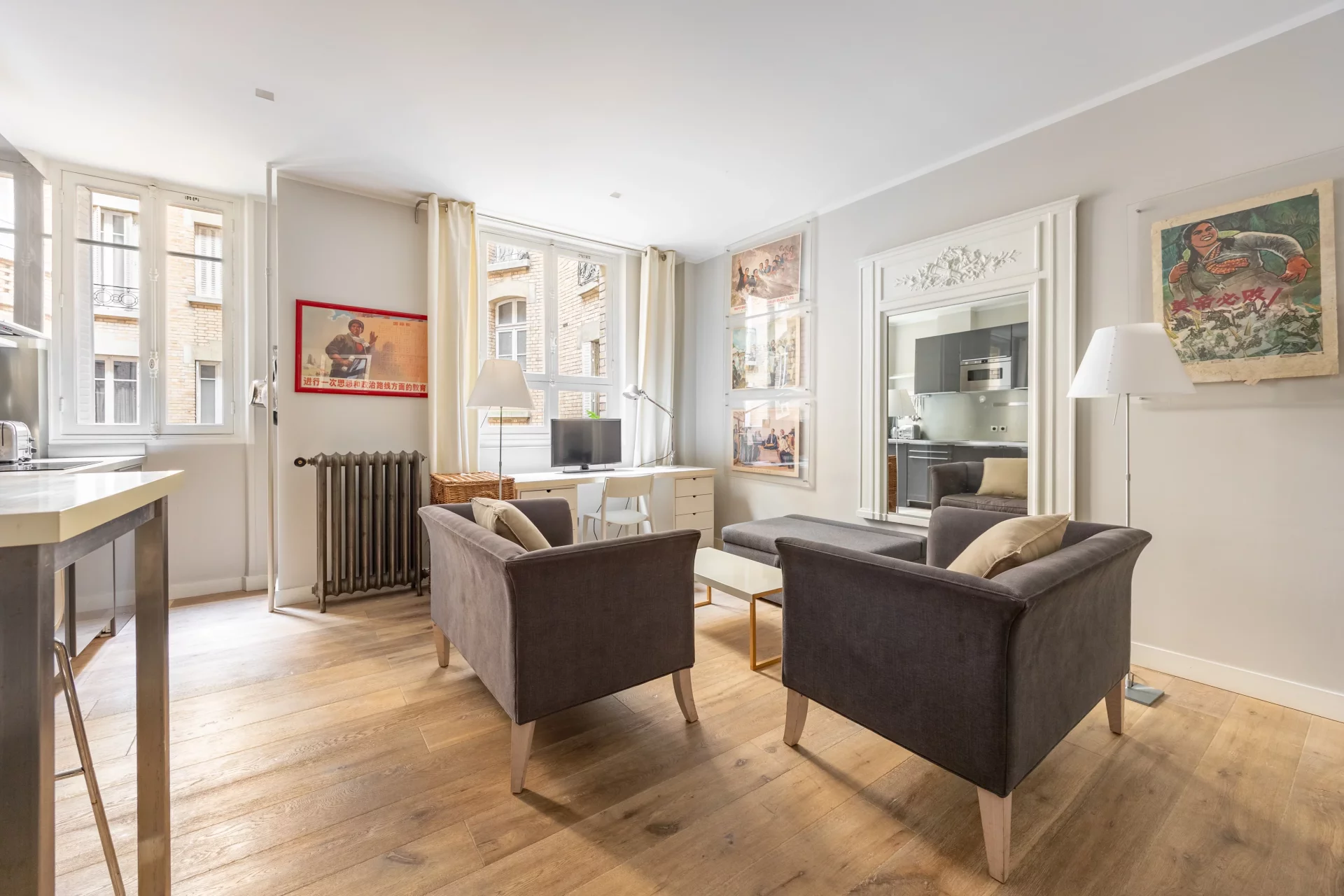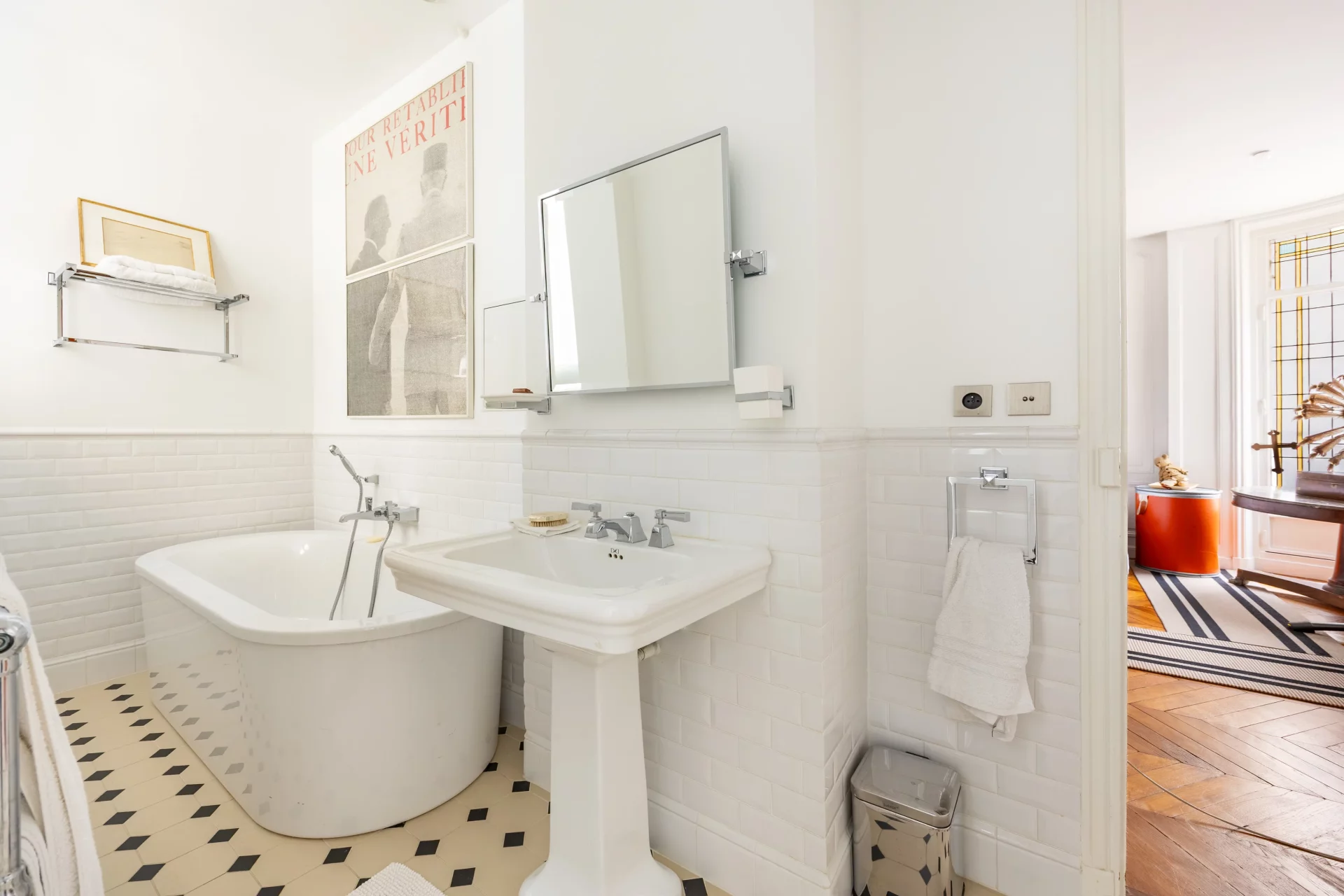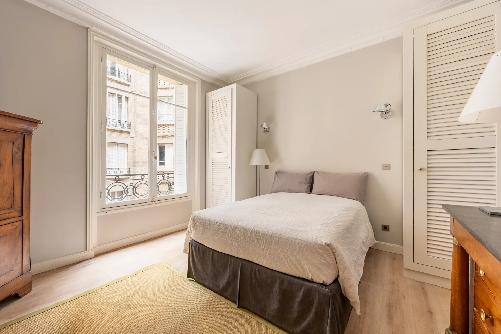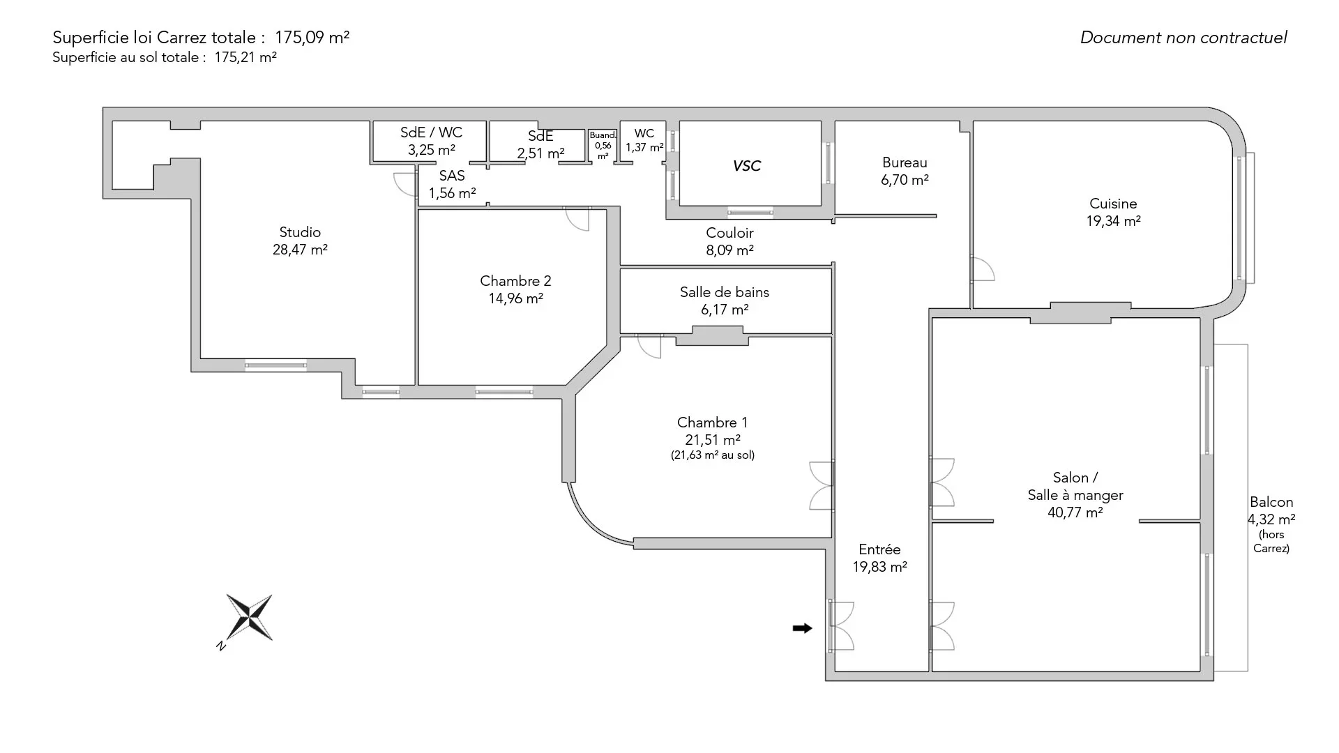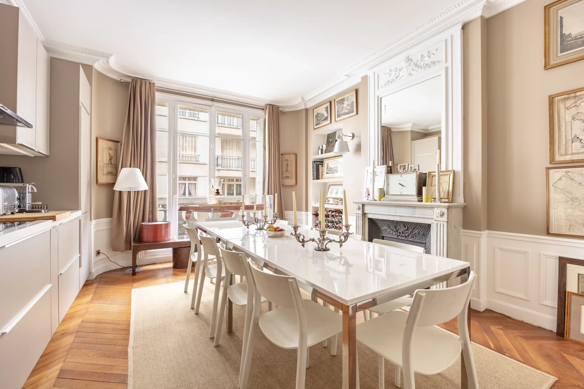 En très bon état, fruit de rénovation de grandes qualités alliées au charme de l'ancien (parquet, moulures, cheminées), le plan offre une entrée accueillante, un double séjour avec de très beaux volumes donnant sur deux balcons exposés ouest, un grand bureau, une chambre en suite avec sa salle de bain, une cuisine - salle à manger indépendante, une deuxième chambre avec sa salle de douche, des toilettes séparées et une buanderie.