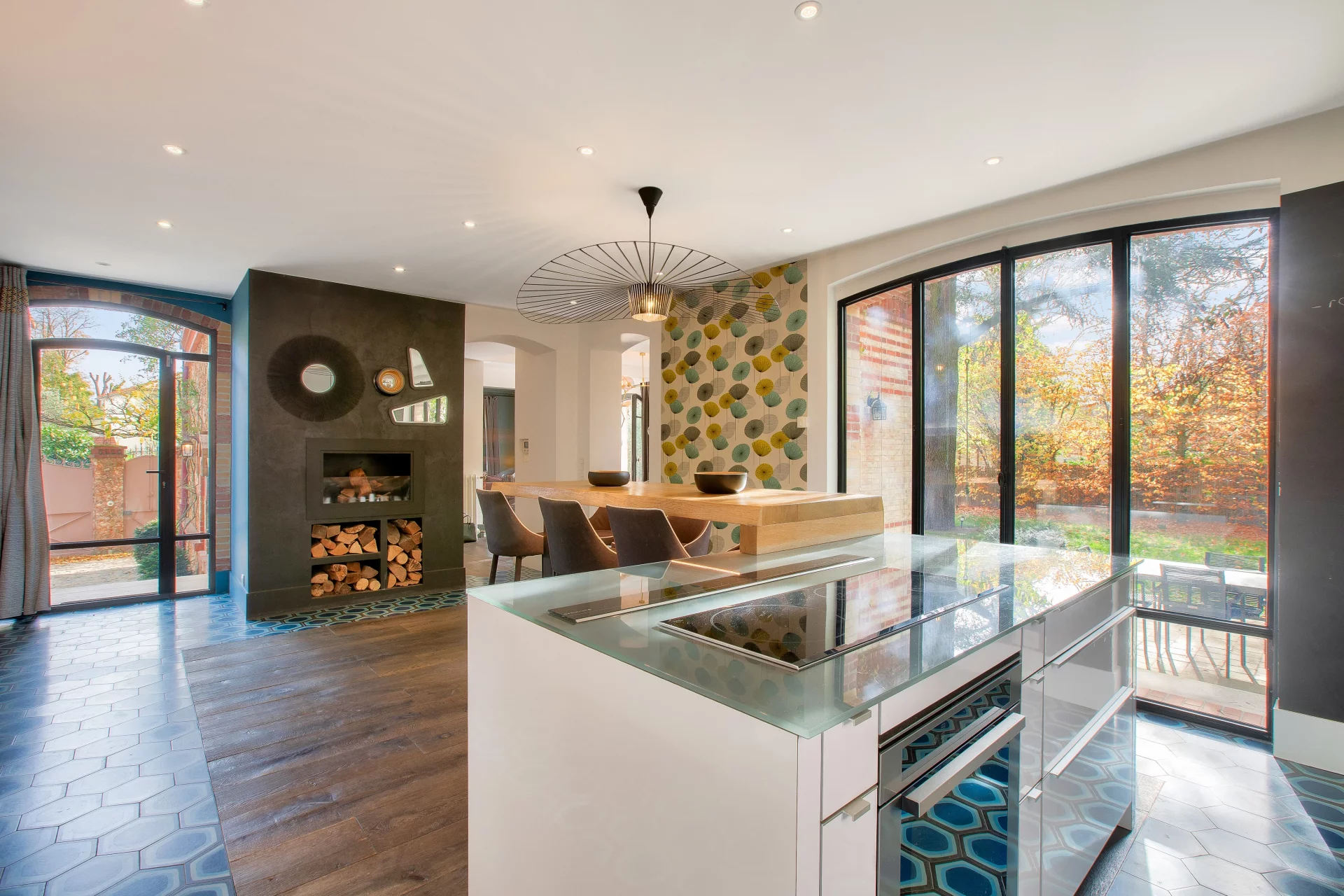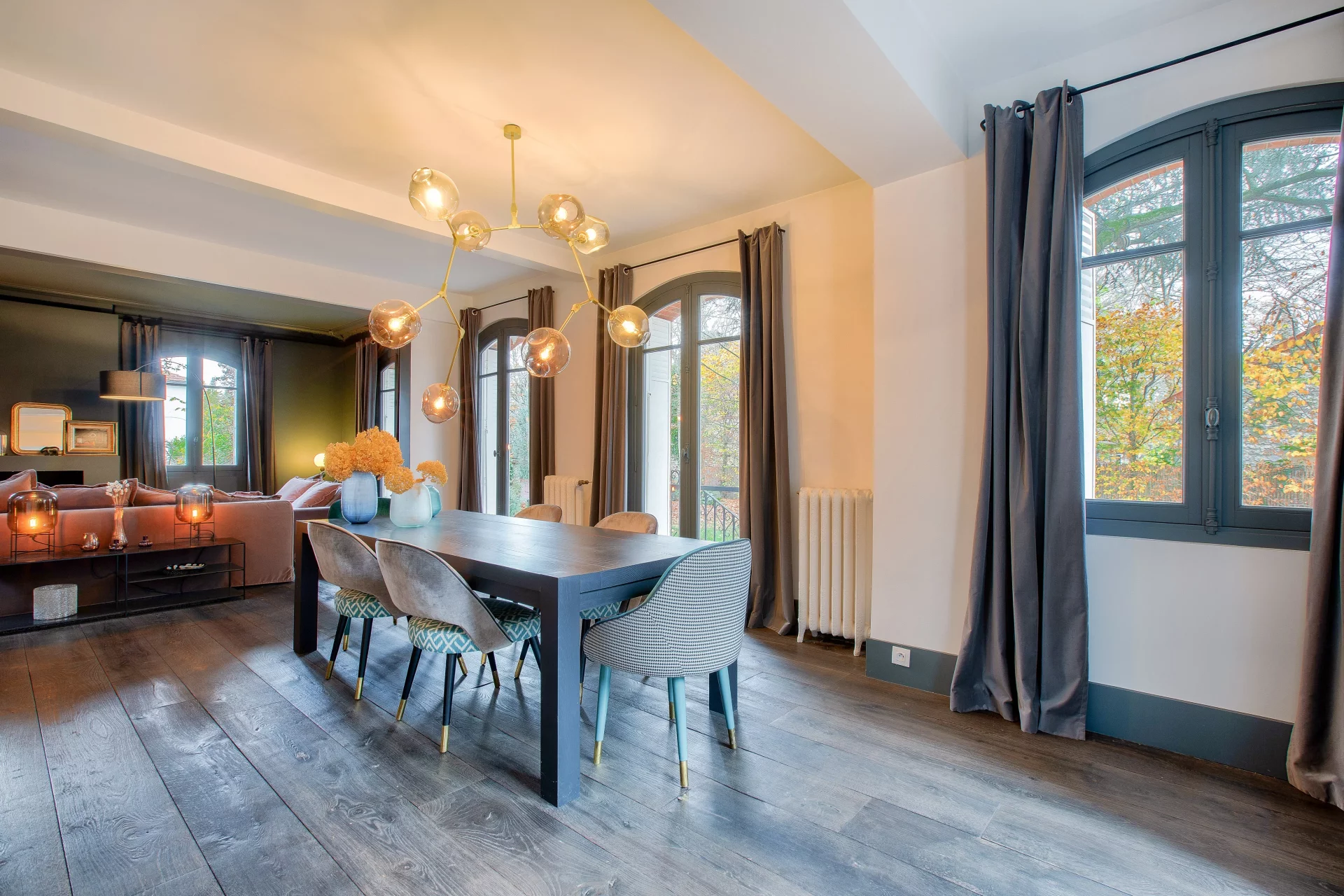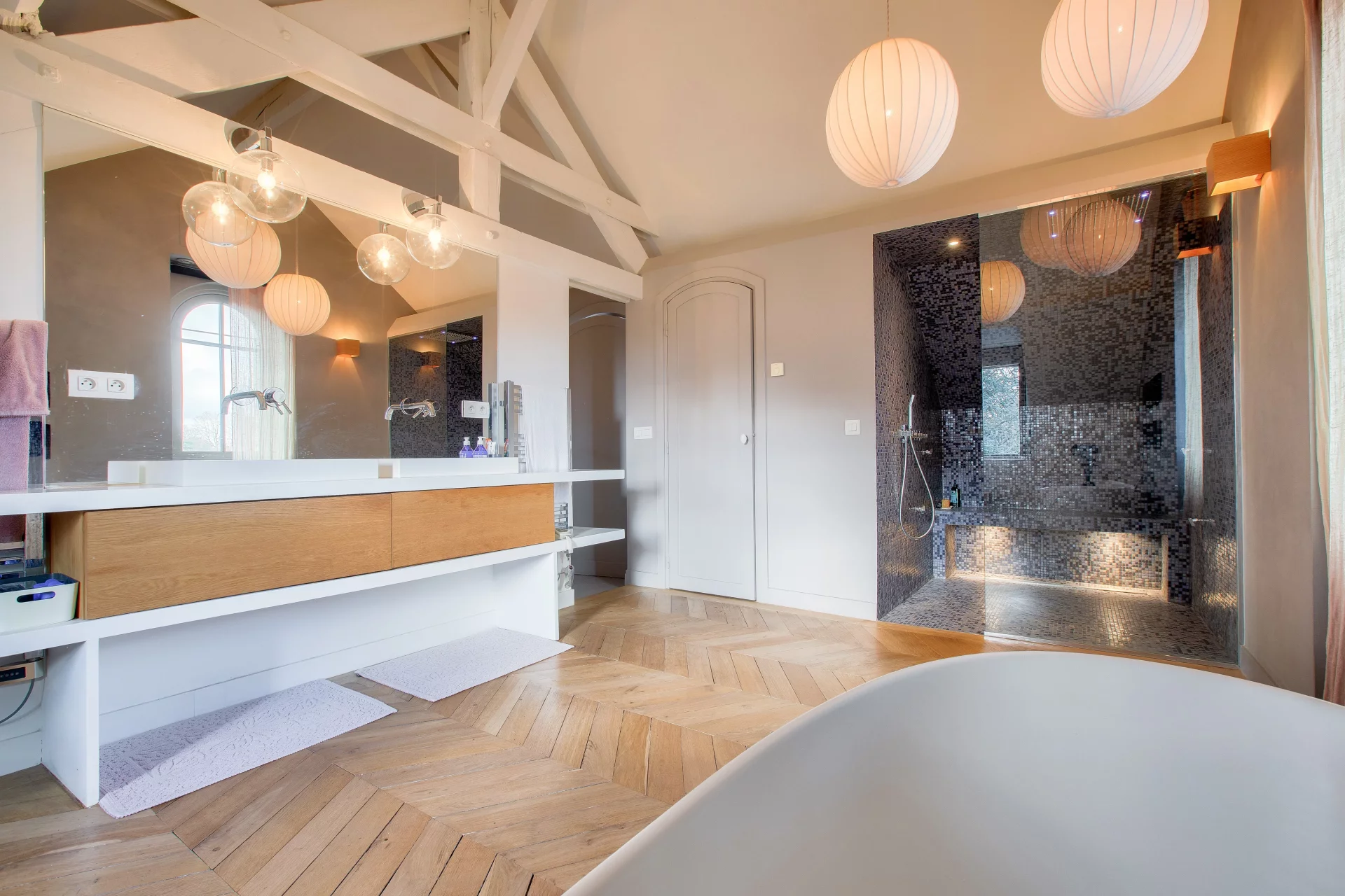 Cette demeure familiale, pleine de caractère, a bénéficié d’une rénovation de grande qualité, mettant en valeur les matériaux d’époque – murs en pierre et brique, cheminées, parquet massif – tout en intégrant des prestations modernes et confortables.