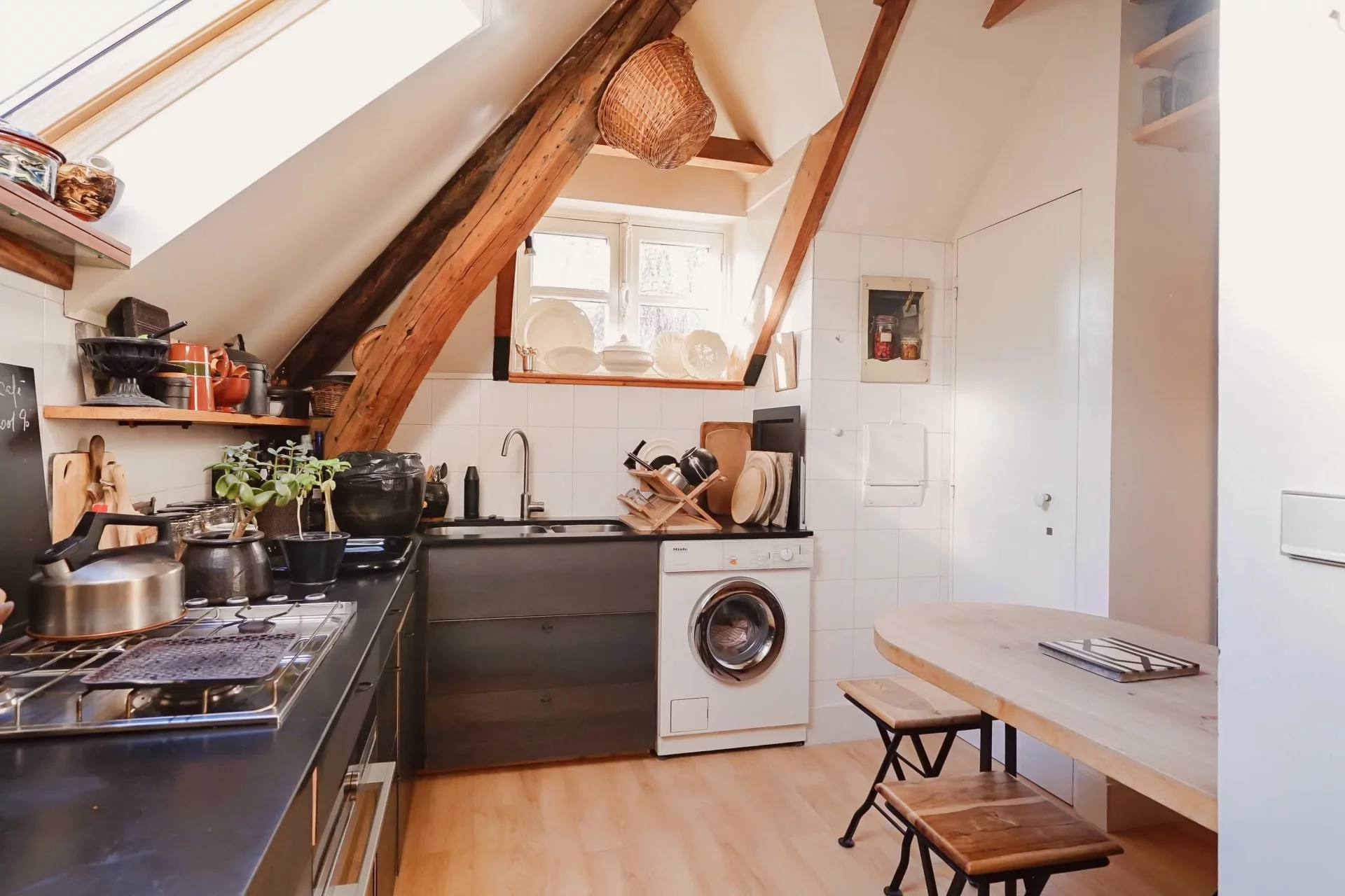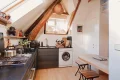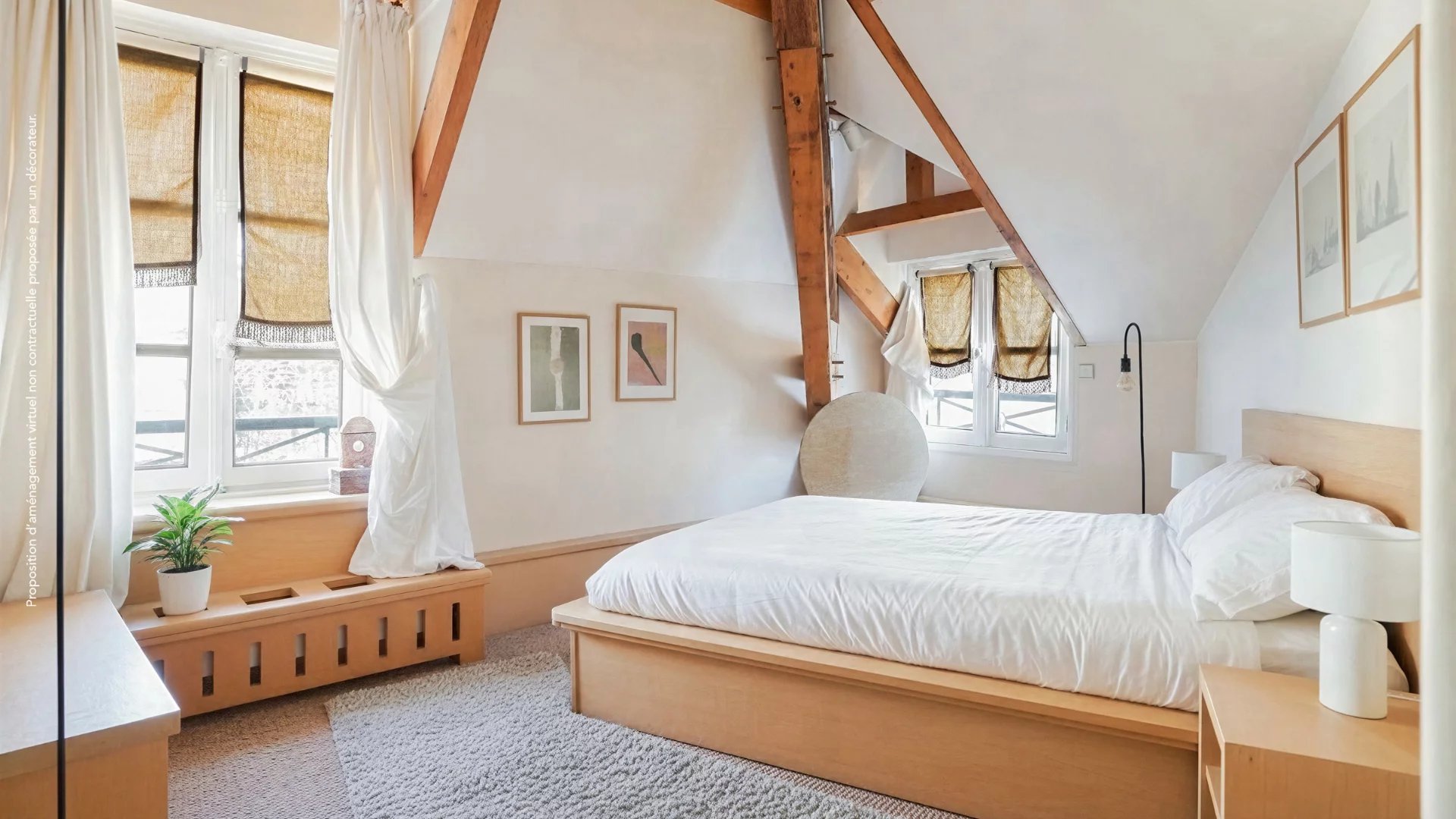 La cuisine occupe une pièce séparée. L’appartement comprend une salle de bains partagée, deux chambres bien proportionnées ainsi qu’une mezzanine aménagée en espace nuit. Un espace bureau a été intégré avec intelligence dans le séjour, optimisant encore la fonctionnalité de l’ensemble.