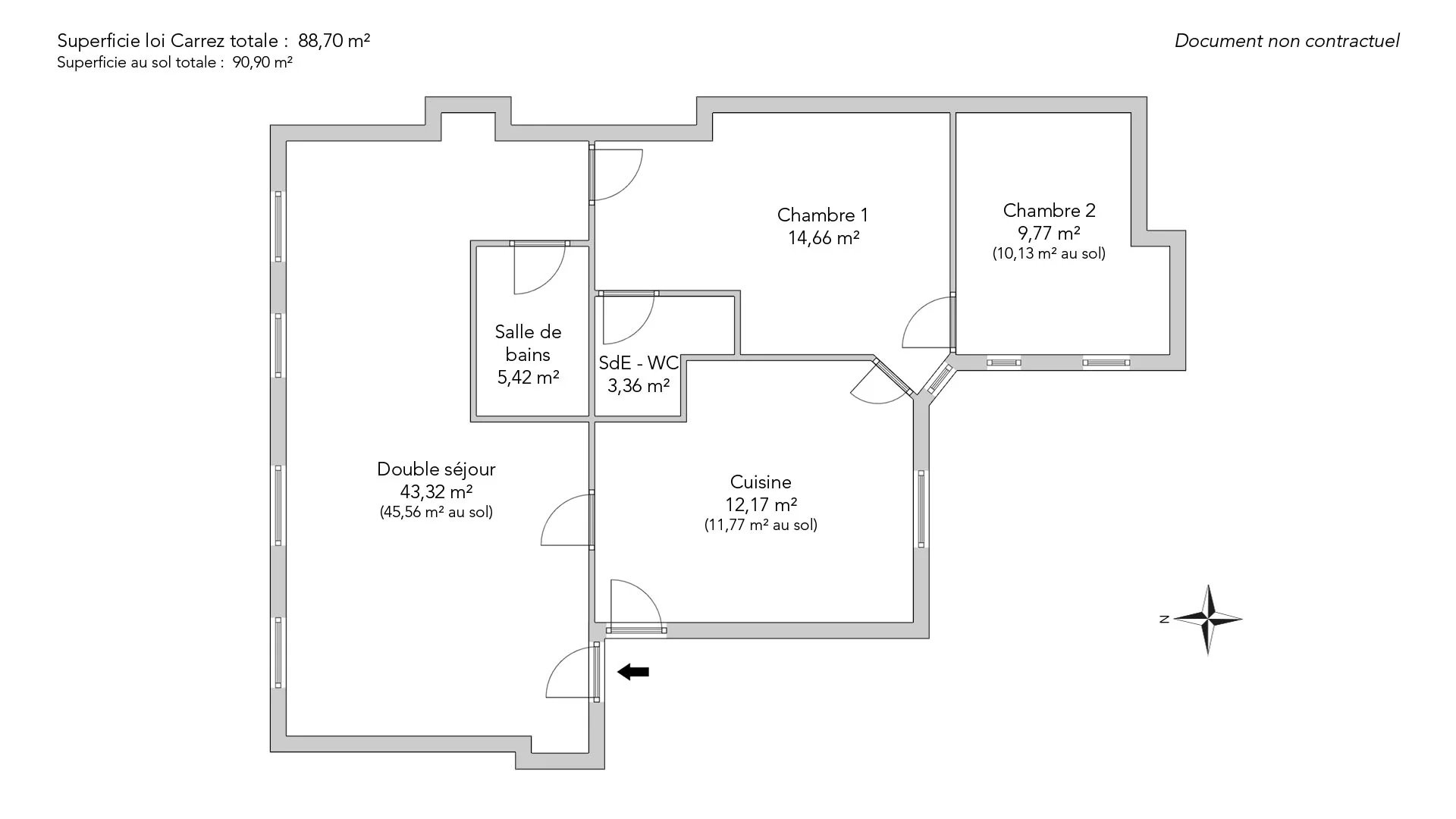 Au troisième étage sans ascenseur d'un immeuble de 1800. cet appartement, entièrement à rénover, de 88,70m² loi Carrez, offre un grand double séjour avec de beaux volumes (trois mètres de hauteur sous plafond), deux chambres sur cour, une salle de douche avec toilettes et une salle de bains ainsi qu'une cuisine indépendante.