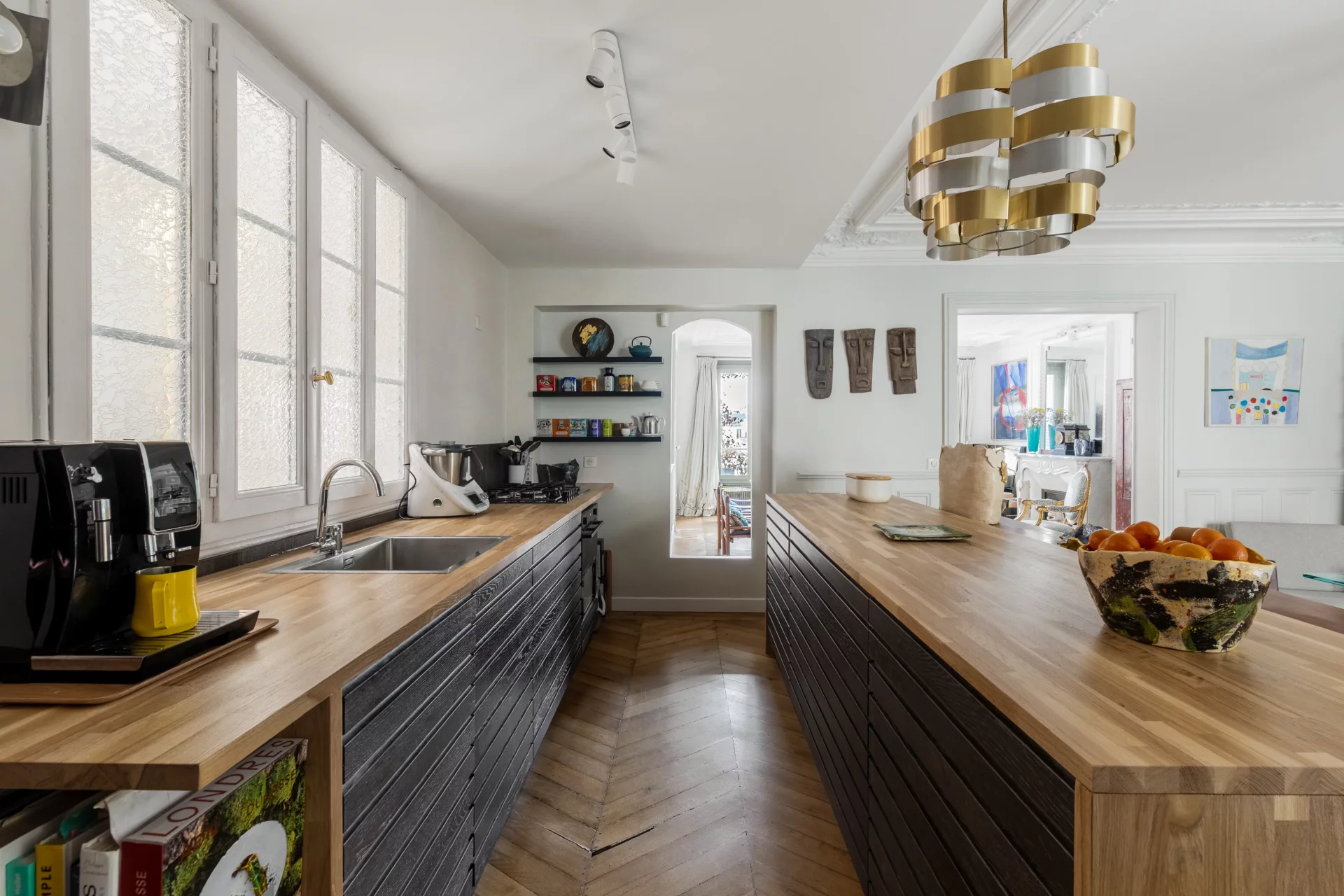 L'appartement a préservé son charme de l'ancien: parquet, moulures et cheminées et il profite d'un bel ensoleillement grâce à ses expositions est/ouest et sud.
