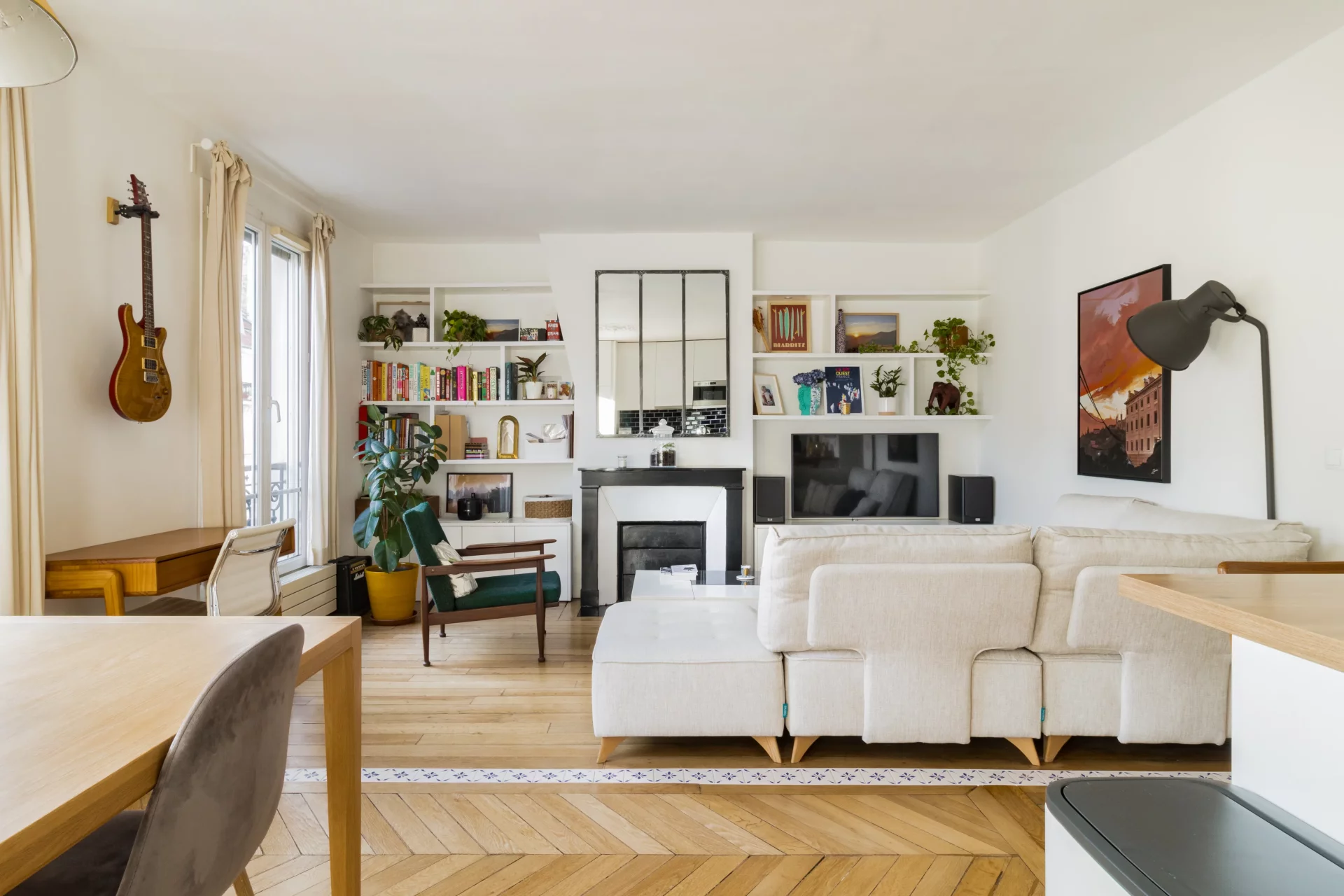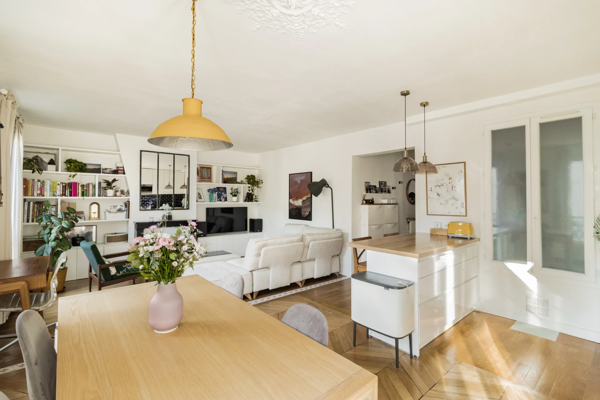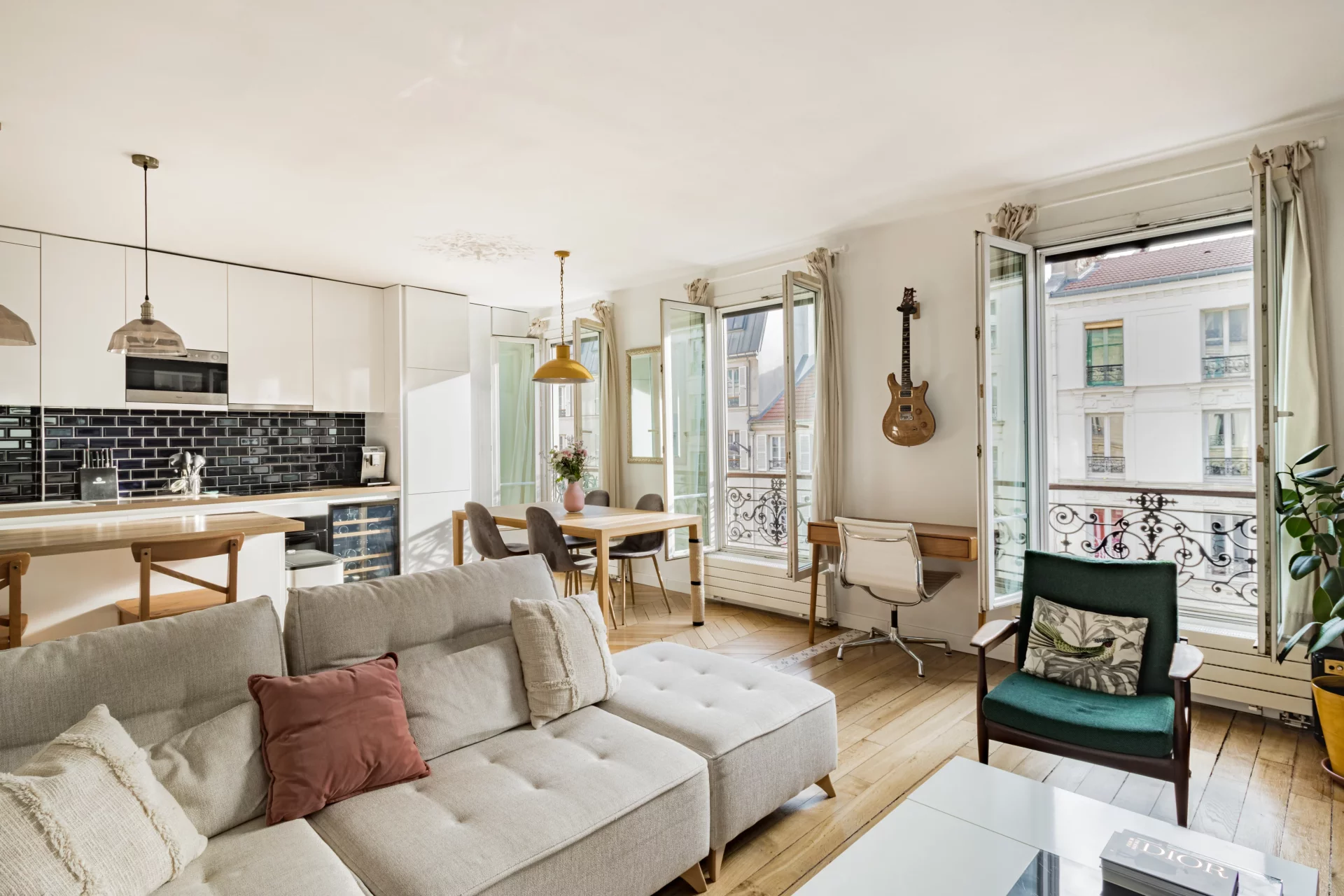 Le plan parfait comprend une entrée qui ouvre sur un agréable double séjour de 32,91m² prolongé par sa cuisine ouverte intégralement équipée. L'ensemble est baigné de soleil grâce à ses trois fenêtres exposées sud-est. Côté cour, au calme absolu, se trouvent une chambre avec dressing sur mesure et une salle de douche avec des toilettes.