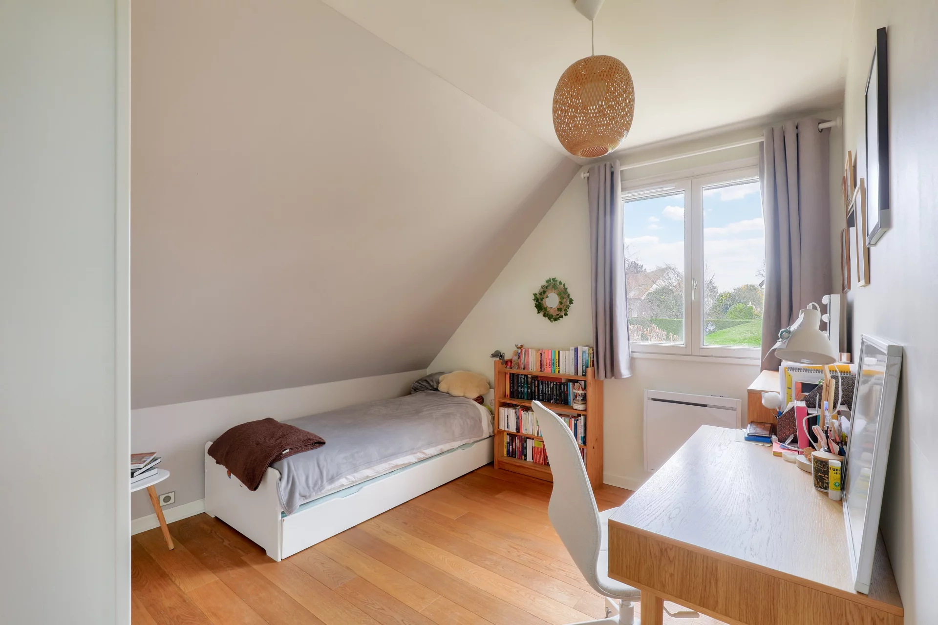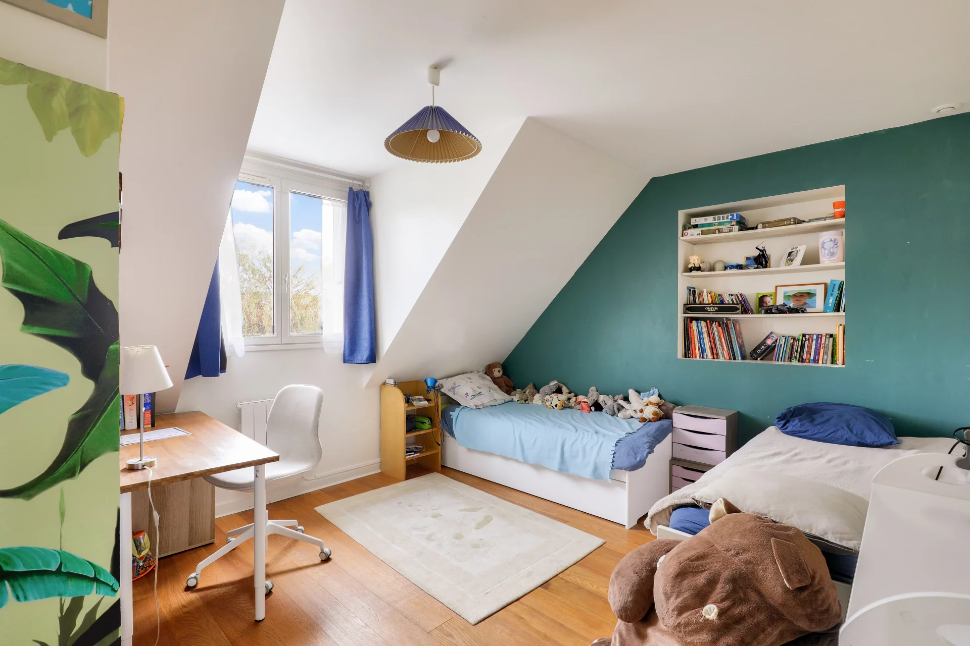 À l’étage, un palier dessert quatre chambres dédiées aux enfants, complétées par une salle d’eau et des toilettes indépendantes, offrant confort et praticité pour les matins en famille.