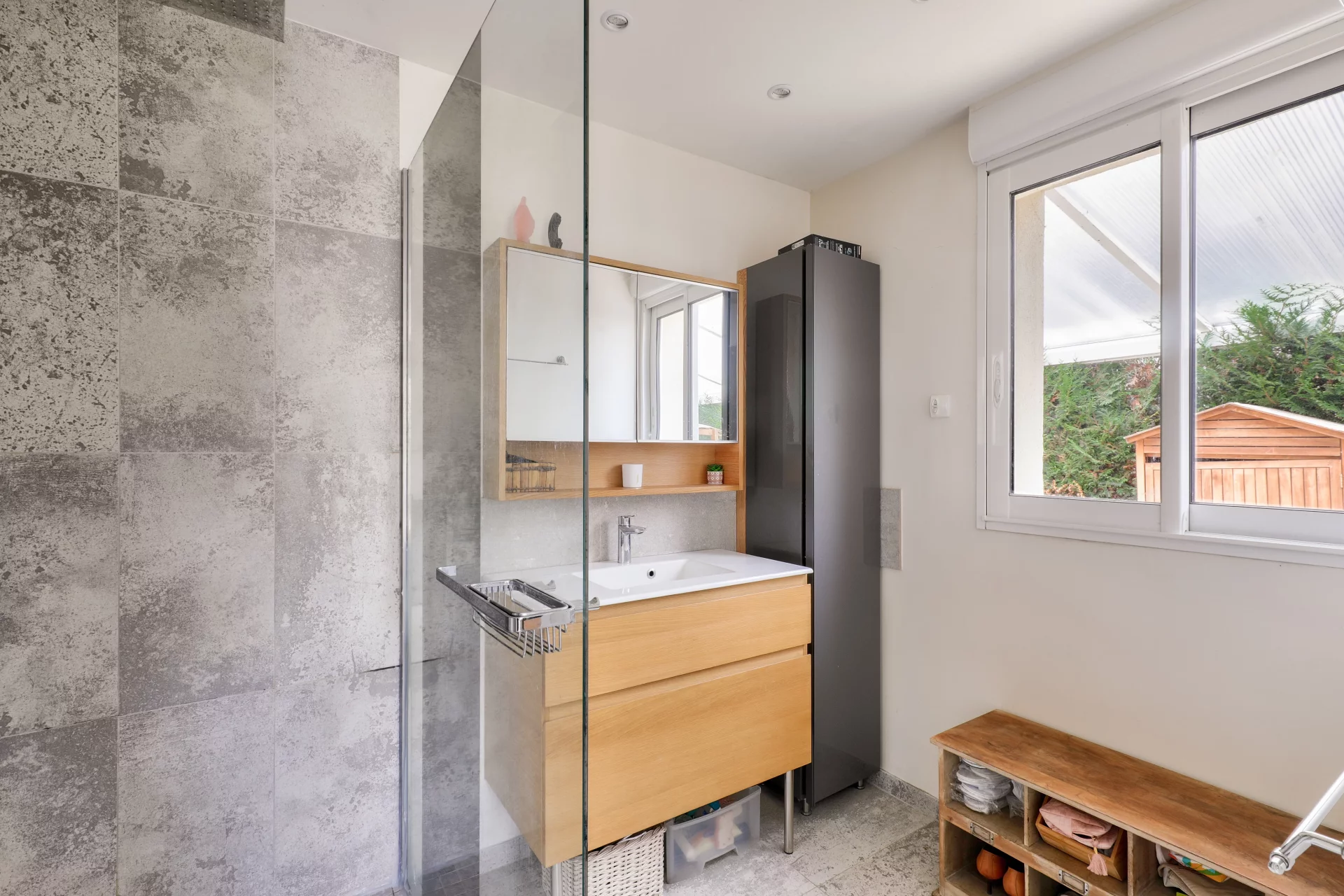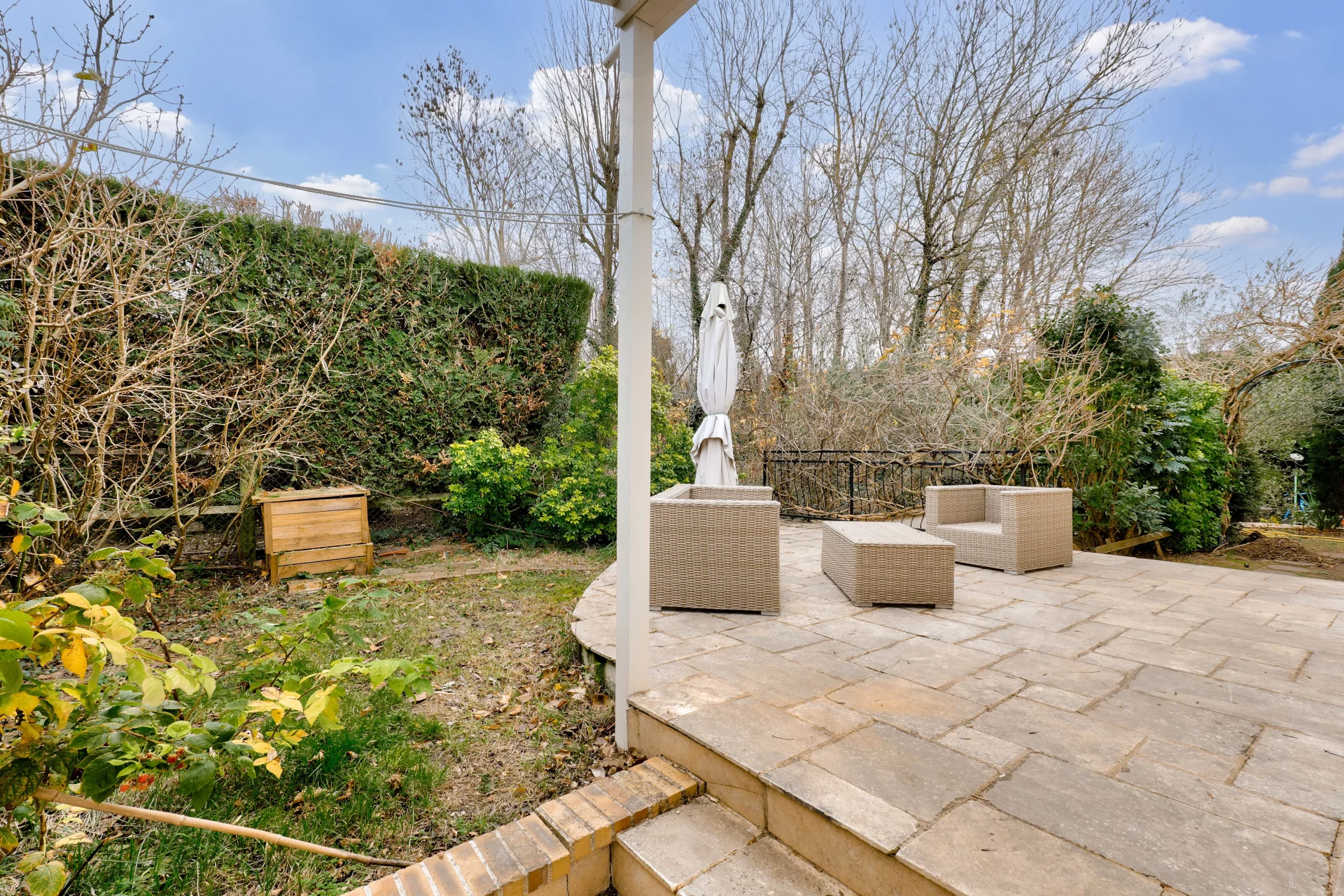 À l’extérieur, un jardin intimiste avec trois terrasses conviviales permettant de profiter du soleil à toute heure de la journée et de plusieurs emplacements de stationnement, parachève l’ensemble et invite à profiter pleinement des beaux jours.