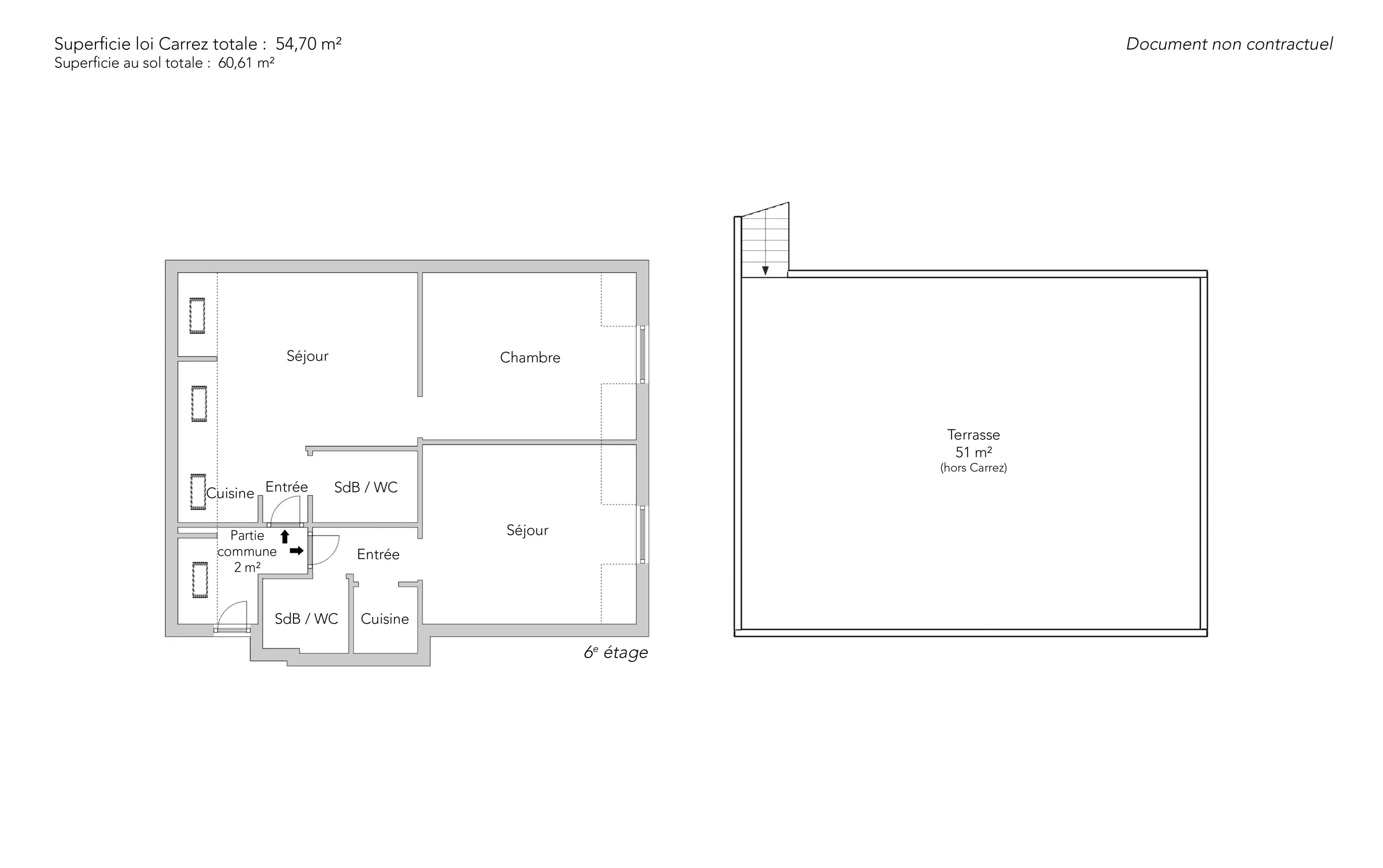 Au sixième étage, deux appartements totalisant une surface de 54,70m² loi Carrez (60,61m² au sol) et 2m² de parties communes rachetés en copropriété.