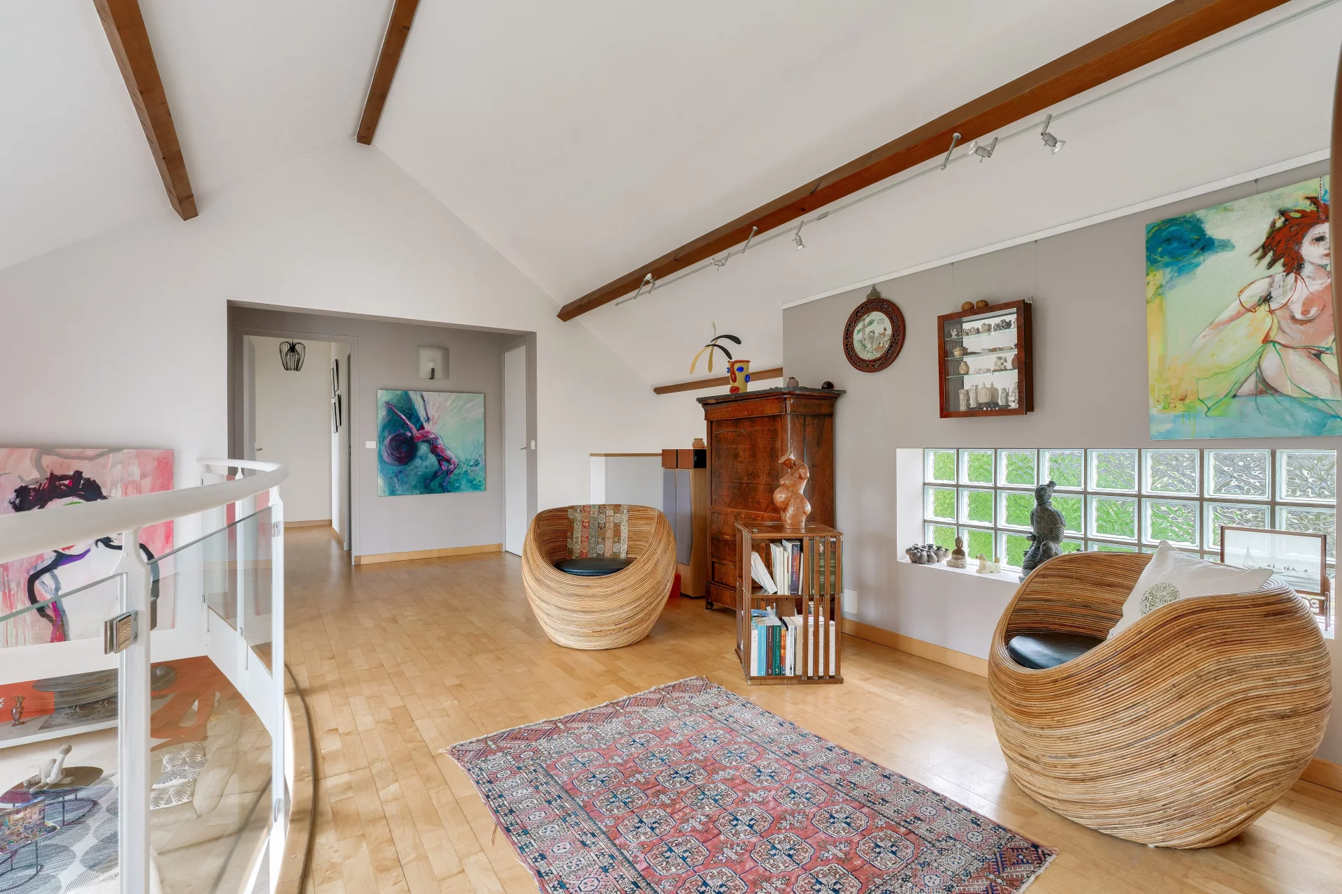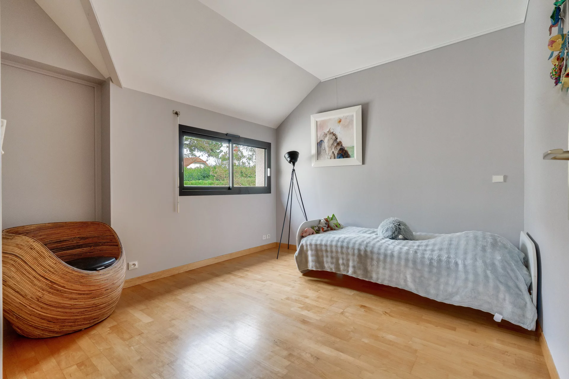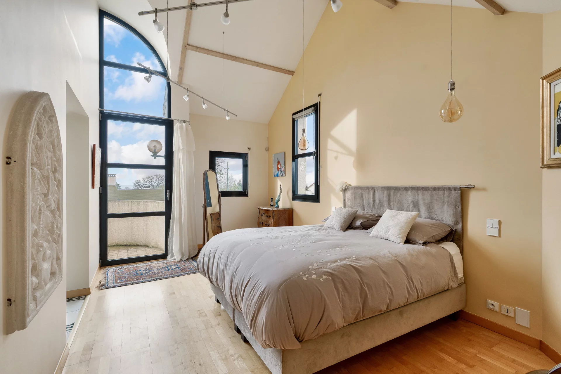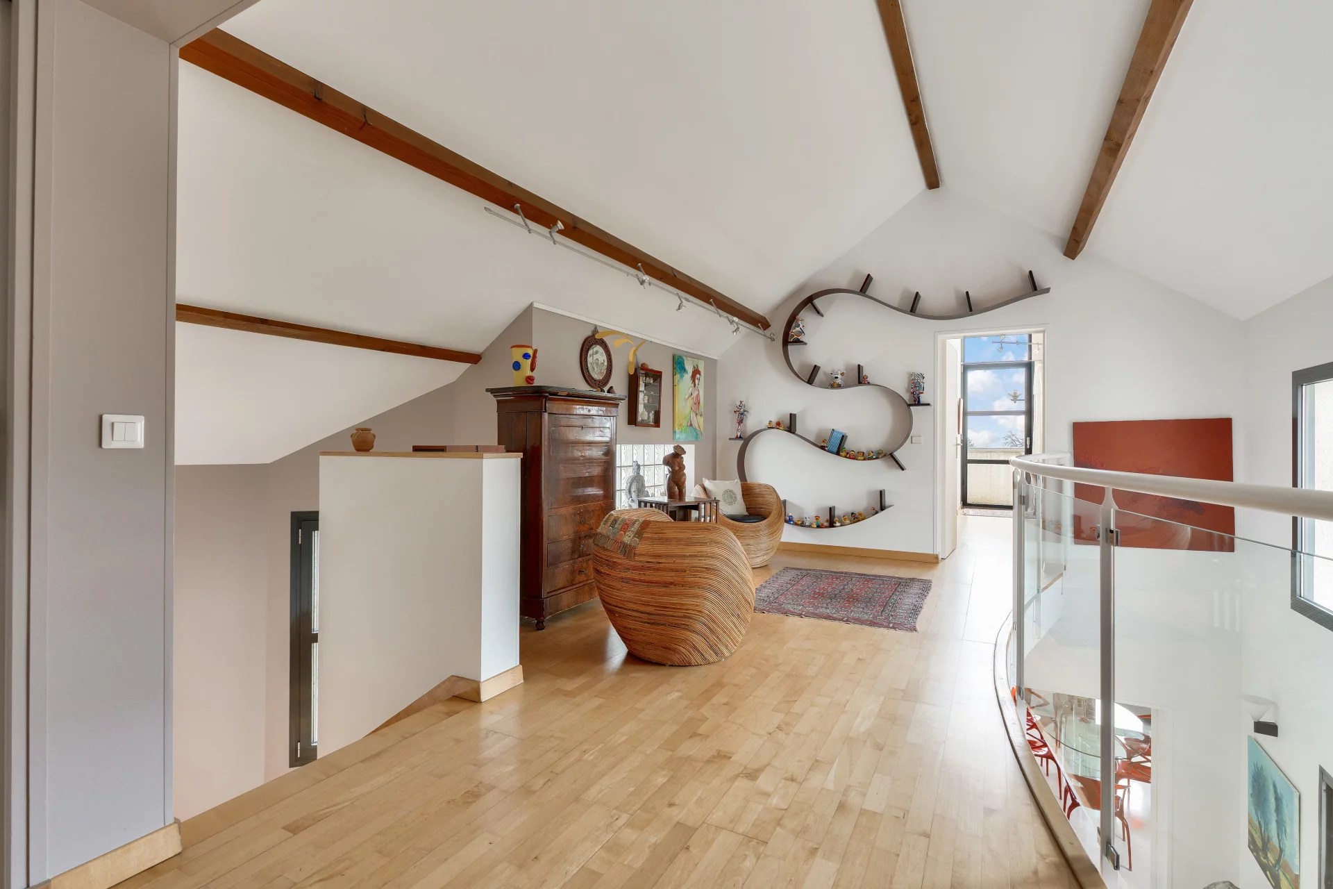 À l’étage, une élégante mezzanine distribue trois belles chambres lumineuses avec une salle de bains, et une suite parentale avec dressing, accompagnée de sa salle de bains.