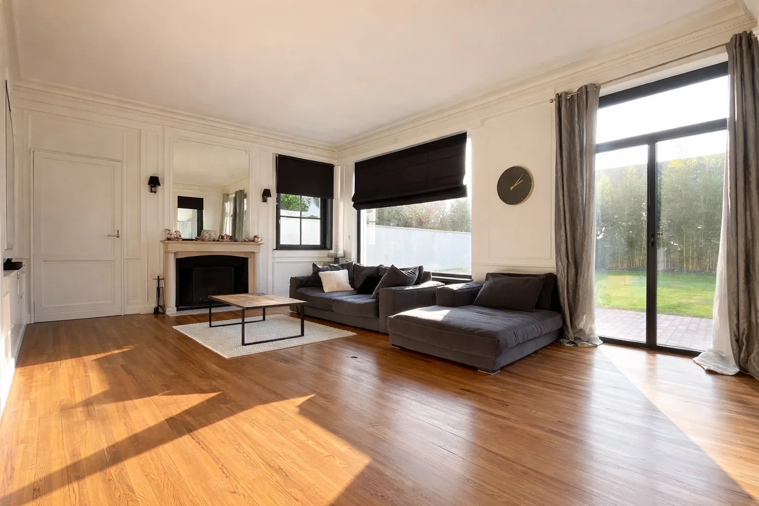 Dès l’entrée, le charme opère : une superbe entrée au sol d’époque, agrémentée de nombreux rangements et de toilettes, mène vers une pièce de vie remarquable. Parquet ancien, belle hauteur sous plafond, cheminée fonctionnelle et larges ouvertures sur le jardin composent un espace où lumière et caractère se répondent harmonieusement. La grande cuisine familiale, conviviale et dinatoire, s’ouvre elle aussi généreusement sur le jardin. Elle dispose d’un îlot central et forme, avec le vestiaire et la buanderie attenants, un ensemble à la fois pratique et chaleureux. L’autre aile de la maison offre un vaste bureau baigné de lumière ainsi qu’un atelier de cuisine de plus de 26 m², anciennement utilisé comme garage, permettant de nombreuses possibilités selon les besoins.