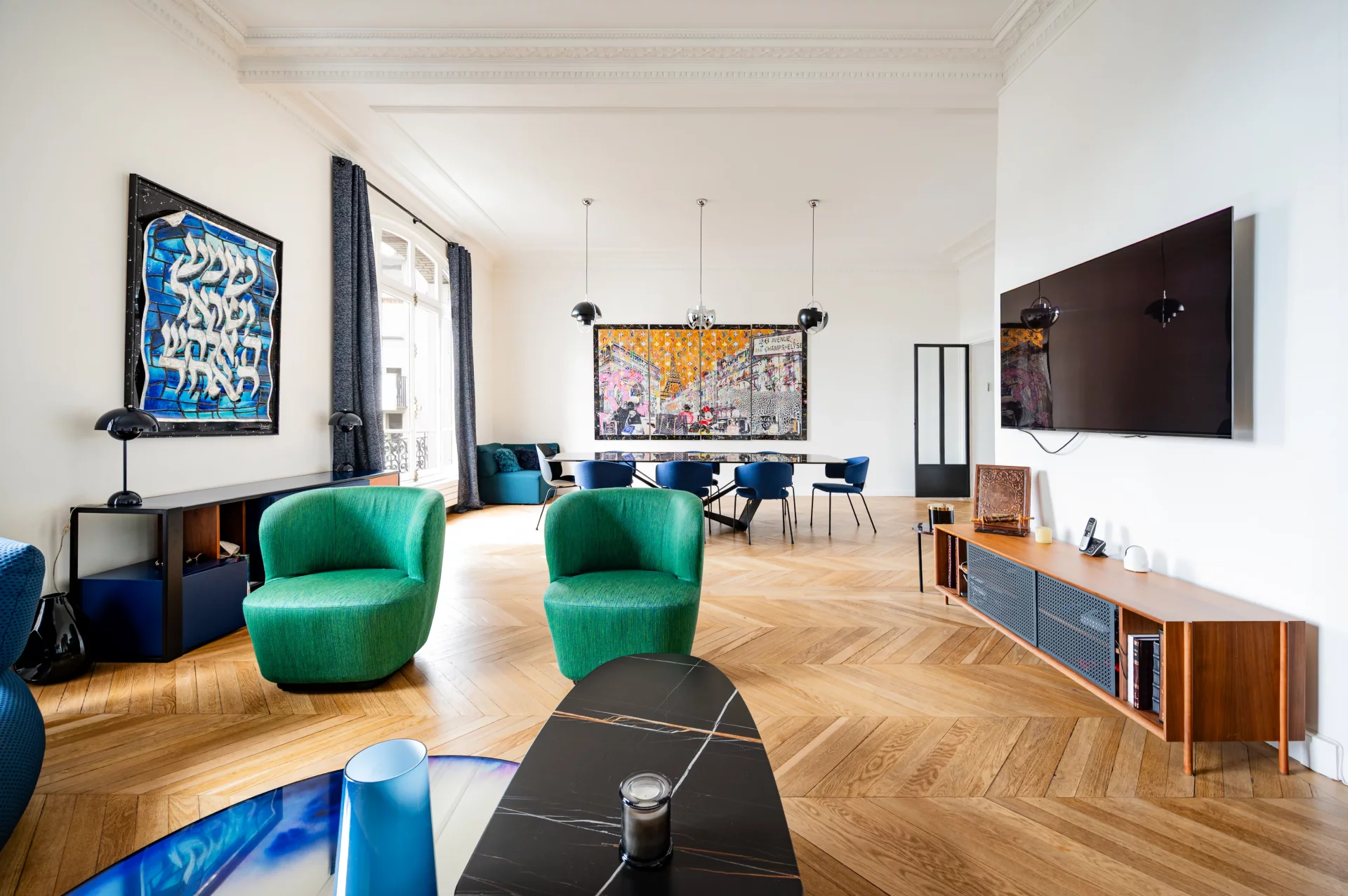 Avenue Victor Hugo à deux pas du lycée Janson de Sailly. Au troisième étage par ascenseur d’un immeuble en pierre de taille aux magnifiques parties communes, cet appartement de 216,67m² Carrez bénéficie d’une rénovation raffinée au goût du jour, d'un joli cachet ancien préservé et de volumes exceptionnels (3m47 sous plafonds).