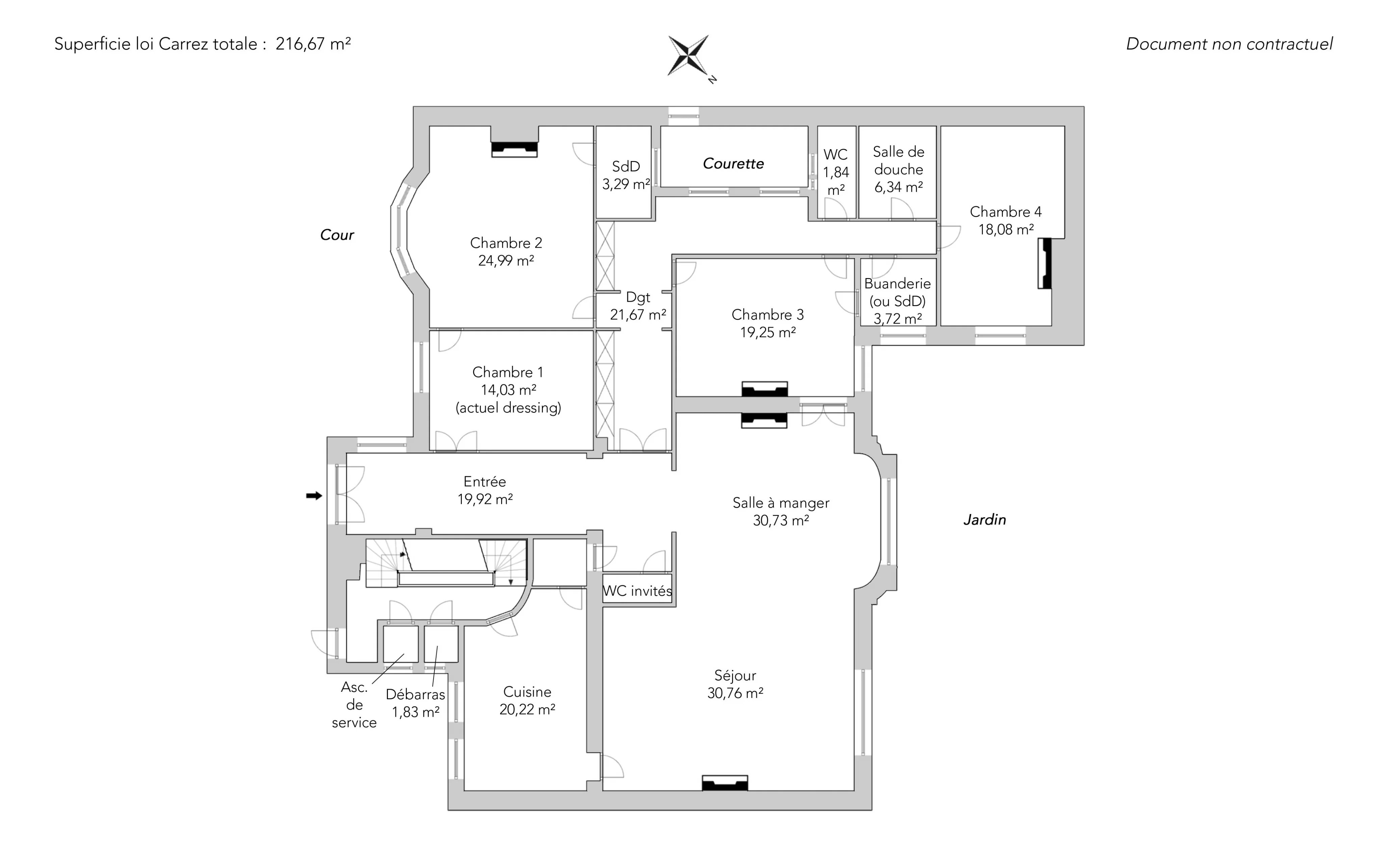 Au calme absolu, il comprend une galerie d'entrée lumineuse, une élégante double réception de 61m² offrant des vues dégagées sur jardin, une vaste cuisine équipée avec espace dînatoire, trois belles chambres dont une suite parentale avec salle de douche et immense dressing (ou quatrième chambre), une buanderie, une salle de douche, deux toilettes indépendantes et un débarras.