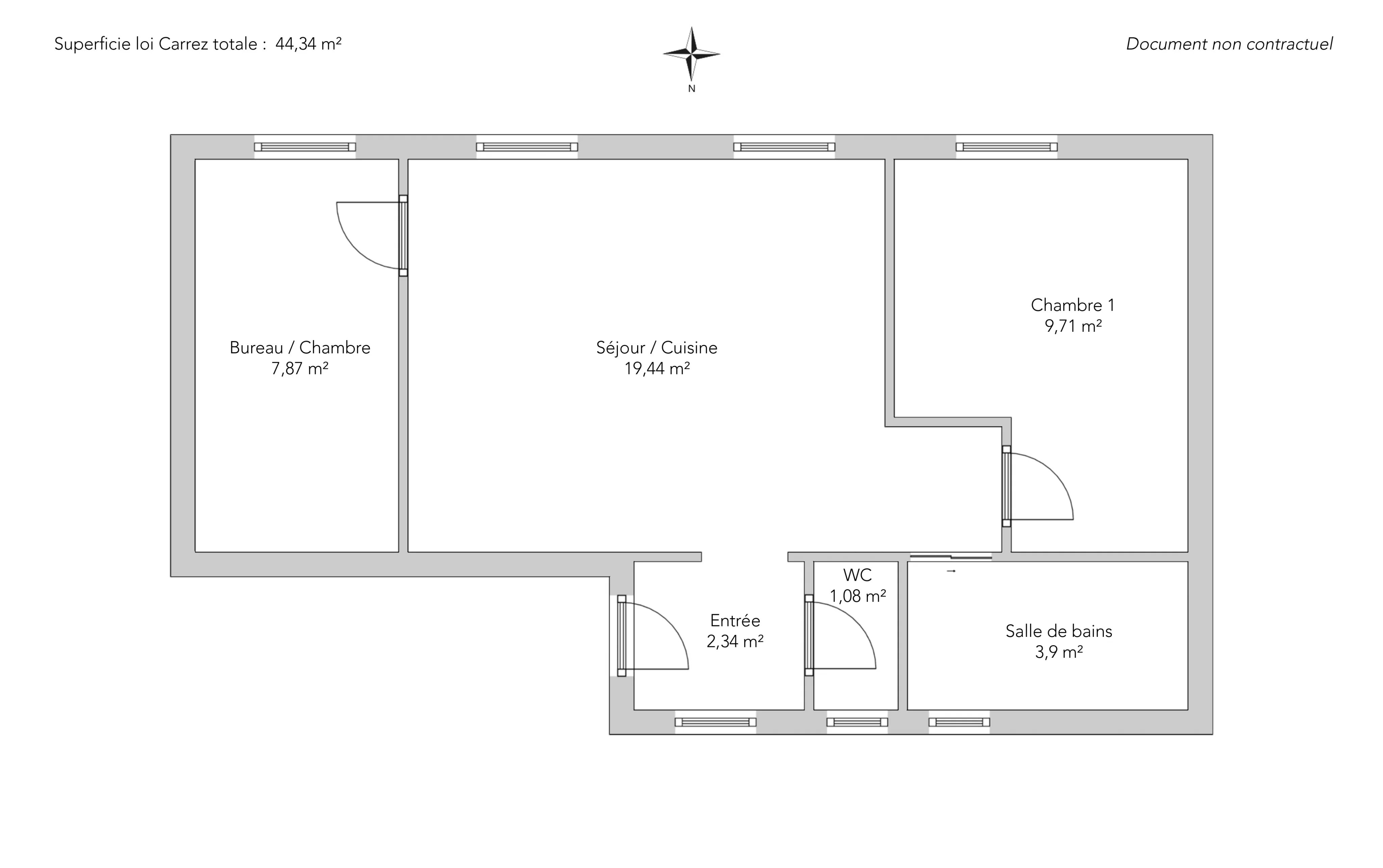 Appartement trois pièces de 44,34m² loi Carrez situé au deuxième étage d'une copropriété ancienne parfaitement sécurisée et entretenue avec gardien.