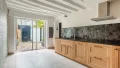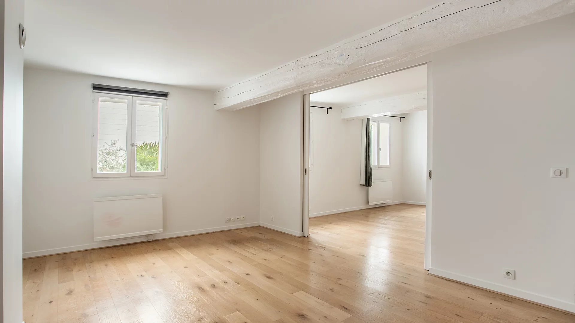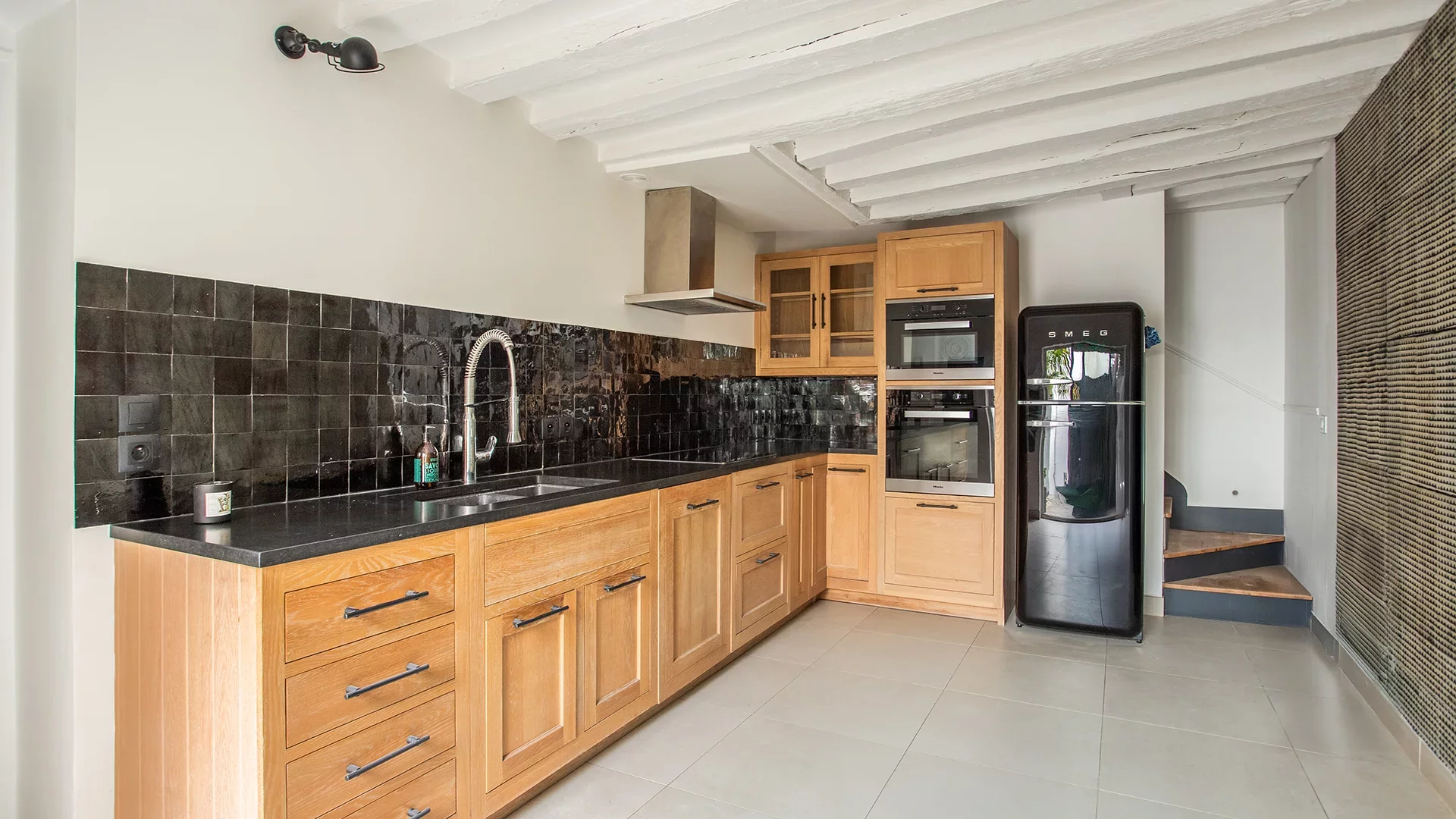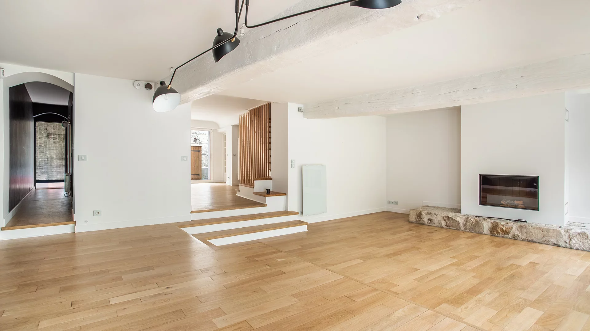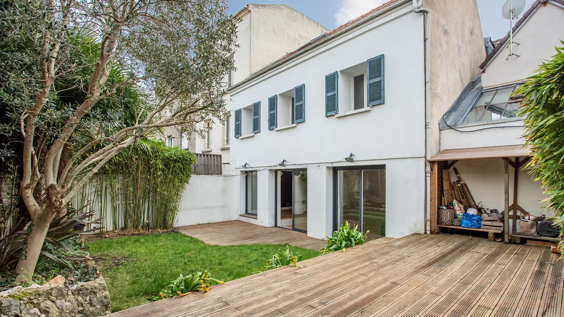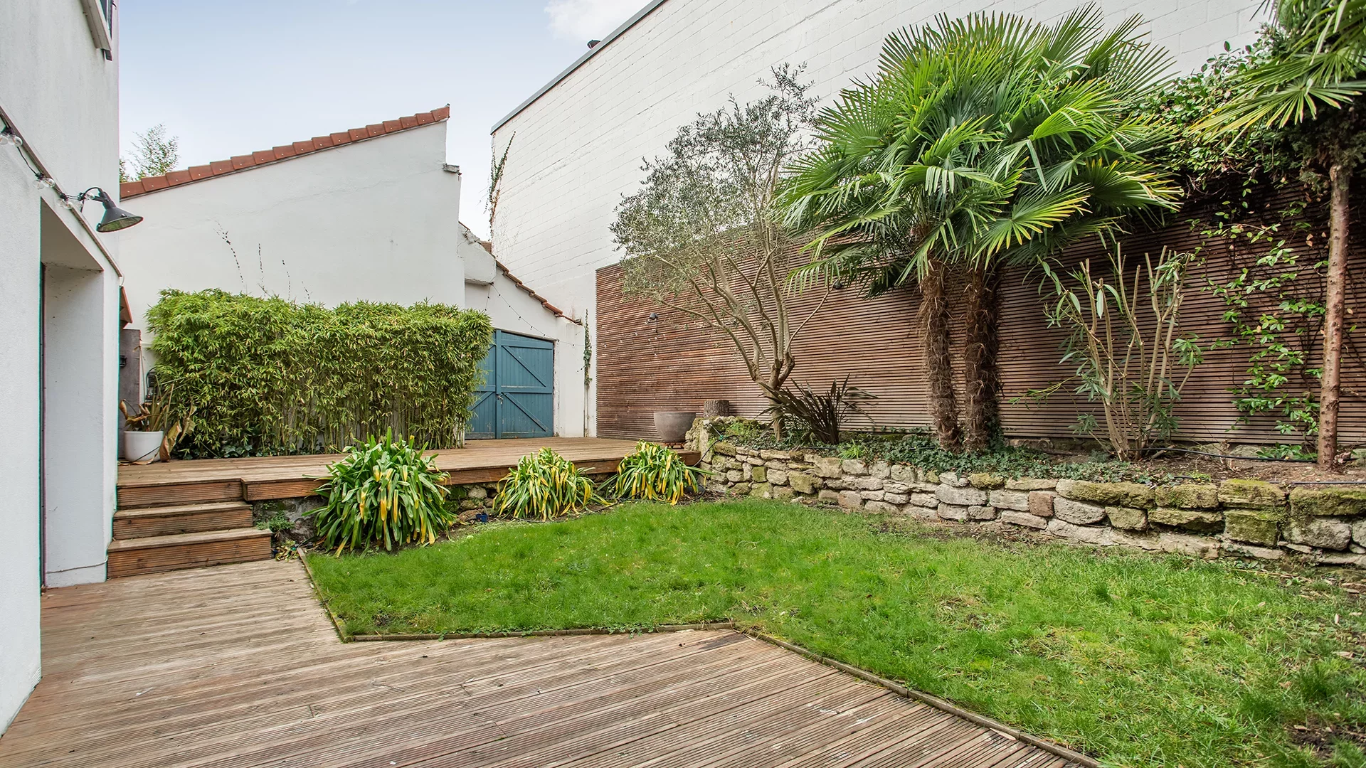 Accessible par une cour intérieure discrète, la maison s’ouvre au rez-de-jardin sur une vaste pièce de réception avec cheminée, prolongée par de grandes baies vitrées donnant accès à un jardin paysager d’environ 95 m². Une cuisine dinatoire indépendante, aménagée et équipée, avec cellier attenant, complète cet espace. Ce niveau comprend également un bureau ou chambre d’appoint.