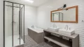 Le premier étage dessert quatre chambres, ainsi qu’une salle de bains avec douche et baignoire.