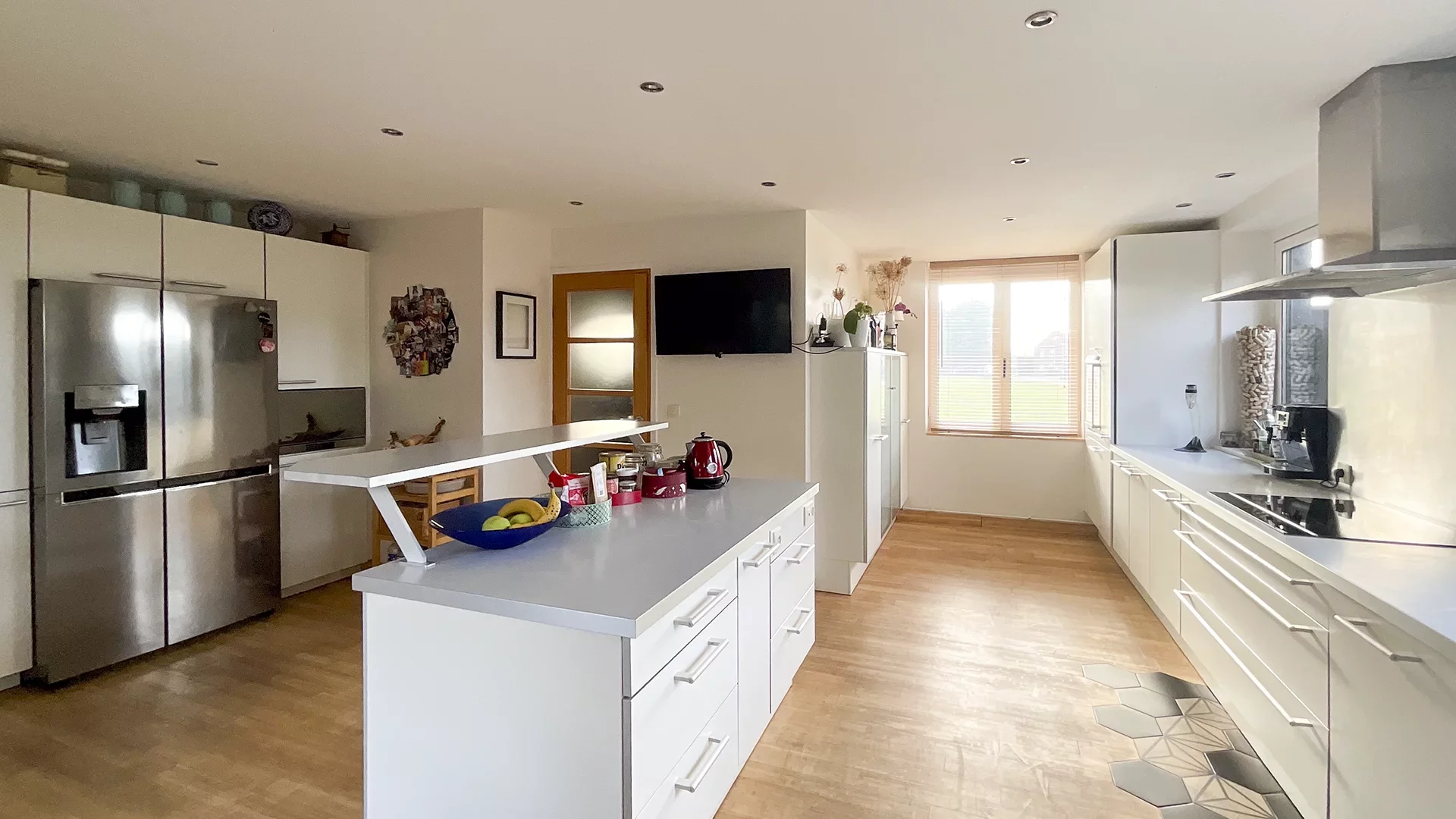 En campagne, à quelques minutes du centre ville et de toutes les commodités et transports, venez à la découverte de cette maison individuelle de 234,24m² habitables érigée sur une vaste parcelle de 2134m². La visite démarre par une entrée avec rangements et toilettes qui dessert un confortable espace bureau, puis une immense pièce de vie incluant un salon cheminée feu de bois et poële, et une salle à manger pour un total de plus de 74m², avec un magnifique sol en pierre bleue, et de belles vues dégagées vers l’extérieur. Vous accédez également à une large et lumineuse cuisine équipée haut de gamme, avec un bel espace dînatoire et de nombreux rangements.