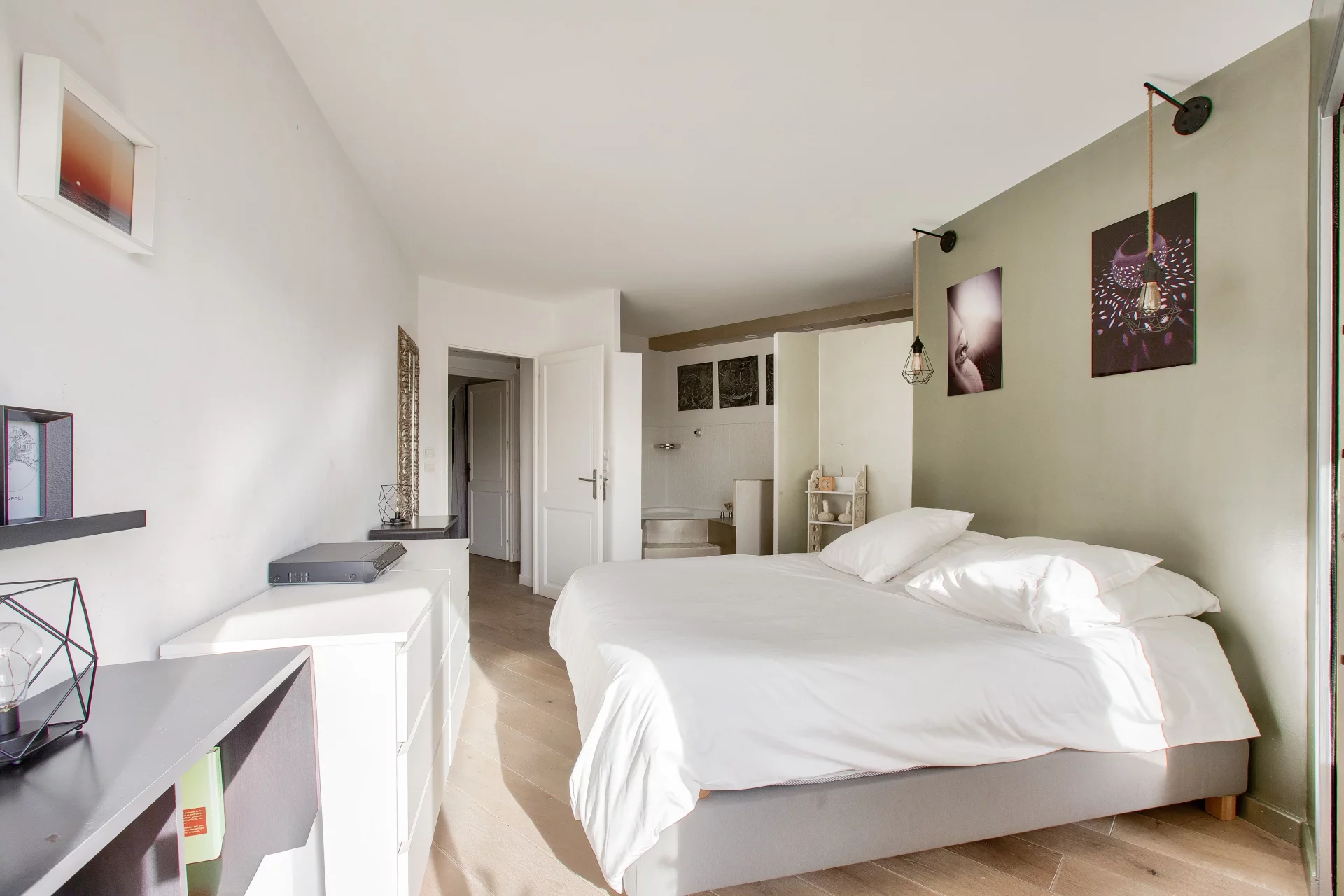 Un second dégagement mène aux troisième et quatrième chambres, offrant une vue dégagée sur le parc de Saint-Cloud, et se partageant une salle de bains avec toilettes ainsi qu’un grand dressing.