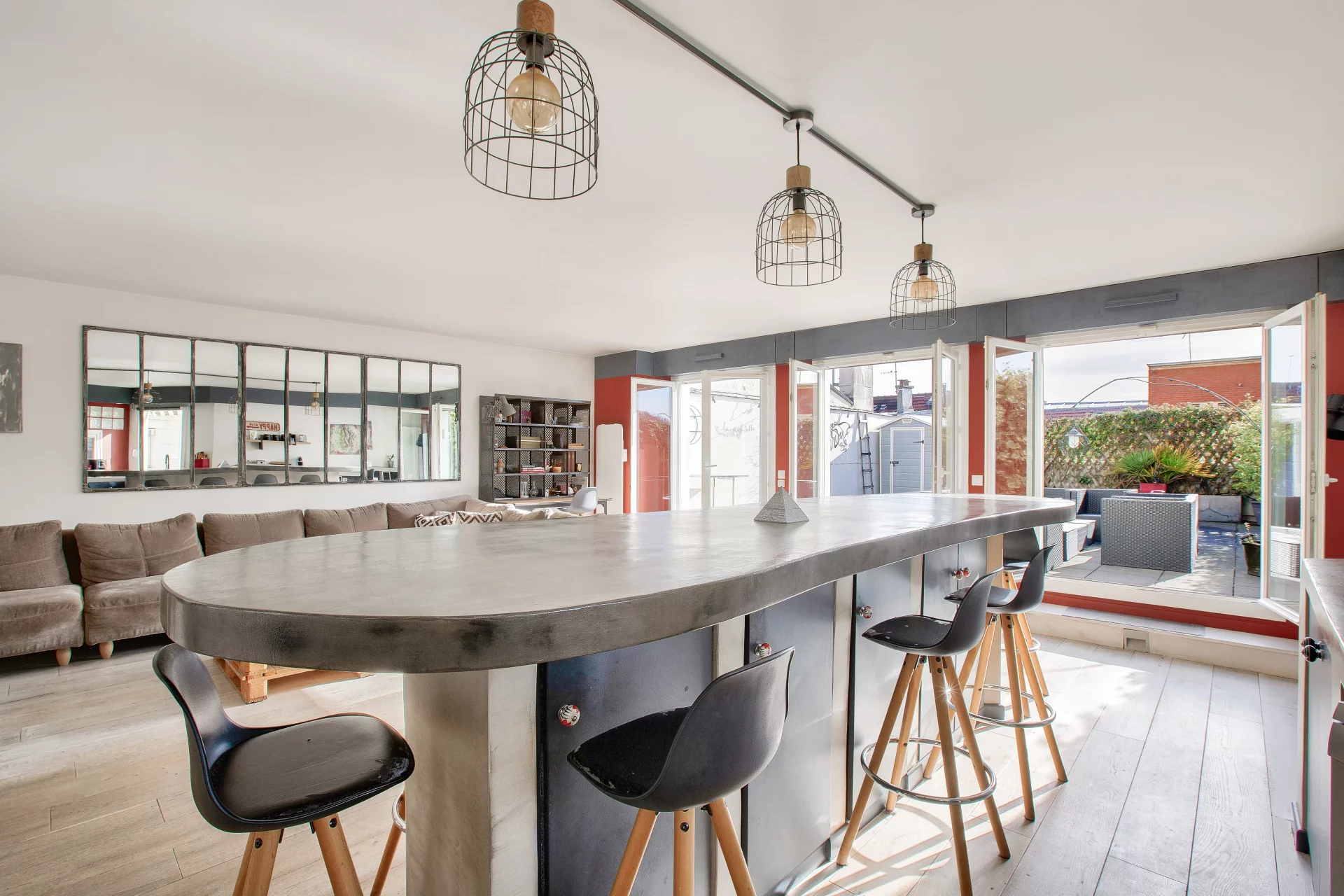 L’entrée mène à un vaste séjour baigné de lumière, ouvrant de plain-pied sur une terrasse exposée sud, une cuisine ouverte, une buanderie, un placard d’entrée et des toilettes séparées.