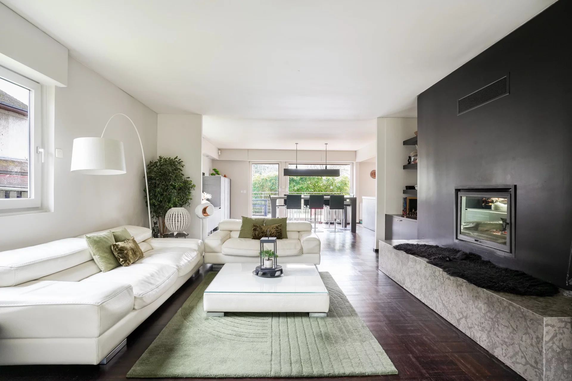 Développant environ 215m², complétés par un sous-sol total de 135 m², la maison s’ouvre au rez-de-chaussée sur une remarquable pièce de réception de près de 100 m².