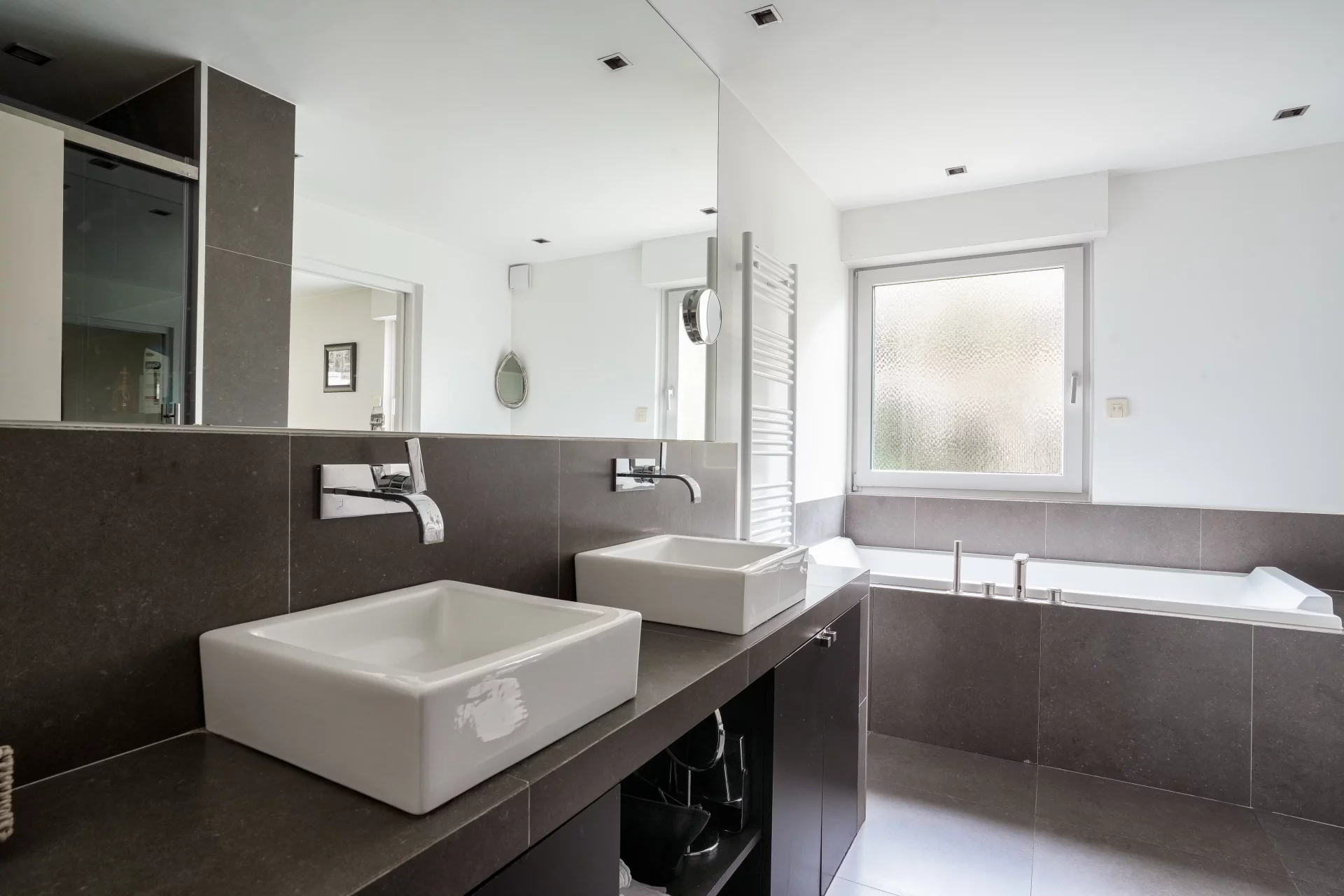Le sous-sol total, accueille une salle de sport, une salle de jeux, une cave, un grand garage permettant le stationnement de deux véhicules, ainsi qu’un espace buanderie.