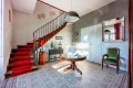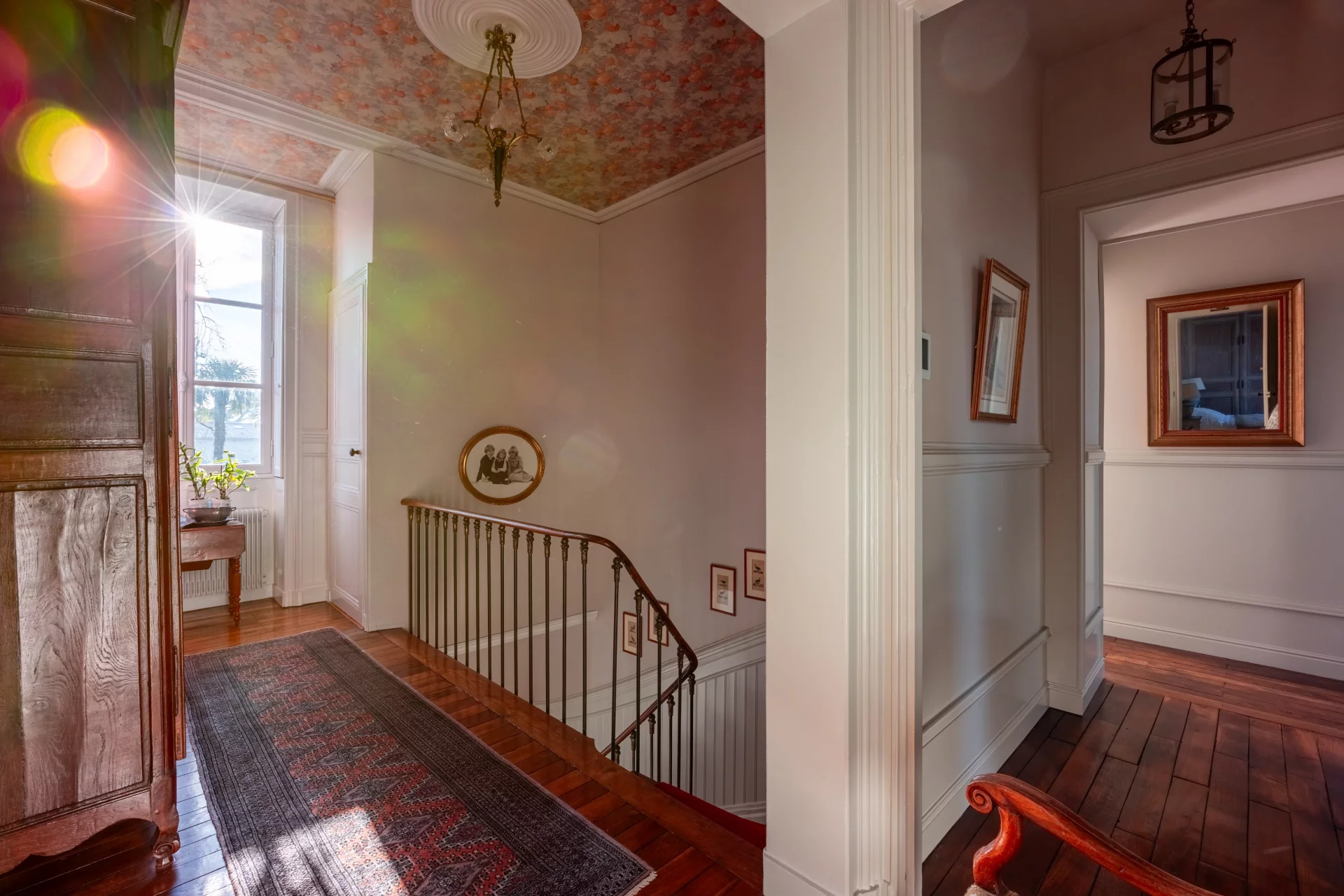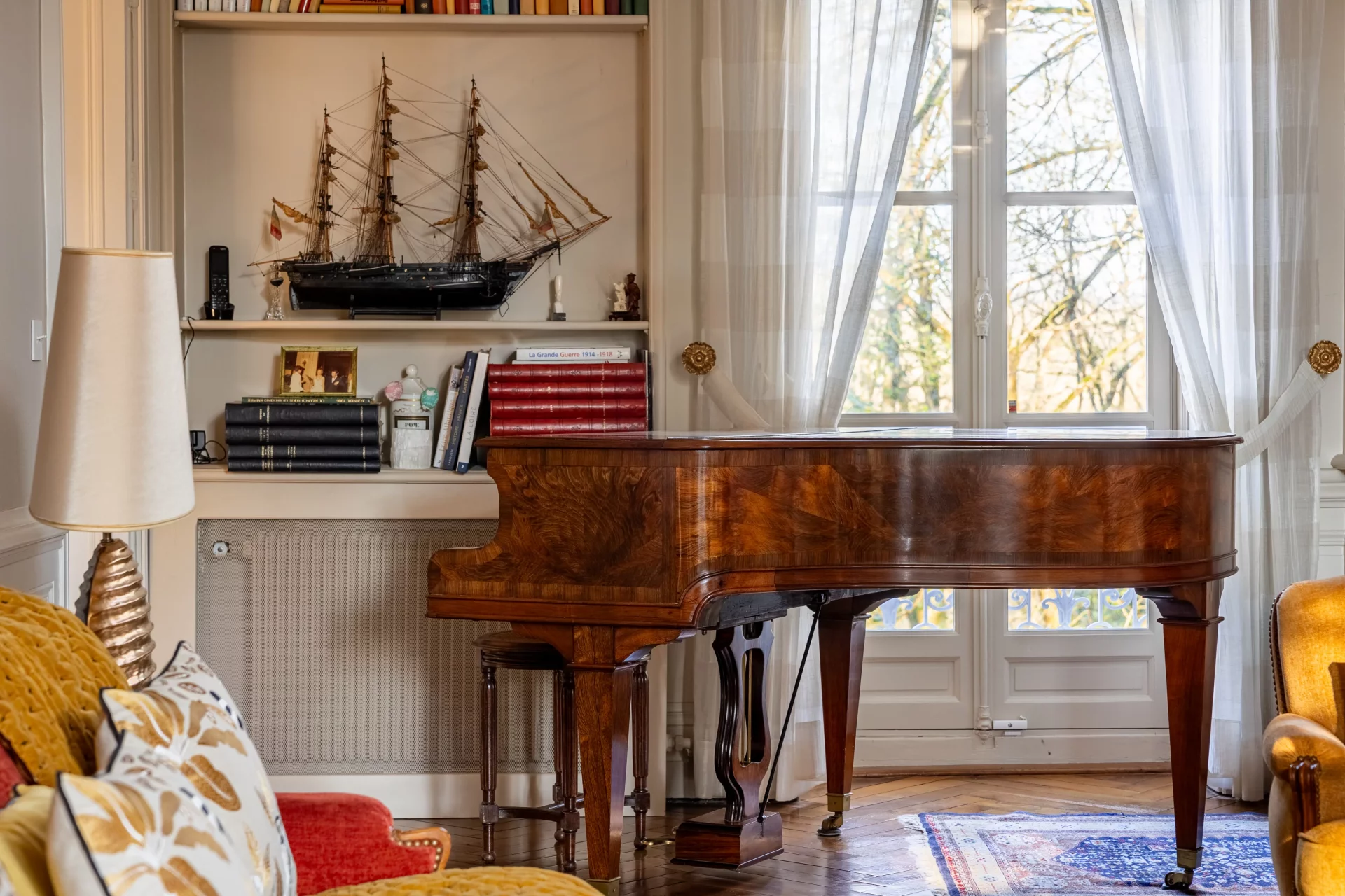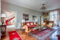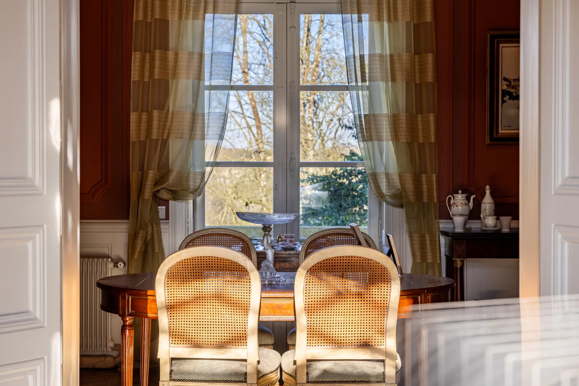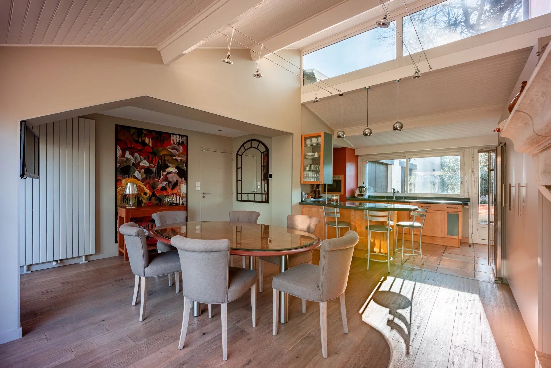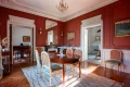 Sur 374 m² habitables répartis sur trois niveaux, la maison déploie des espaces de réception aux proportions remarquables. Le vaste hall central distribue avec harmonie les pièces de vie. La salle à manger avec cheminée, en surplomb du jardin, dialogue avec l'ancien bureau également doté d'une cheminée. L'aile droite accueille un grand salon traversant sur parquet en bâtons rompus, sublimé par sa cheminée d'origine. L'extension contemporaine abrite une vaste cuisine aménagée avec son espace dinatoire et cheminée.