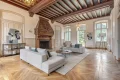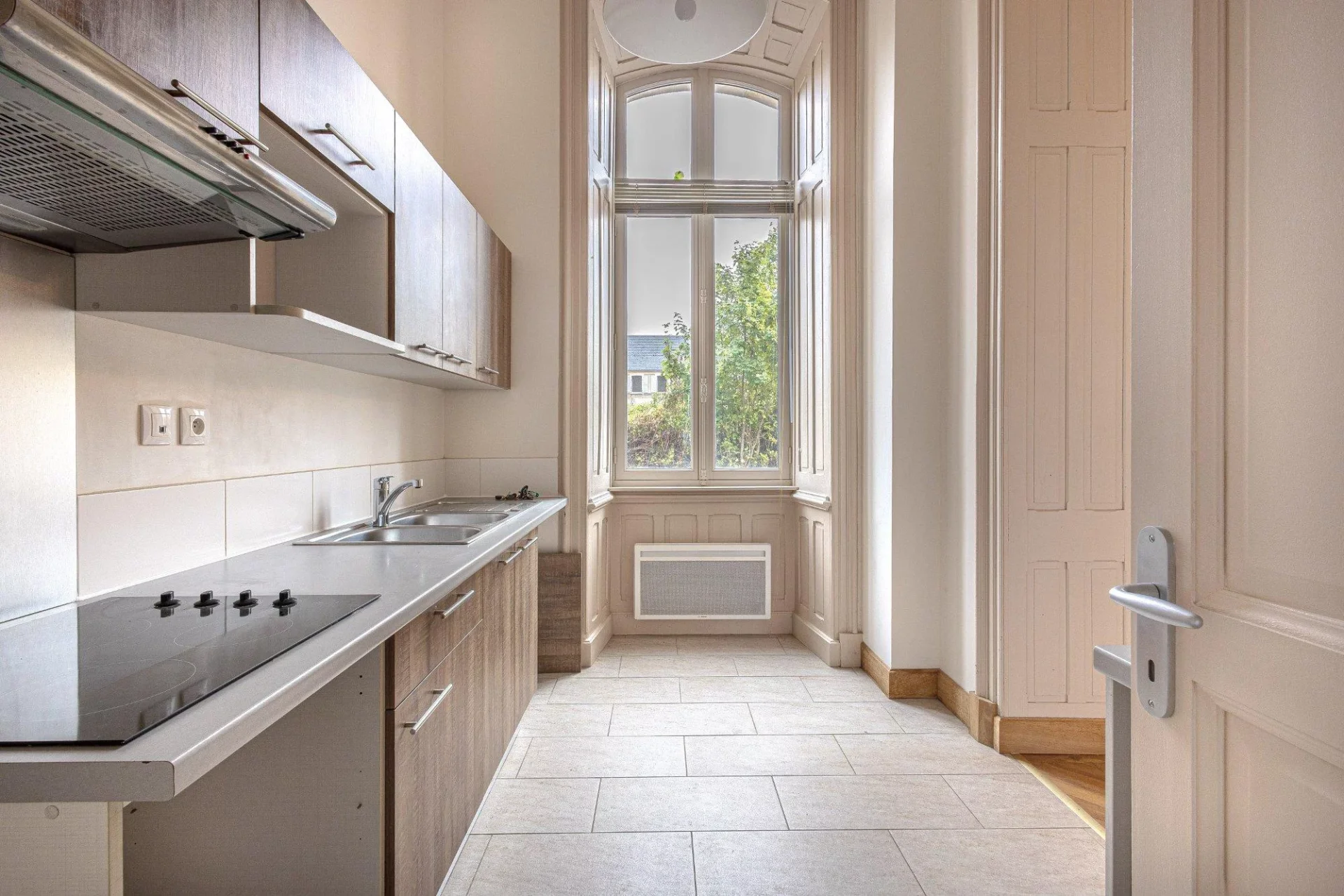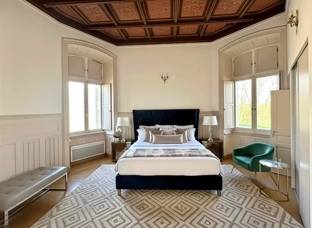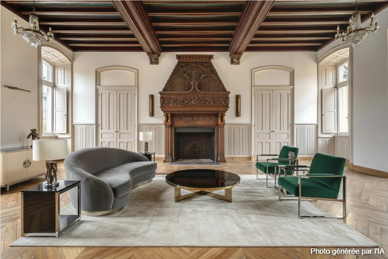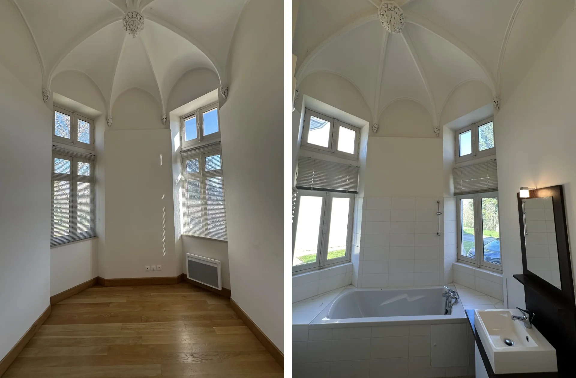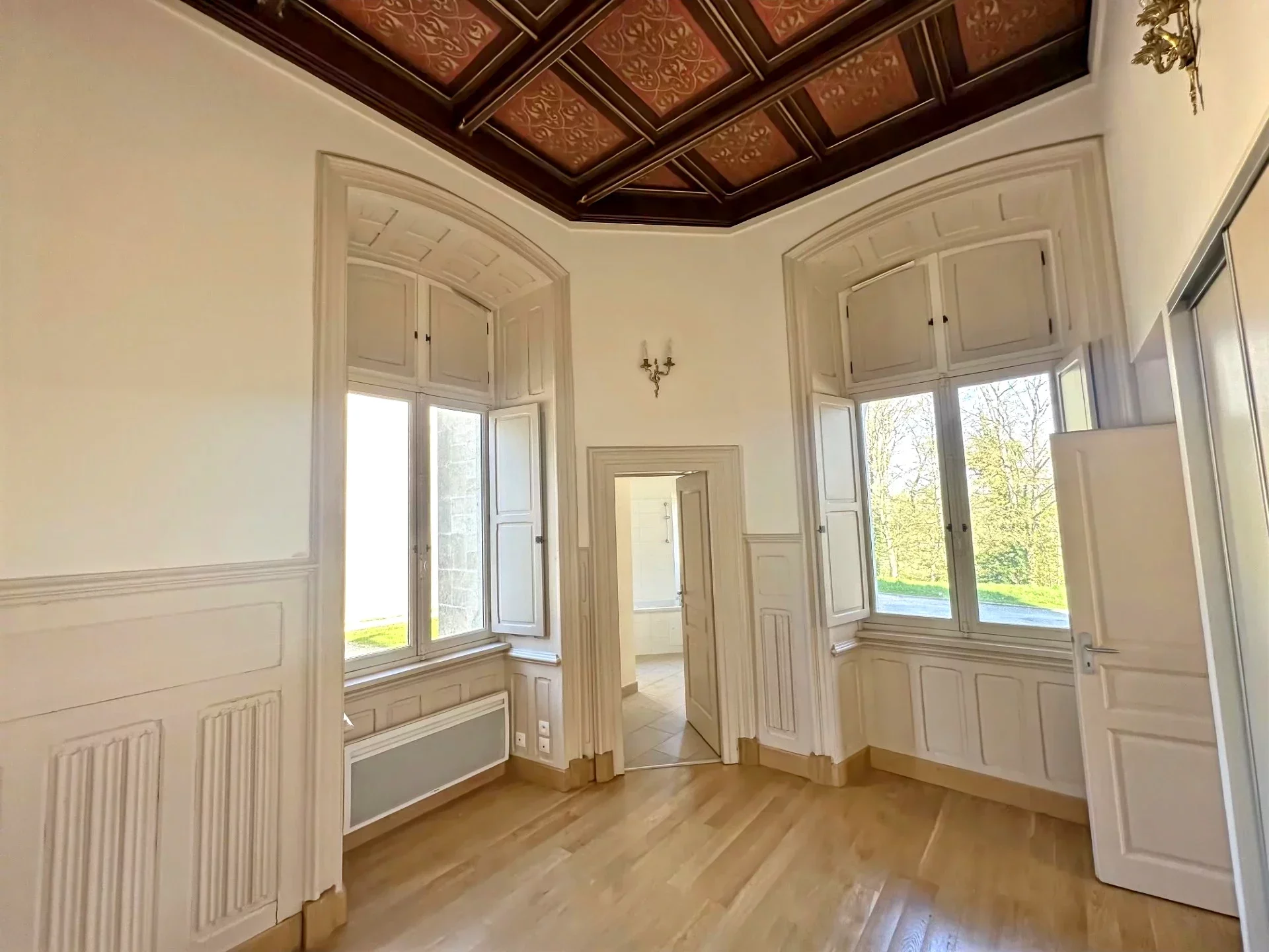 Cet appartement T4 de plain-pied dispose d'une vaste salle de réception de 60m², lumineuse, ornée d'une cheminée de style, de 3 chambres, deux salles de bains et une cuisine équipée. Il a conservé de magnifiques éléments et décors de style néogothique, tels que les plafonds à caissons à la française ou à voûtes sur croisées d'ogives, les boiseries à décor de plis de serviette, la cheminée monumentale en bois sculpté et de somptueux parquets en chêne posés en pointe de Hongrie.