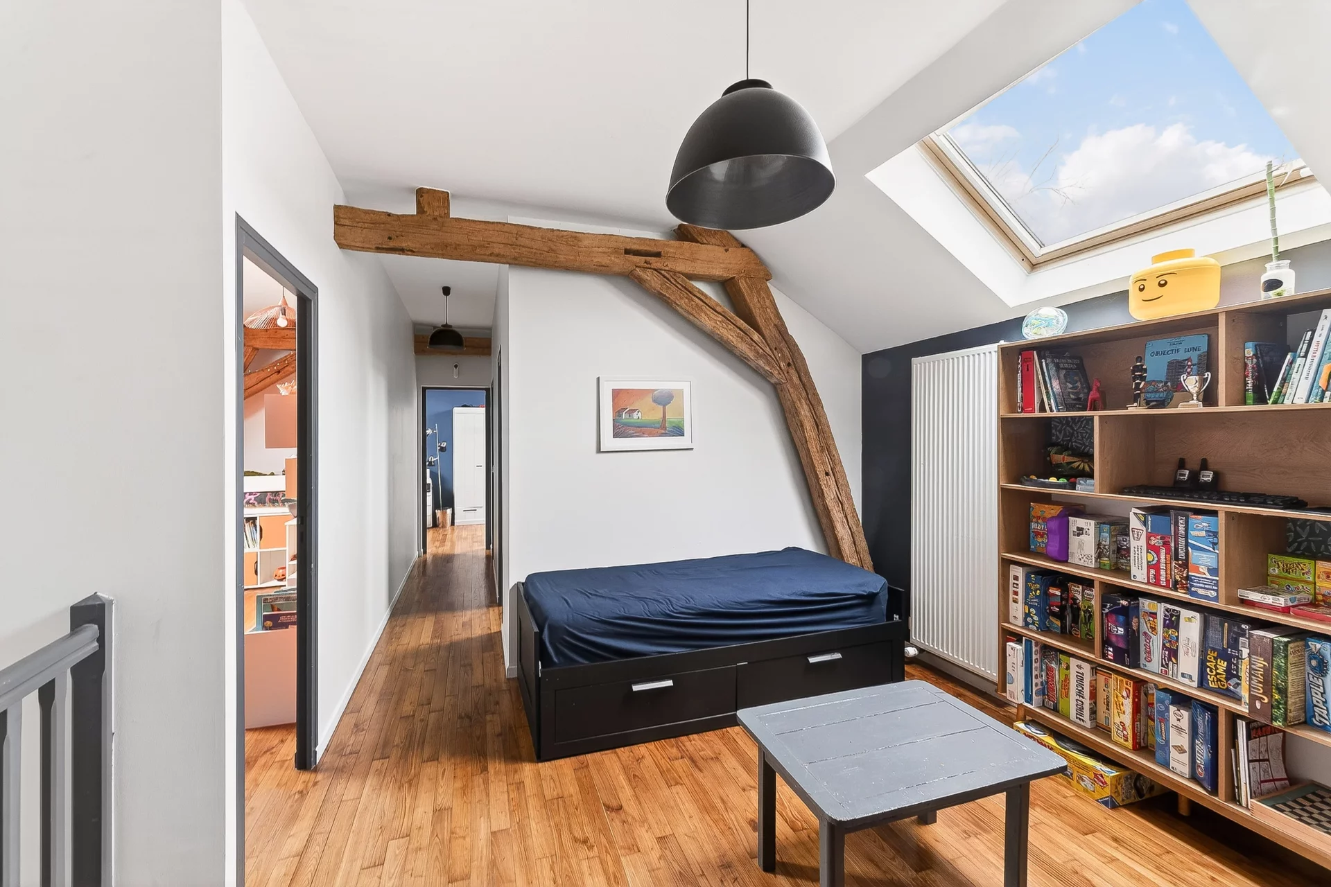 À l’étage, deux chambres aménagées sous les pentes disposent de rangements de type dressing. Une salle de bains avec douche ainsi que des toilettes complètent l’espace nuit. Implantée sur une parcelle d’environ 1 100 m², la maison bénéficie d’un extérieur particulièrement agréable. La terrasse prolonge naturellement les pièces de vie et s’ouvre sur un jardin soigné, complété par une piscine, offrant un véritable espace de détente.