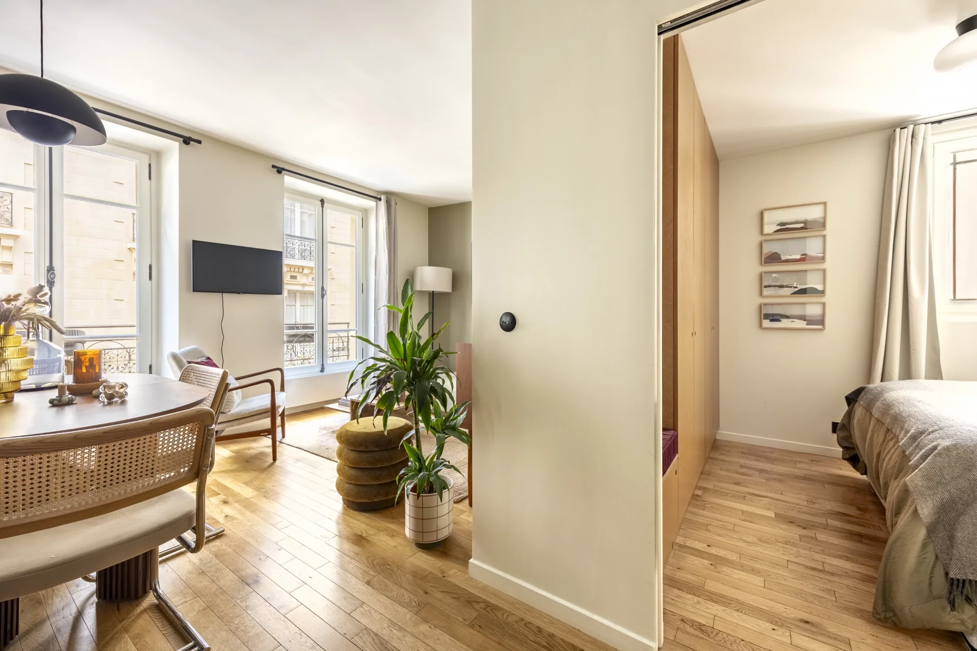 Idéalement situé dans une rue calme du Marais, a proximité immédiate de la rue de Turenne, dans un immeuble ancien bien tenu, au deuxième étage par escalier, un charmant appartement de 37,76m² loi Carrez. Au plan compact et bien pensé, il se compose d'un très joli séjour lumineux grâce à ses grandes fenêtres exposées à l'ouest, d'une cuisine ouverte aménagée et équipée, d'une chambre donnant sur cour avec rangements sur mesure et d'une salle de douche avec toilettes. Vous serez séduits par la qualité de sa rénovation et de ses nombreux rangements sur mesure, sa luminosité et son calme au cœur d'un quartier recherché.