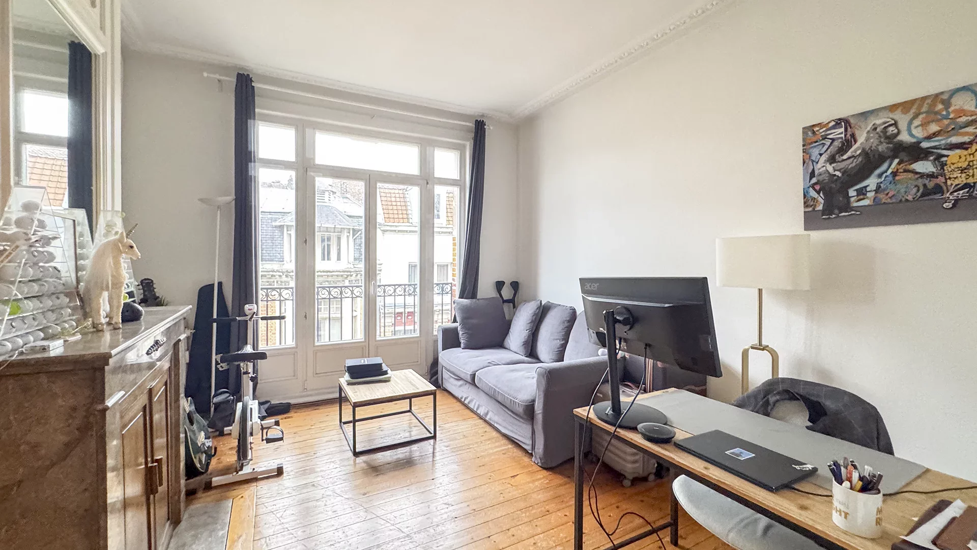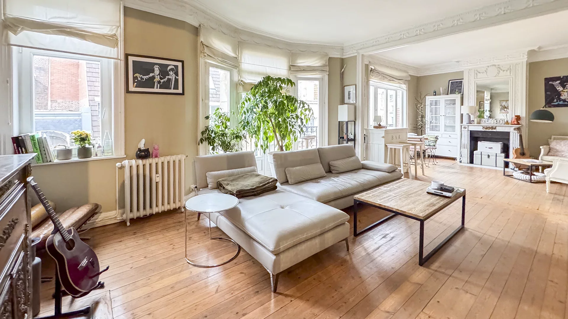 Situé entre la gare et l’Opéra de Lille, au cœur d’un immeuble bourgeois avec ascenseur à la parisienne, cet appartement de 140,84m² séduit par ses volumes et son cachet. Parquet, moulures et belle hauteur sous plafond créent une atmosphère élégante dès l’entrée. Le double séjour exposé ouest bénéficie d’une belle luminosité et offre un espace de réception agréable. La cuisine, spacieuse et conviviale, s’organise autour d’un îlot central idéal pour les moments partagés en famille ou entre amis. L’espace nuit comprend trois chambres, dont une avec bow-window, une suite avec dressing et salle de douche privative, ainsi qu’une troisième chambre pouvant accueillir un bureau ou une chambre d’amis. Une seconde salle de bains complète l’ensemble. Deux chambres de service, une cave et la possibilité d’acquérir un parking à proximité viennent parfaire ce bien rare, au pied des gares et du centre-ville de Lille.