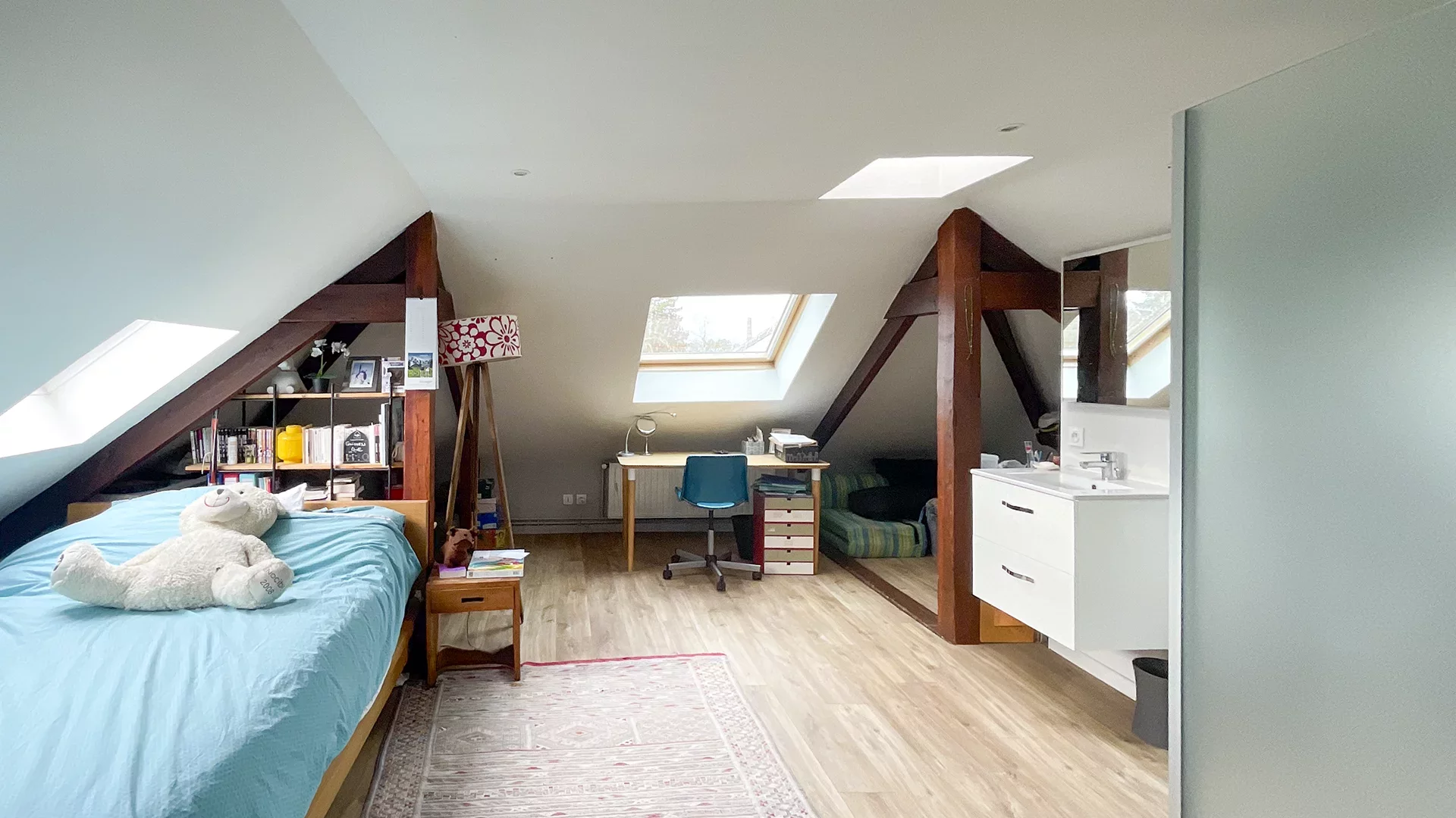 À l’étage, la maison dispose de trois chambres spacieuses ainsi que d’une salle de bain. Le second étage est entièrement dédié à l’espace parental, avec une chambre et sa salle de douche, garantissant intimité et confort.