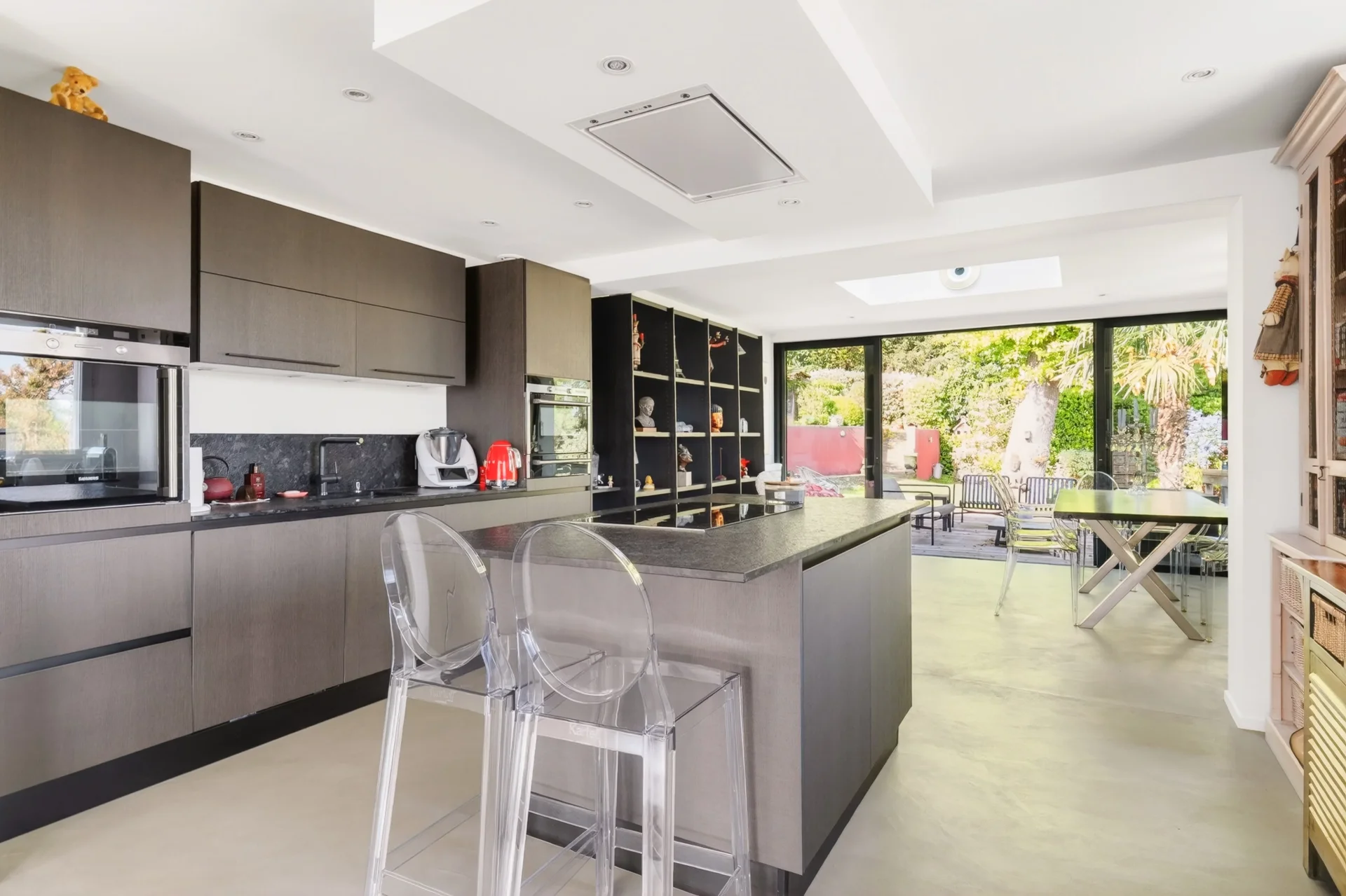 Dès l’entrée, la sensation d’ouverture est immédiate : un spectaculaire espace de réception de plus de 50m² avec cheminée, largement vitré, baigné de lumière naturelle, offre une atmosphère à la fois chaleureuse et résolument contemporaine. Les perspectives se prolongent de la cuisine vers une grande terrasse et son jardin, véritable écrin de verdure, sans vis-à-vis. Un spa vous invitent à la détente.