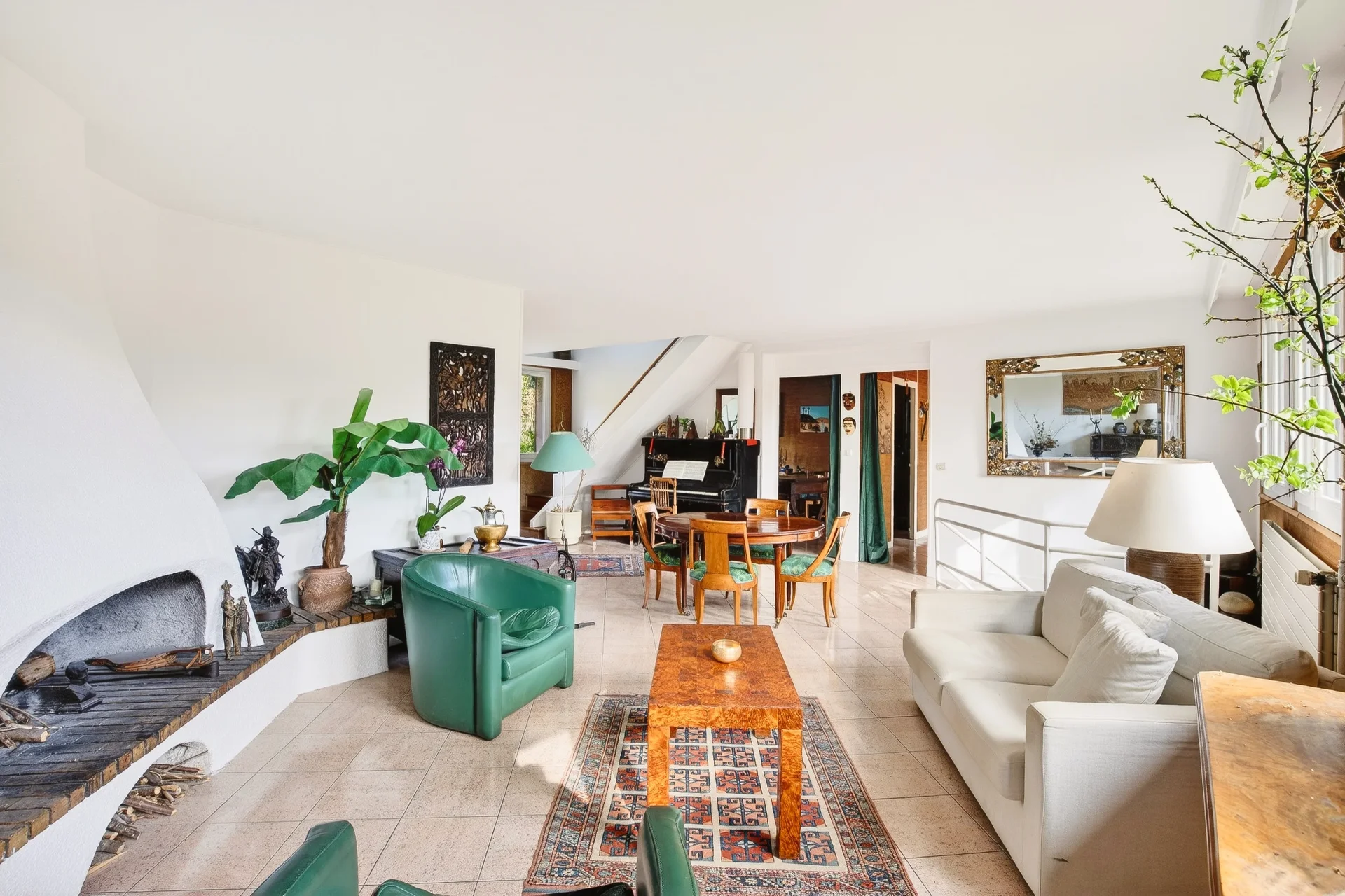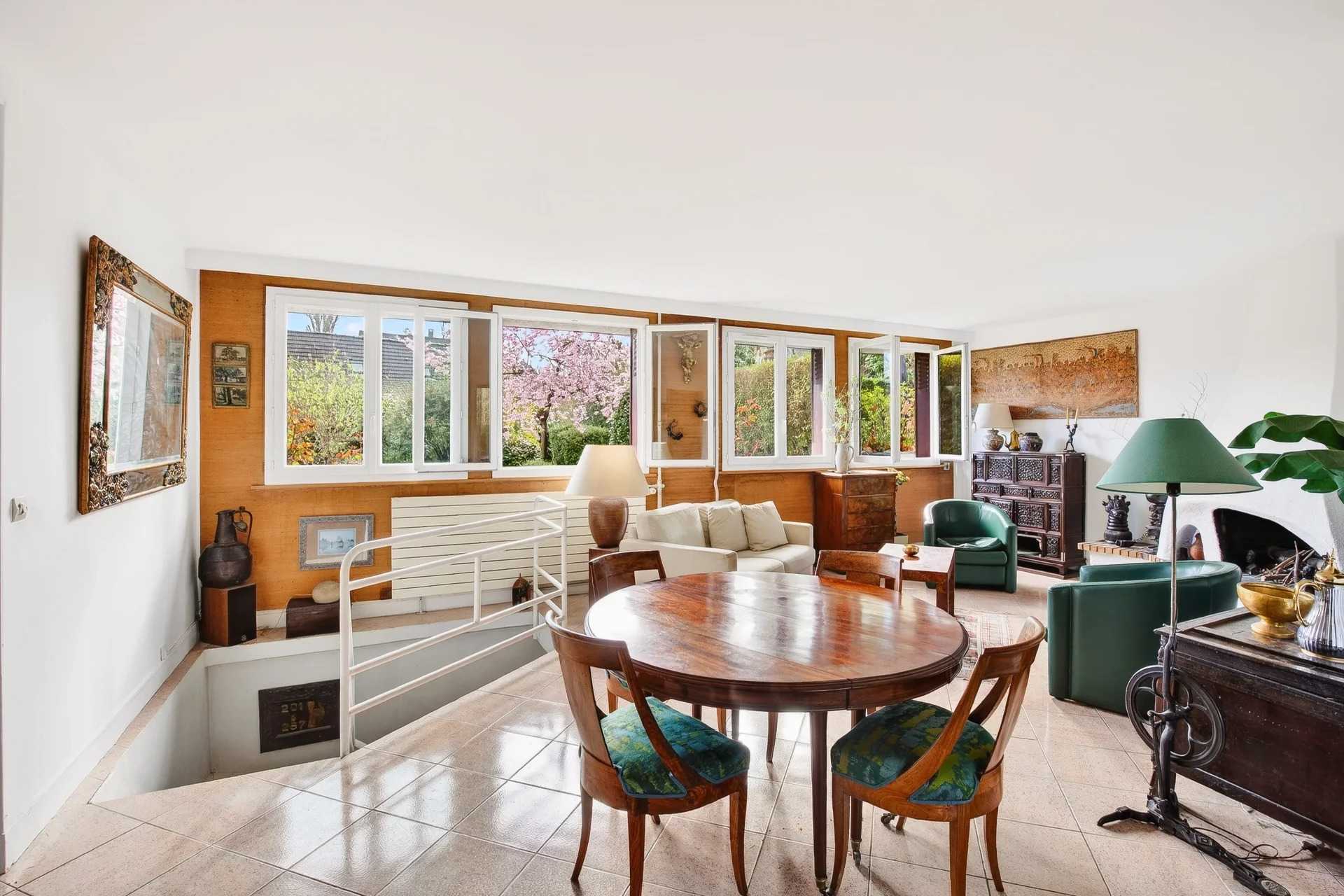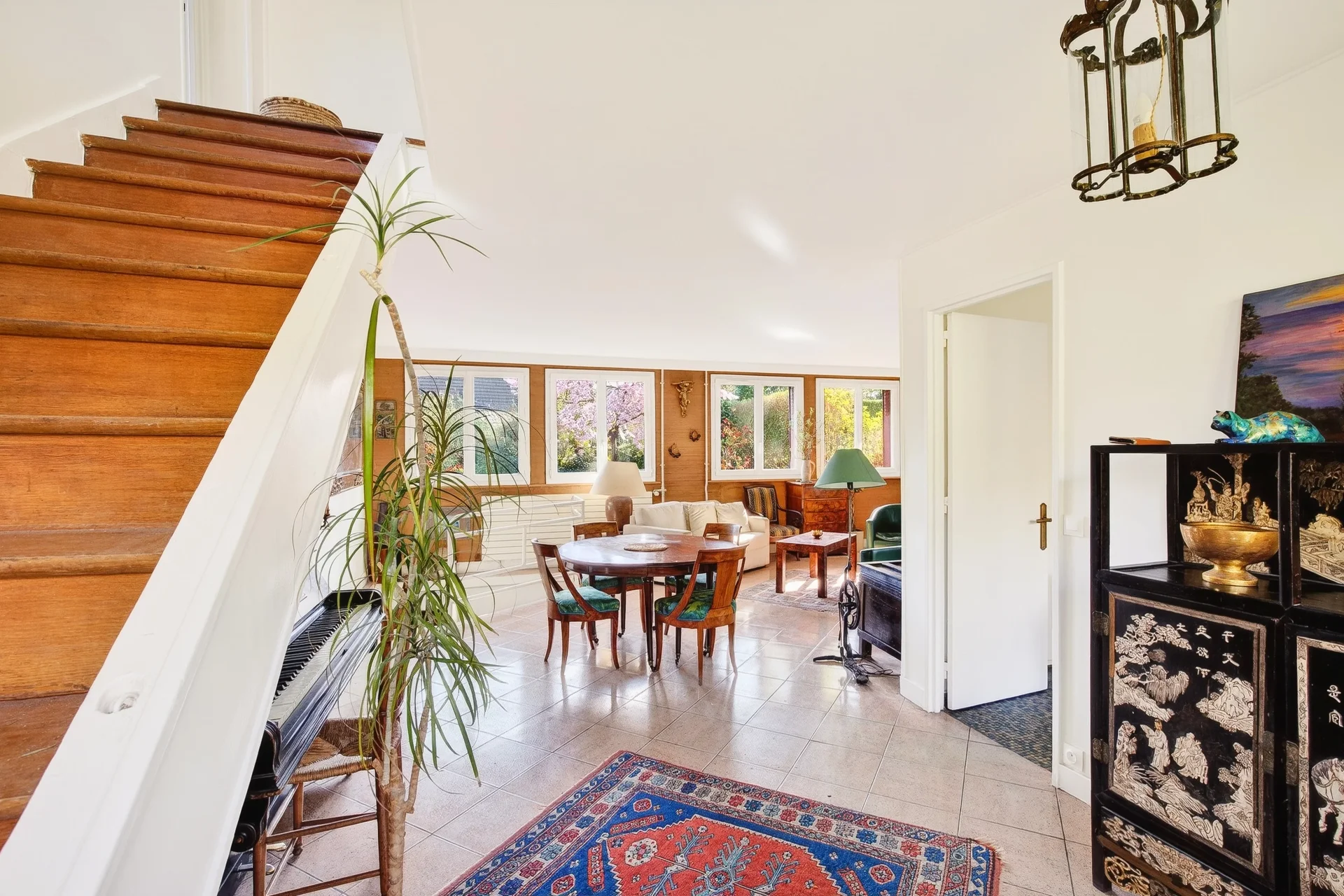 L’entrée dessert un spacieux séjour exposé est-ouest avec cheminée, ouvrant sur une terrasse et un jardin joliment arboré, sans vis à vis; un grand bureau, une cuisine indépendante (avec possibilité d’ouverture) ainsi que des toilettes invités.