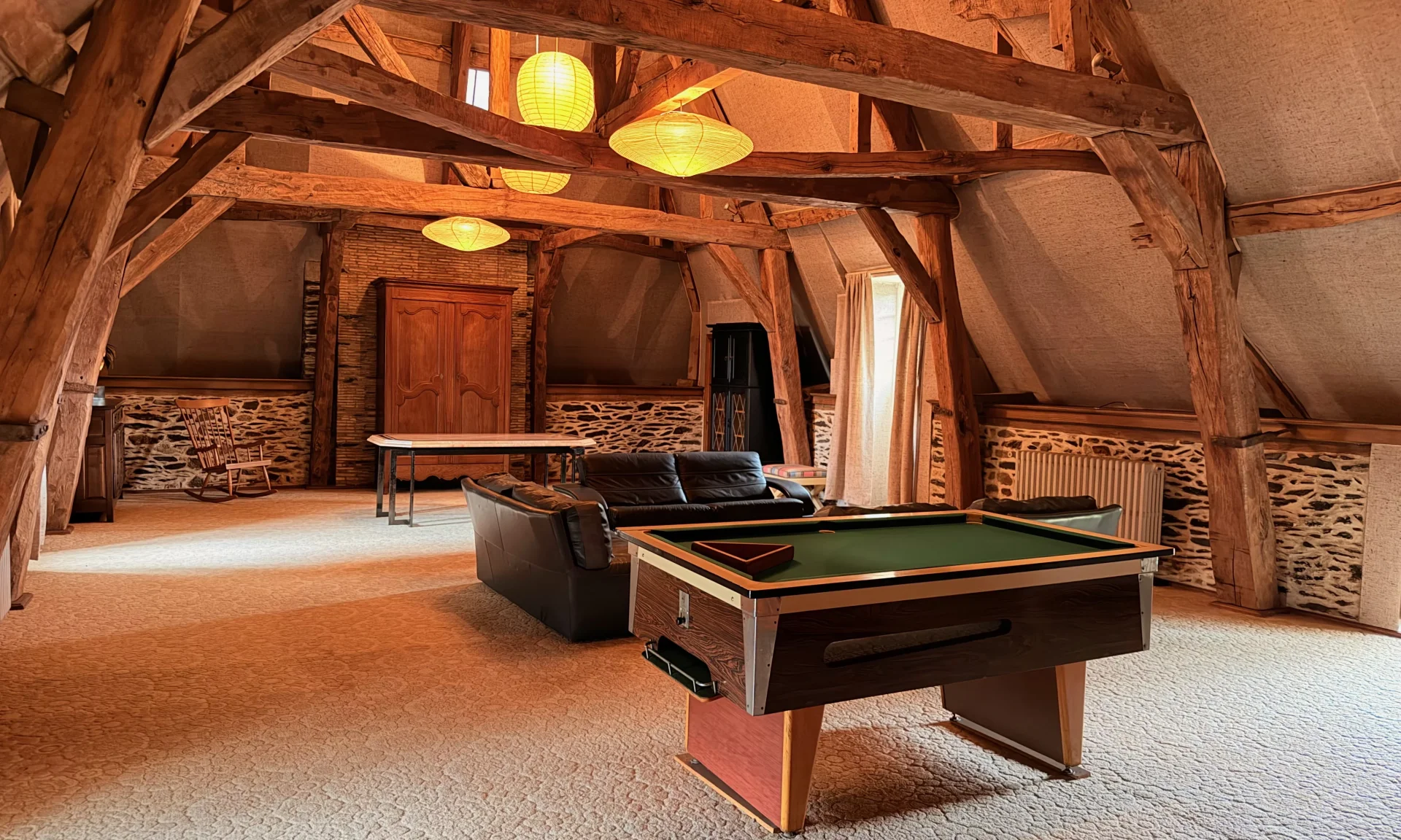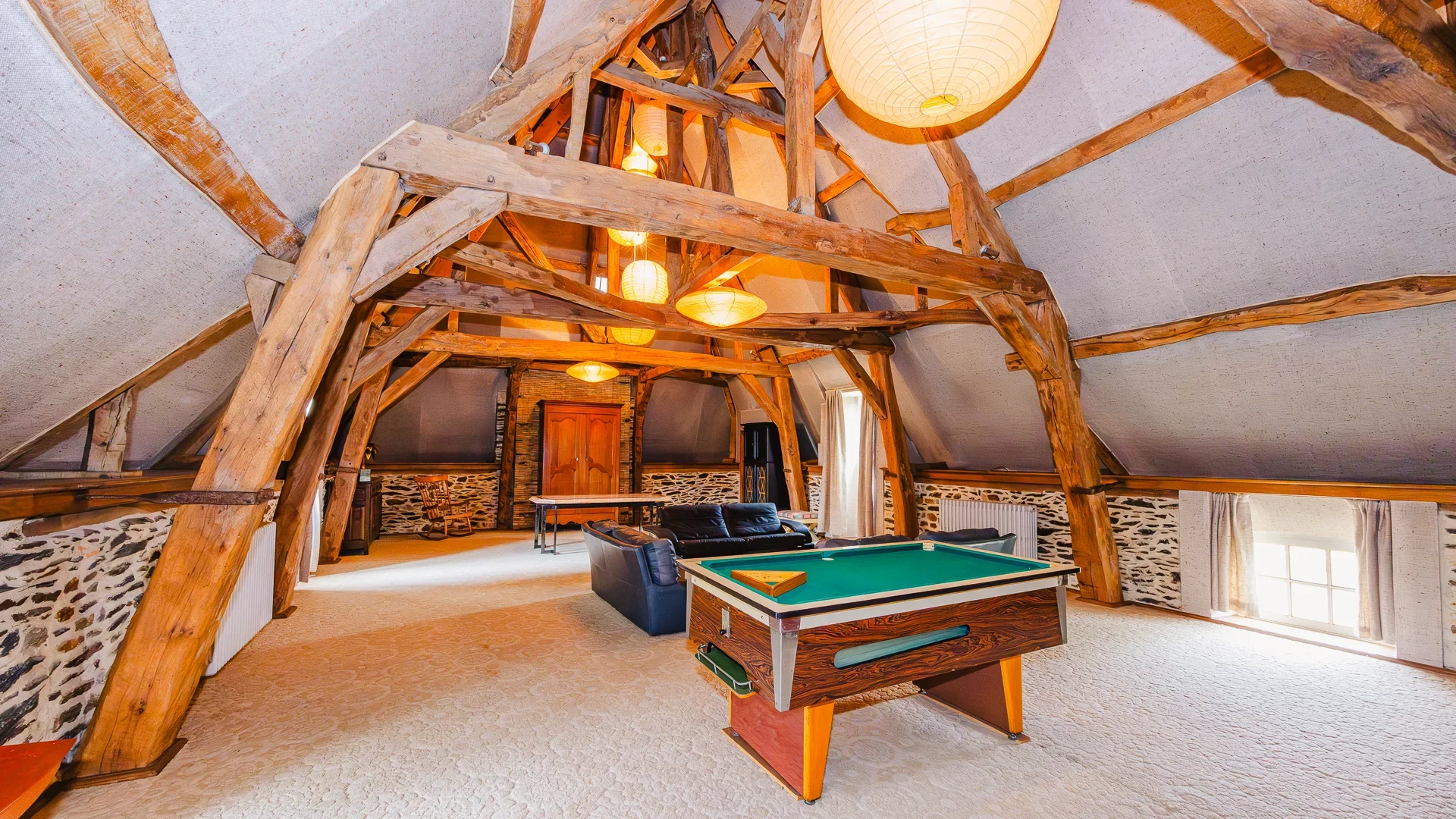 Les anciennes écuries en pierre, aujourd’hui réhabilitées, accueillent deux grands garages, un atelier, une buanderie avec grande laverie ainsi qu’une maison d’amis indépendante composée de deux chambres, d’une salle à manger et d’une cuisine. Un pigeonnier, un colombier aménagé en cave à vin de plus de 25m² et un ancien fournil complètent l’ensemble et renforcent le caractère historique du domaine.