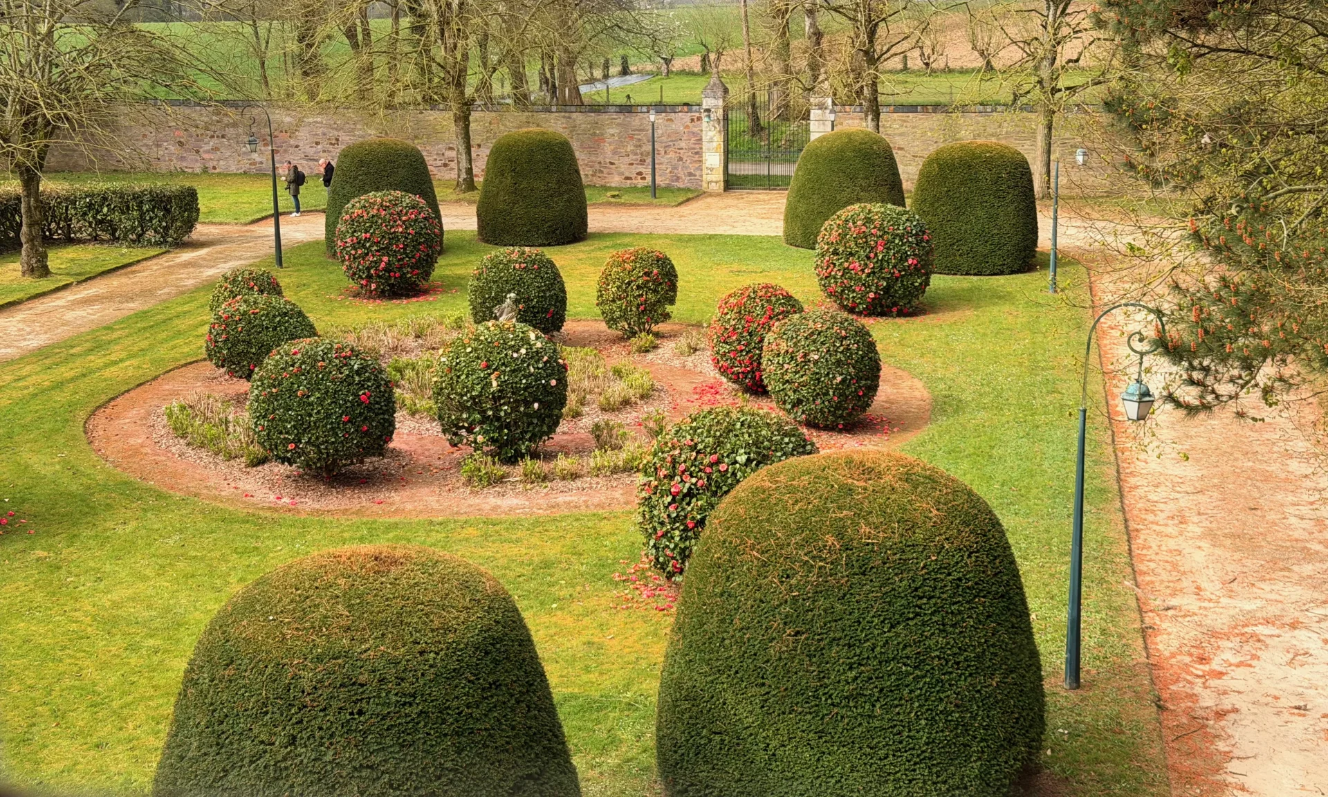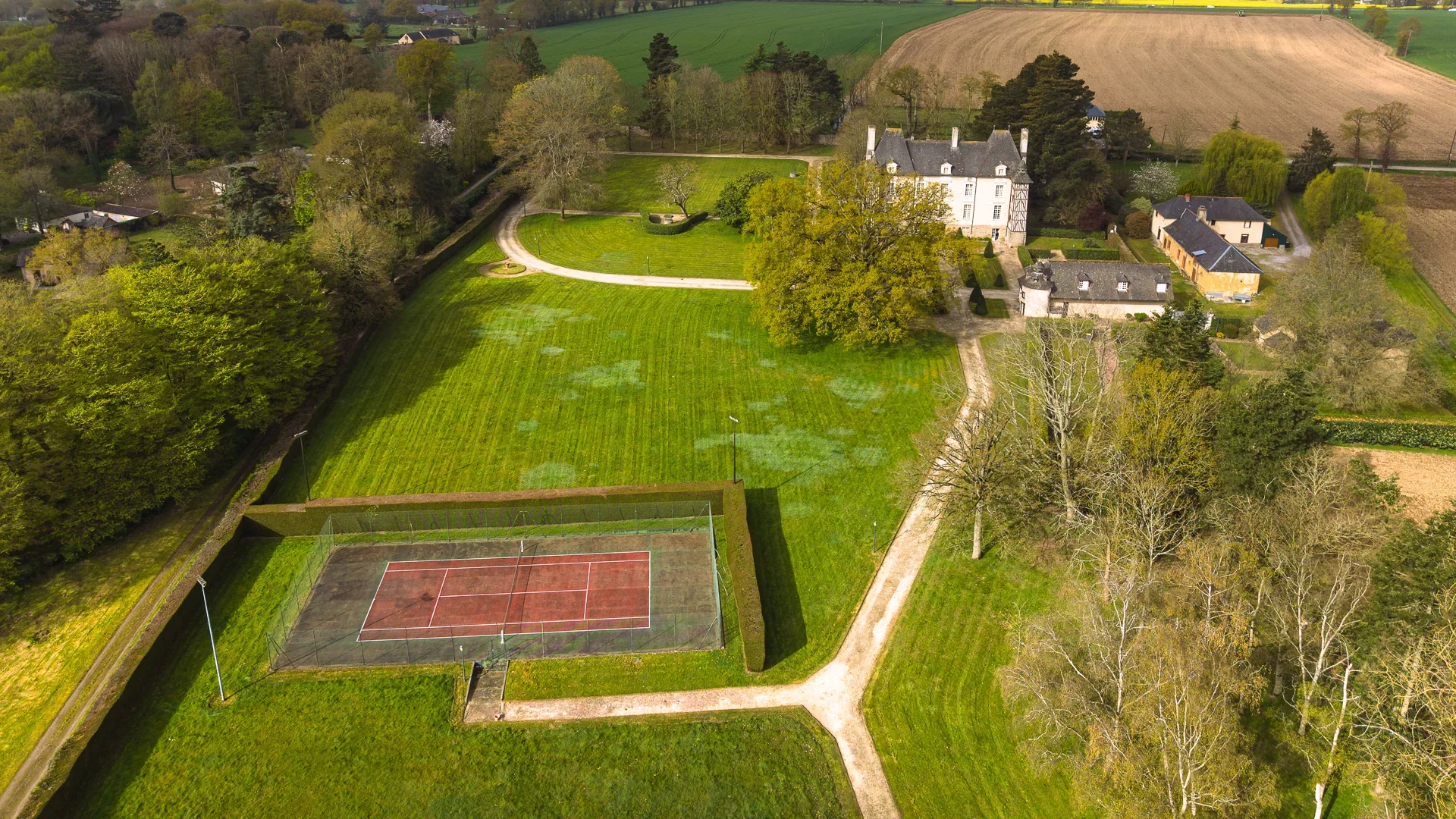 La propriété s’ouvre sur un parc paysager d’environ 3,4 hectares comprenant une pièce d’eau, un petit bois, une roseraie et un remarquable ginkgo, véritable élément signature du jardin. Un court de tennis, discrètement protégé par des haies, et un puits complètent les aménagements extérieurs.