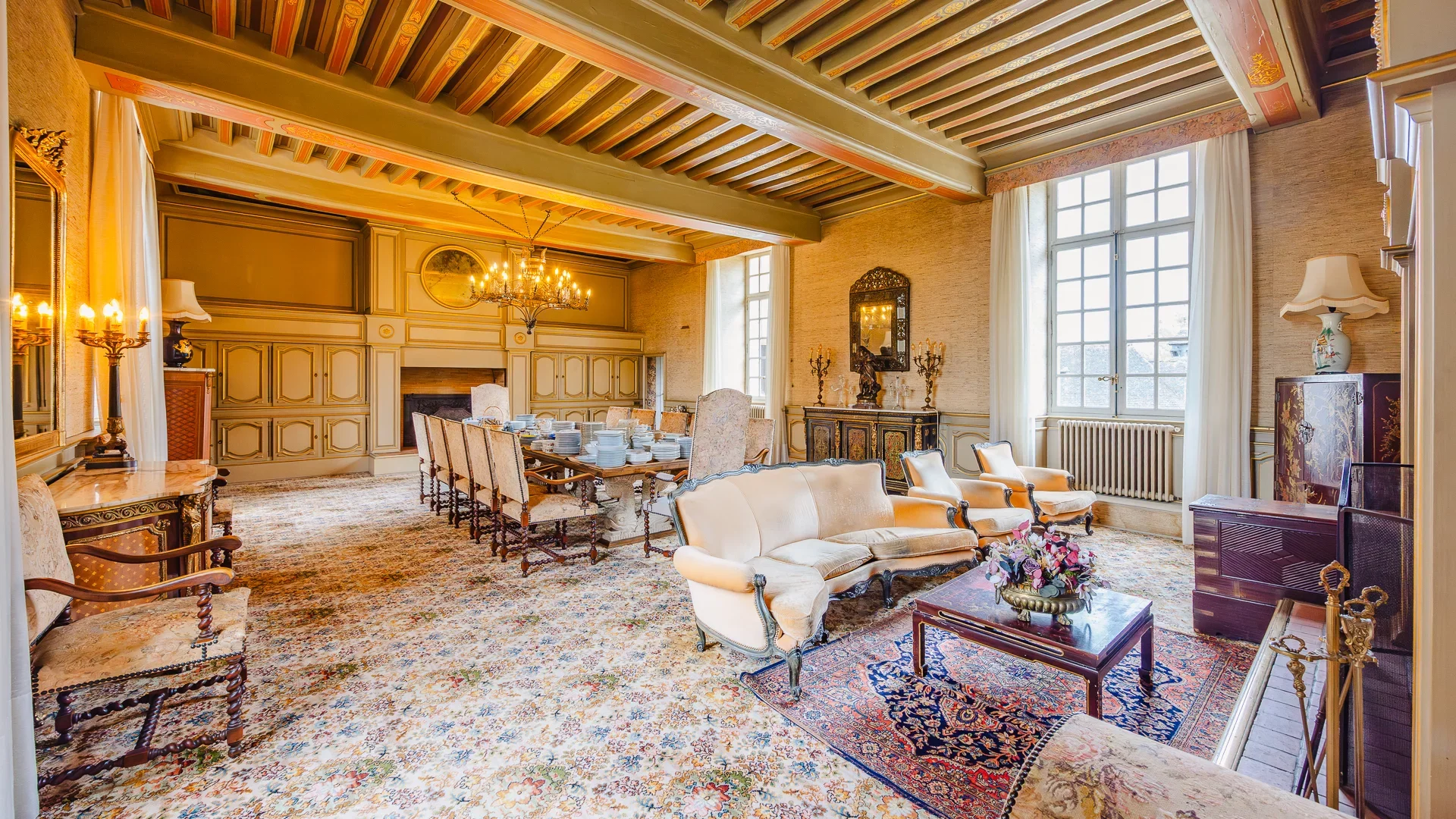 Le château développe plus de 663m² habitables, hors dépendances. Les volumes intérieurs conjuguent générosité et raffinement avec une superbe suite parentale d’environ 50m², cinq chambres supplémentaires dont la plupart disposent de leur salle de bains privative, ainsi que de vastes salles de réception atteignant près de 80m², idéales pour recevoir ou organiser des événements privés.