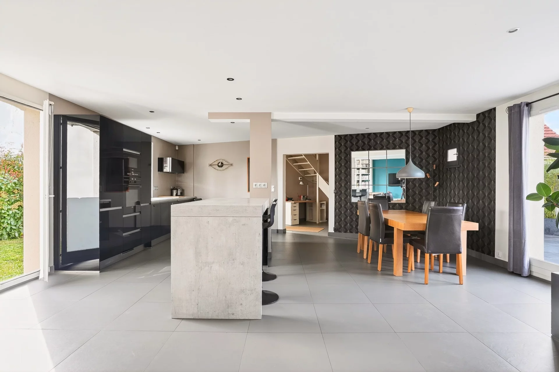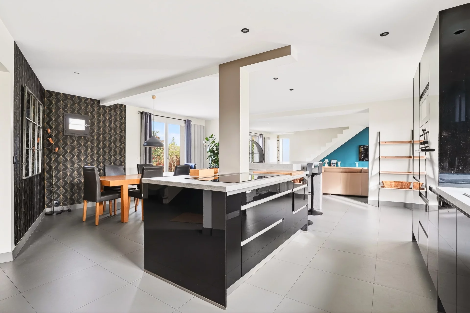 Dès l’entrée, vous découvrirez une vaste pièce de réception d’environ 80m², véritable cœur de la maison. Baignée de lumière traversante, elle se