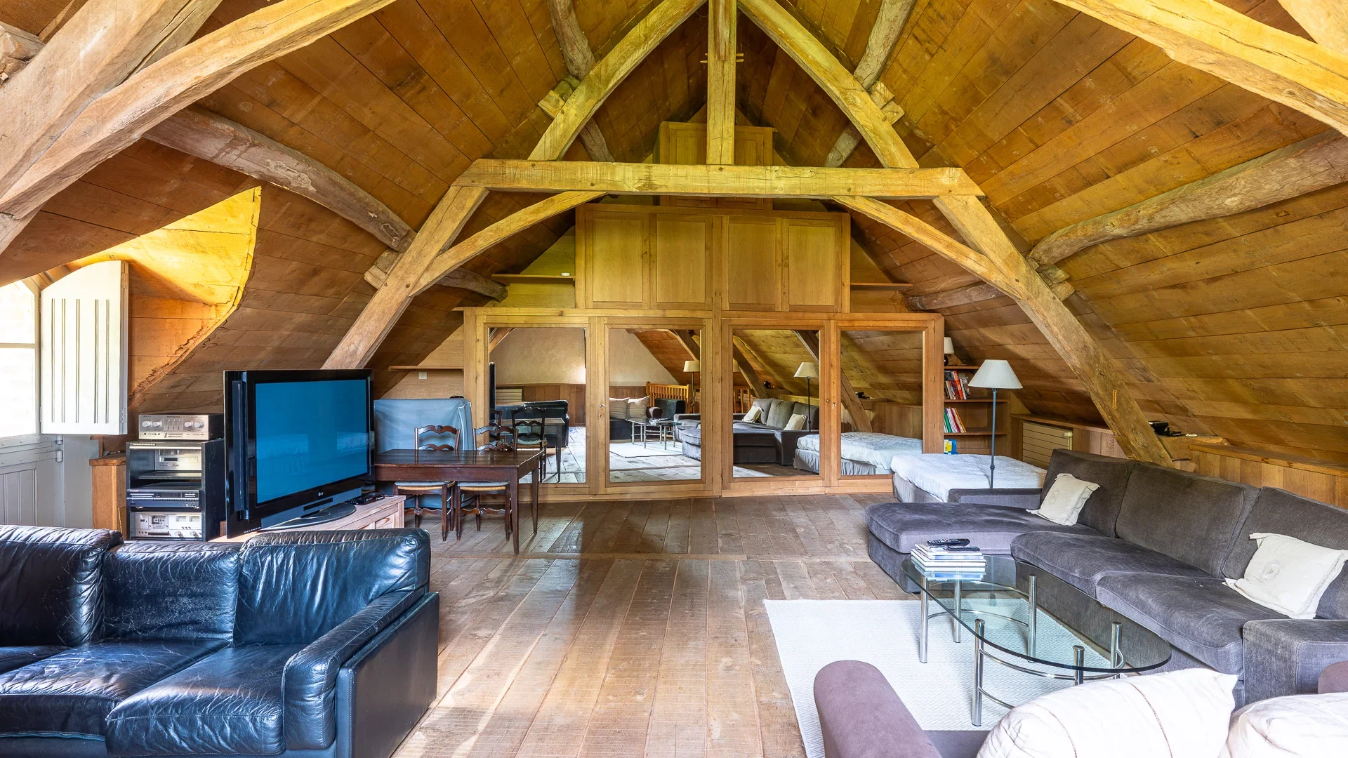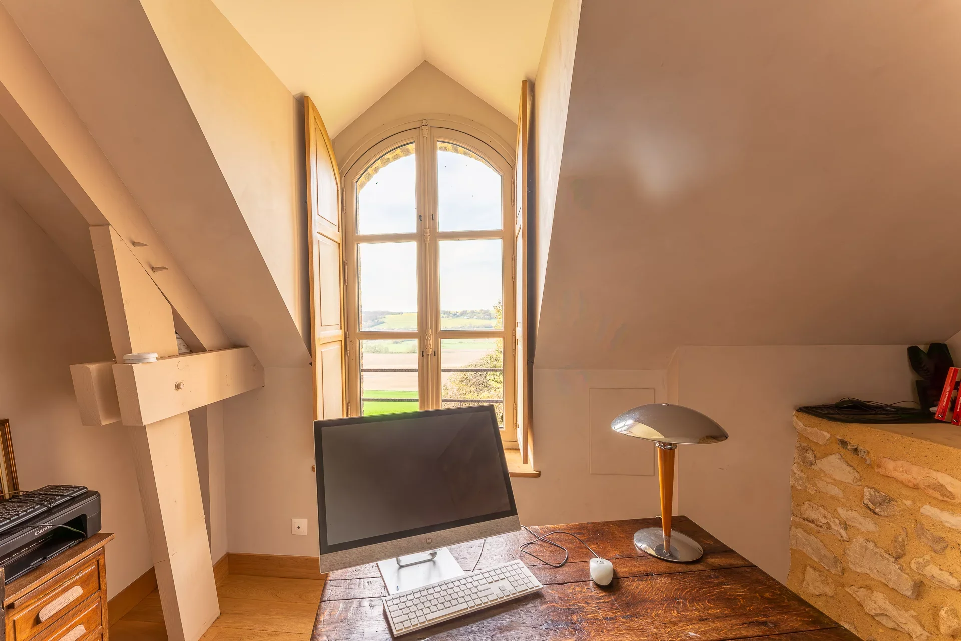 Le premier étage accueille une grande chambre avec salle de bains complète et deux chambres dont une dans la tour elle-même, pendant que l'autre parti du bâtiment héberge trois chambres, un bureau et une grande pièce à vivre. Toujours accessible depuis ce premier étage, un grand grenier d'environ 60m² complète l'espace.
