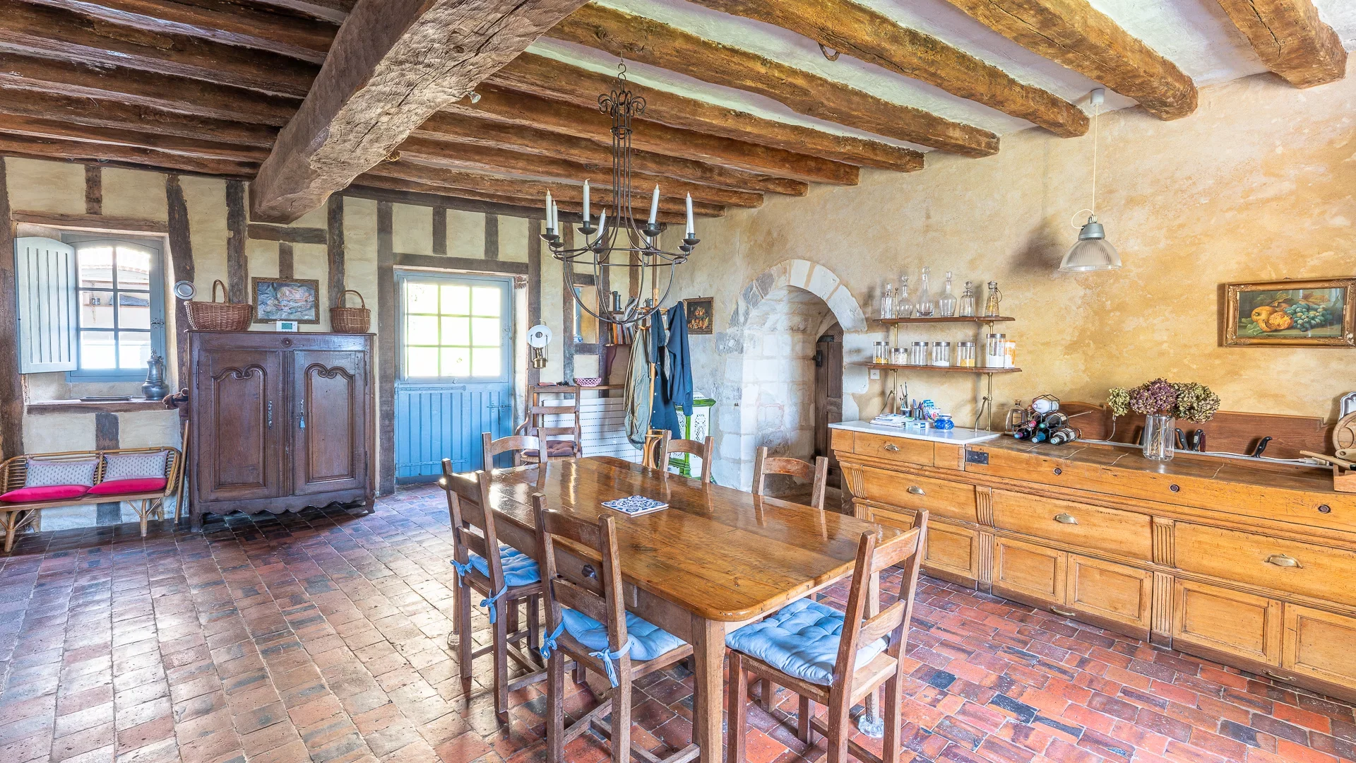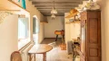 La partie la plus ancienne du rez-de-chaussée abrite une grande pièce de réception et une petite pièce pouvant faire office de chambre ou de bureau, tandis que la partie plus récente comprend une entrée, une grande cuisine dînatoire, deux salles de bains dont une avec hammam et sauna, ainsi qu'une lingerie.