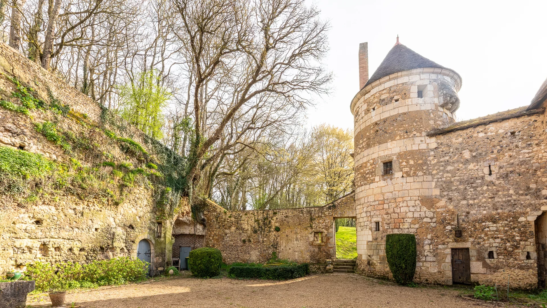 La Chapelle, dépendance d'environ 300m² répartie sur 3 niveaux, offre quant à elle de nombreuses possibilités d'aménagement. Dans la cour, des habitations troglodytes abritent des caves voûtées et un four à pain, tandis qu'un verger, deux mottes féodales et des bois agrémentent le terrain et prolonge le charme de l'ensemble.
