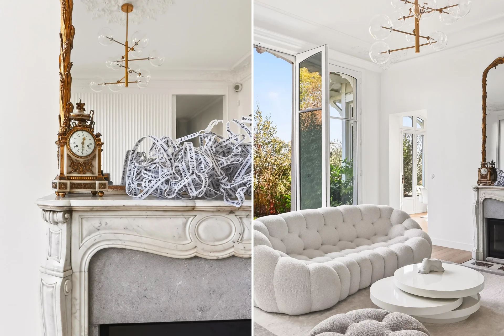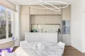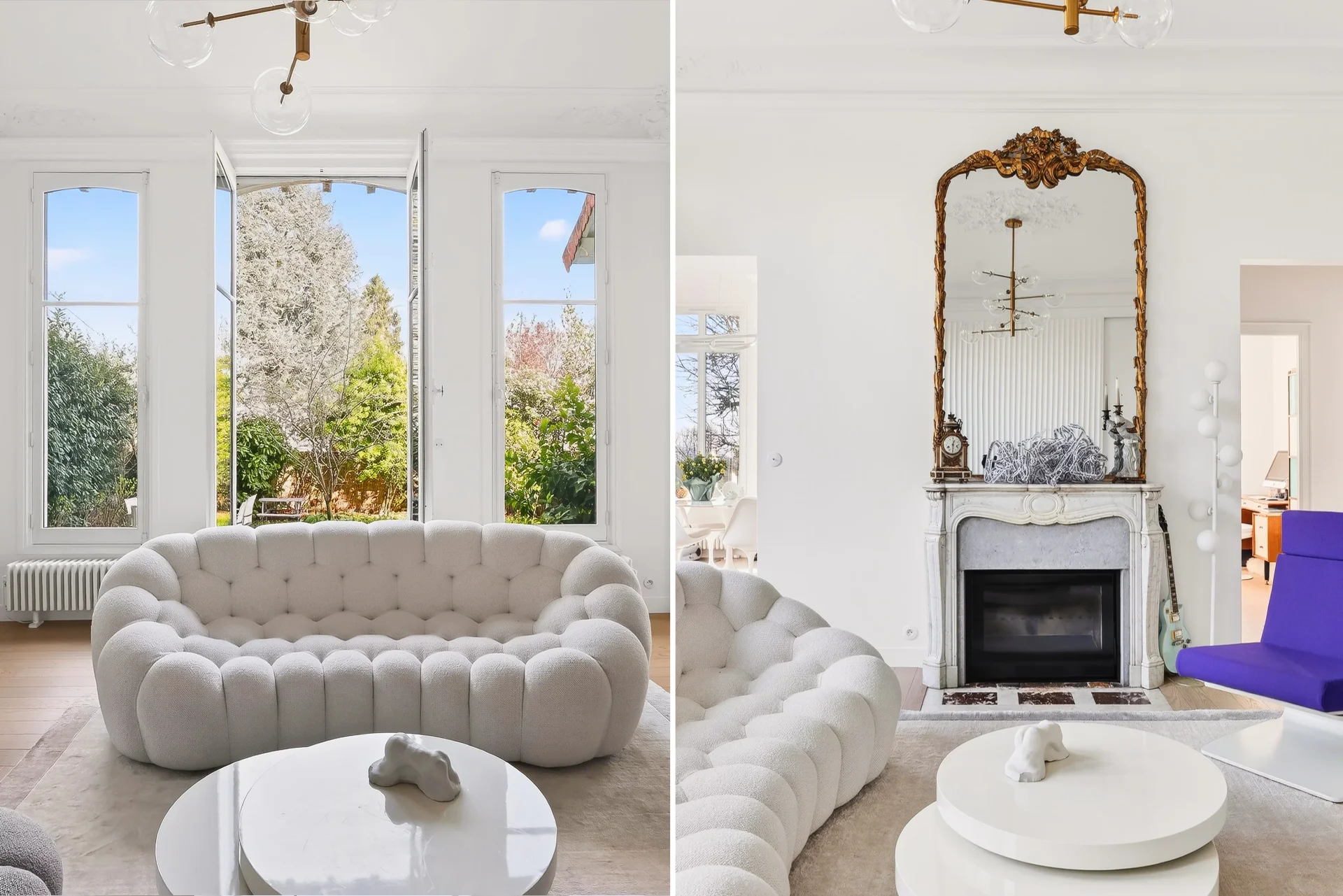 Dès l’entrée, les volumes impressionnent : une généreuse hauteur sous plafond, des perspectives élégantes et une lumière naturelle omniprésente. Le séjour, pièce maîtresse de l’appartement, séduit par son atmosphère chaleureuse sublimée par une cheminée, et s’ouvre en toute fluidité sur un somptueux jardin paysagé privatif de 150 m² — un véritable havre de paix offrant une vue dégagée jusqu’à la Tour Eiffel.