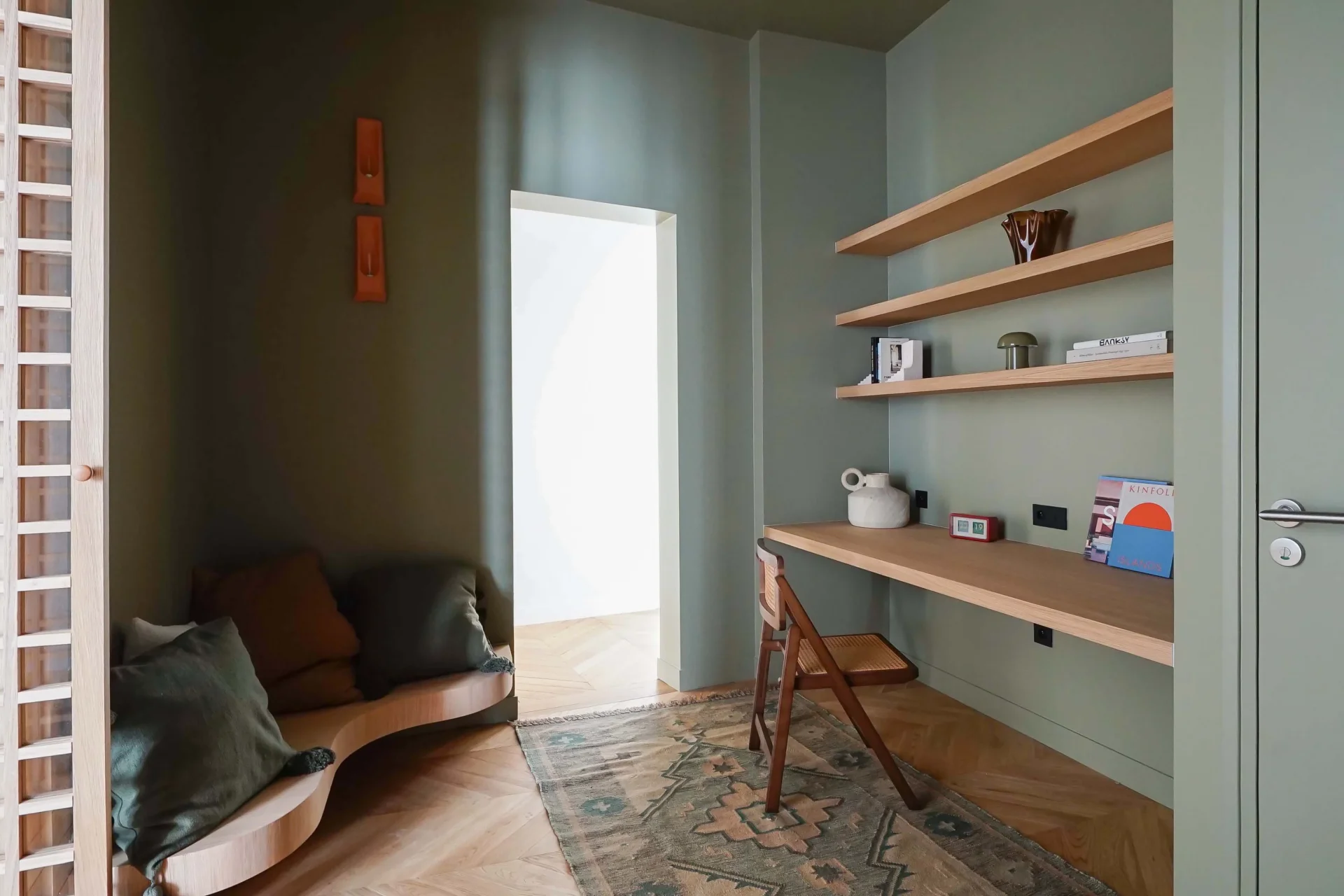L'accès aux chambres se fait par une pièce de circulation aménagée en bureau avec banquette.