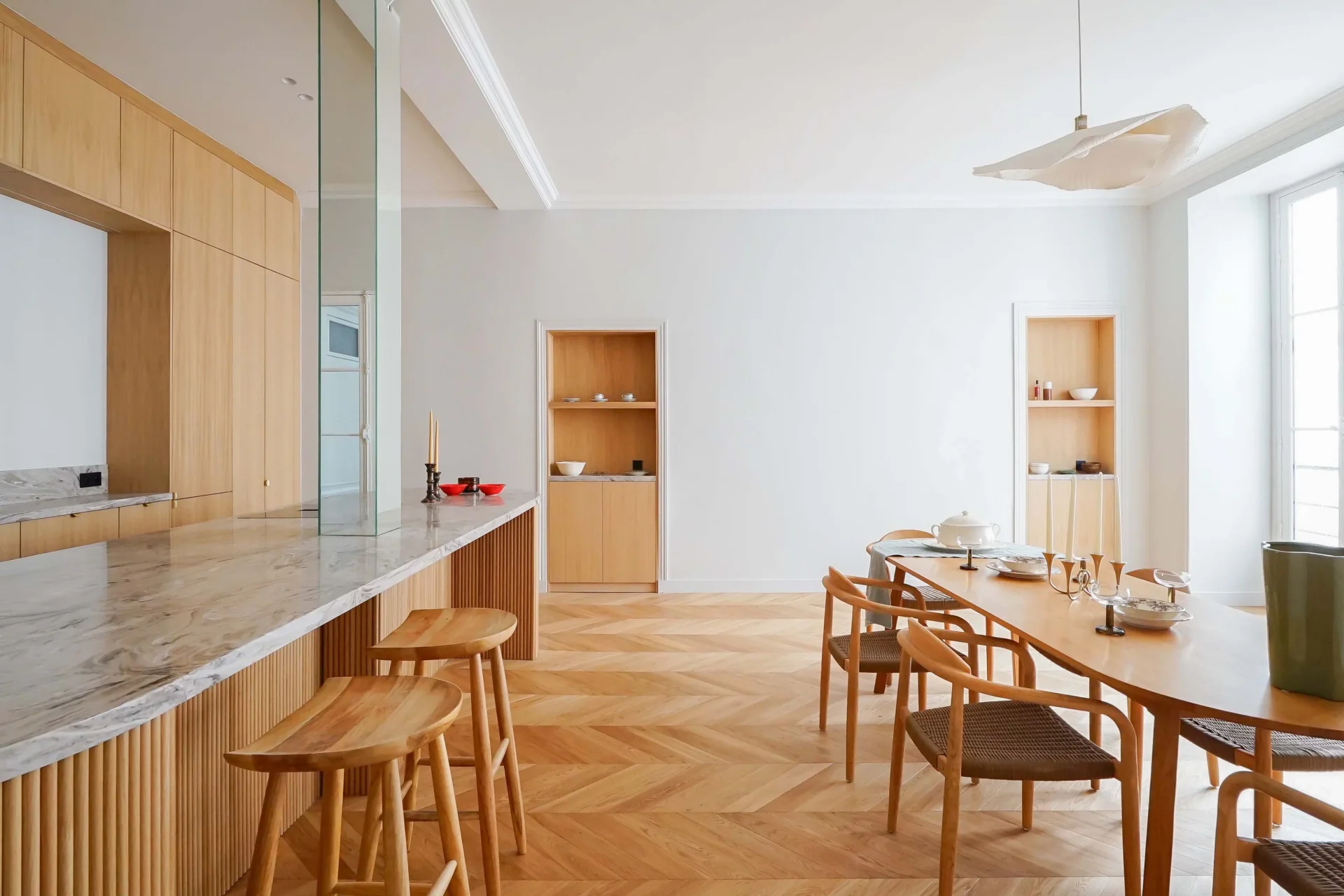 Le séjour de 35m² s'ouvre sur une salle à manger de 27 m², formant un espace de de réception de plus de 60 m² baigné de lumière ainsi qu'une sublime cuisine de 23 m², entièrement aménagée et équipée, conçue pour cuisiner et recevoir en même temps.