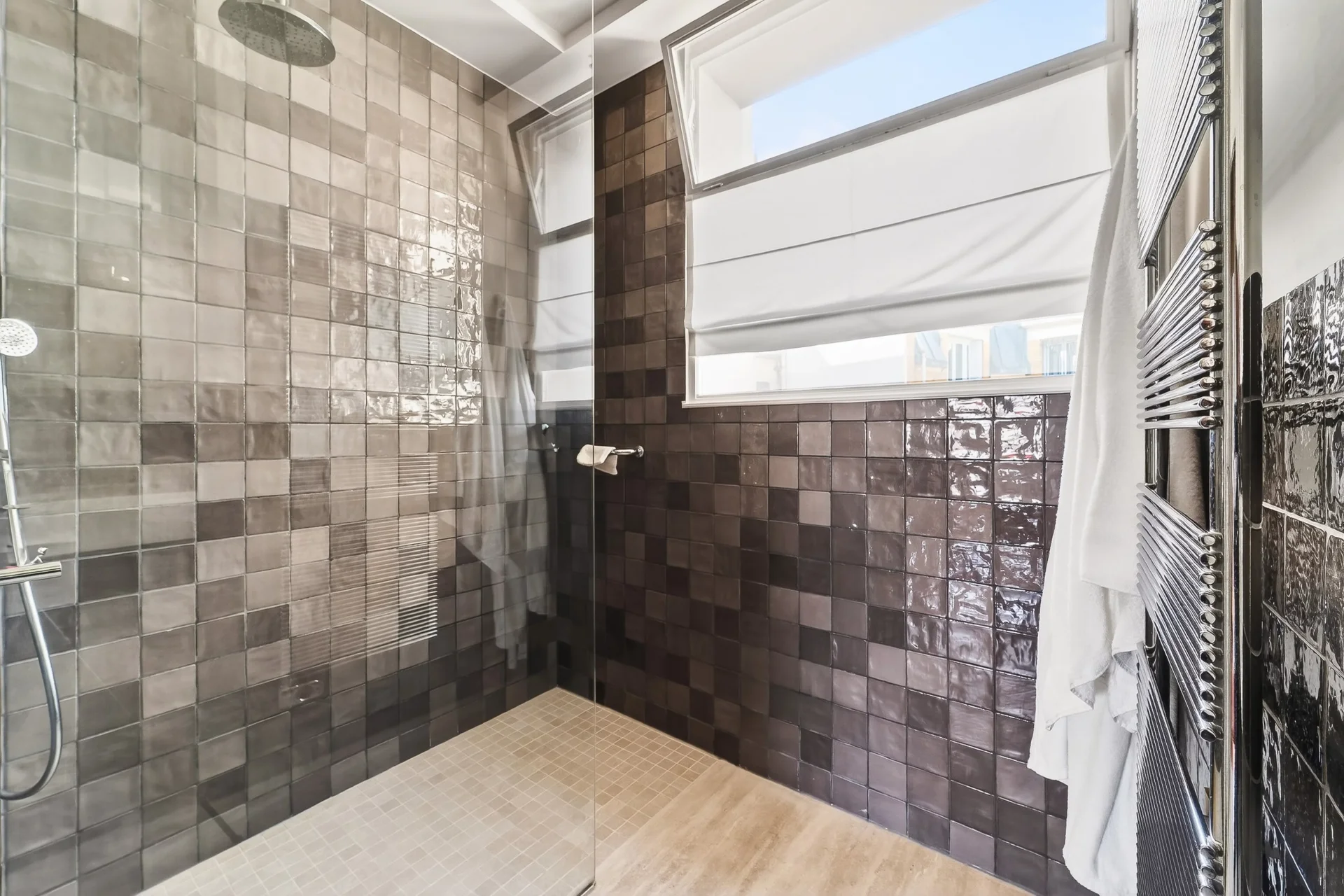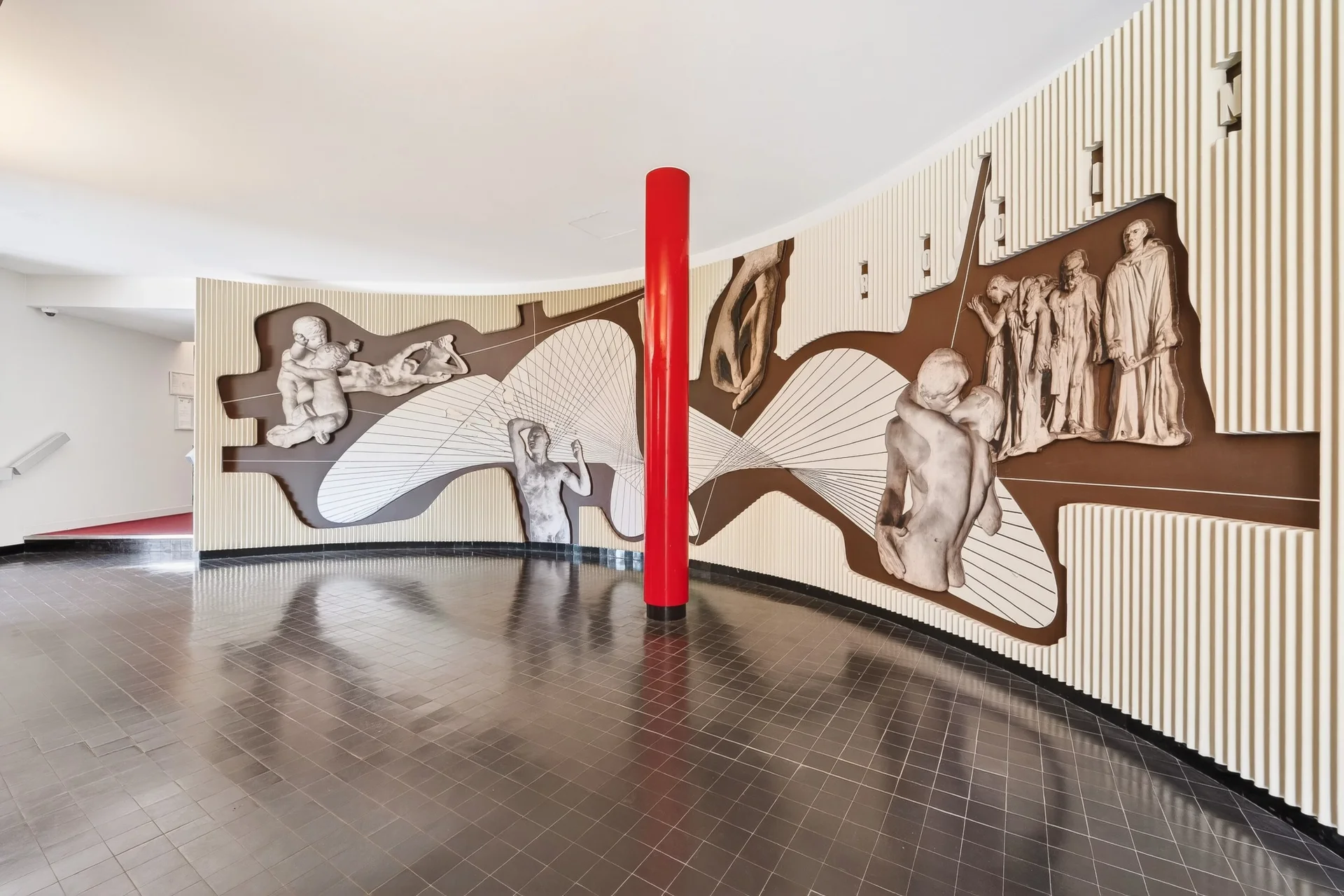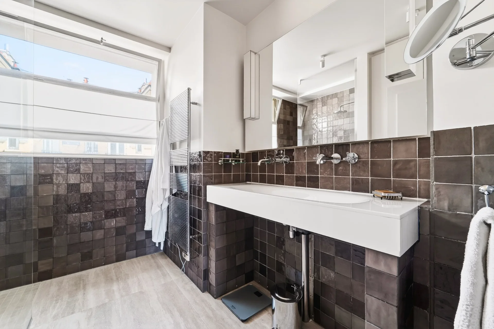 Au septième étage par ascenseur d’un immeuble des années 50 construit par le célèbre architecte moderniste Jean Ginsberg, seul sur le palier, superbe appartement entièrement rénové de 142,11m² loi Carrez.